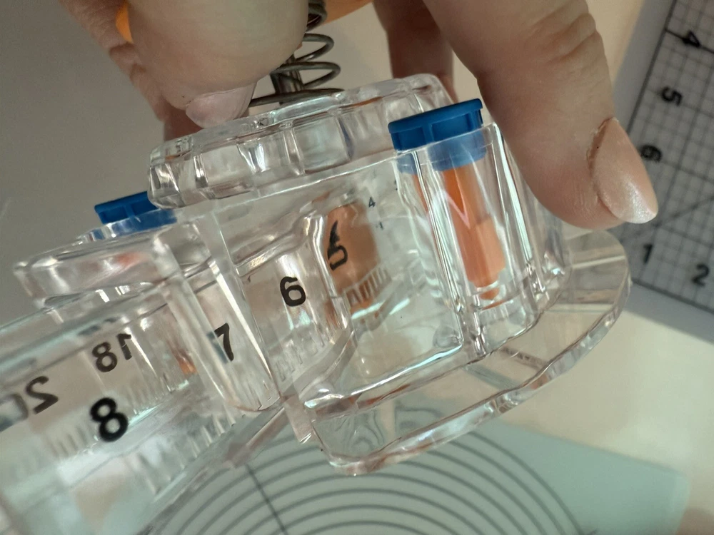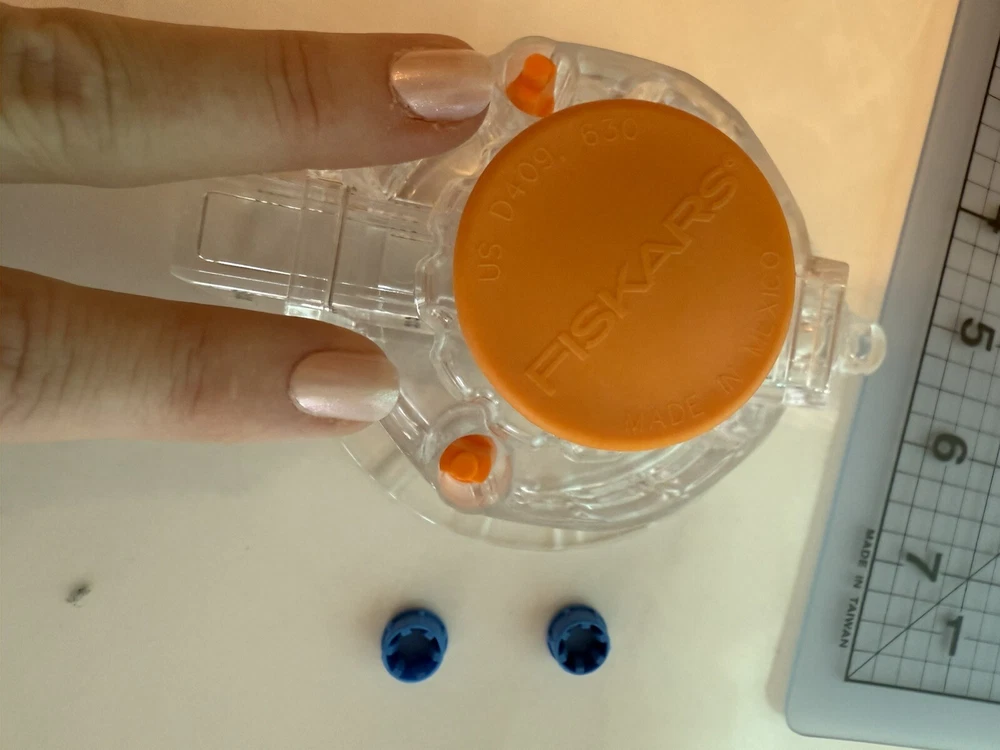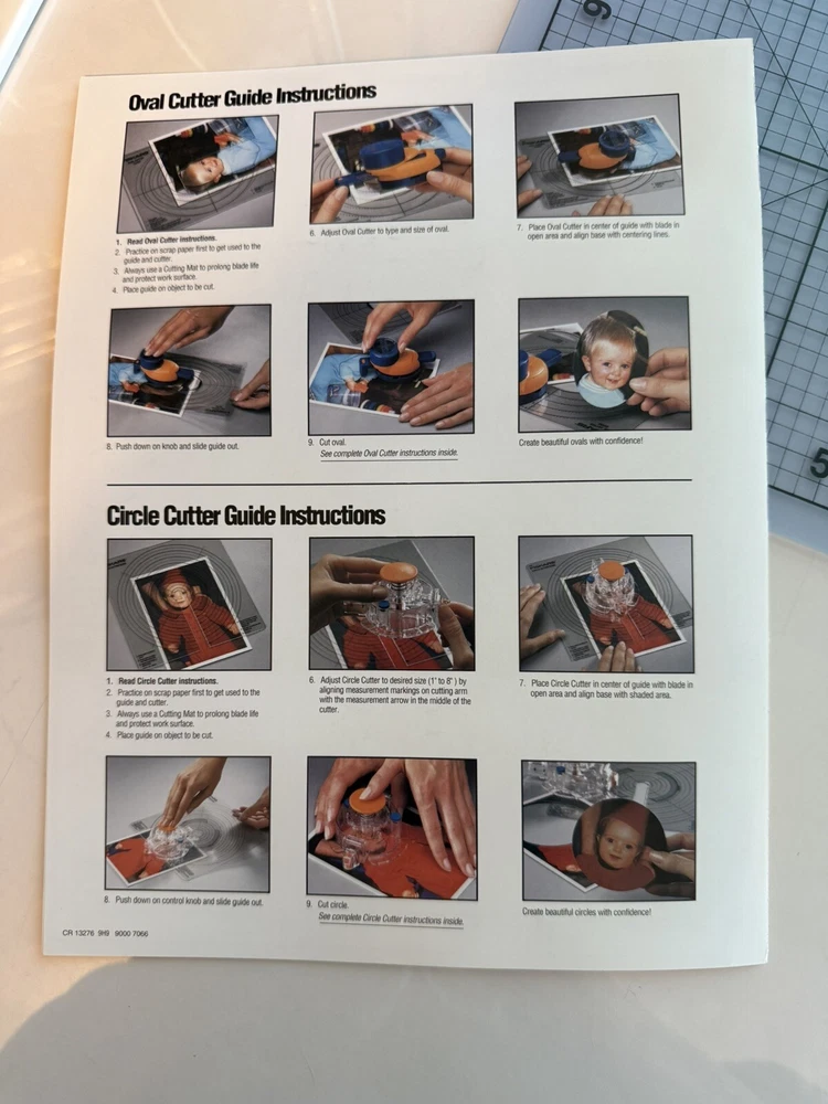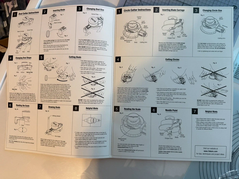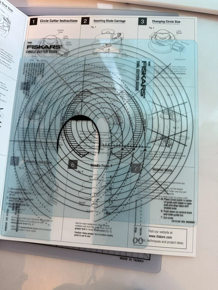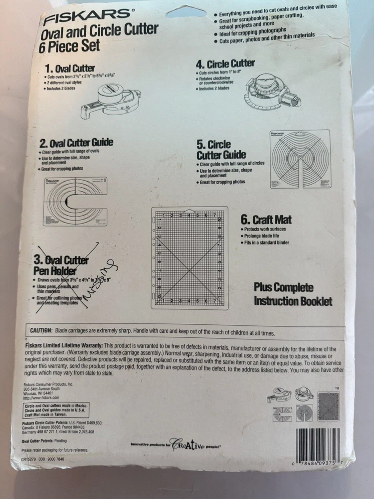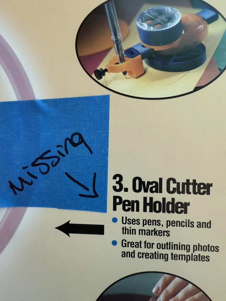 5 of 6 pieces included. Missing Pen Holder. I am unsure if it is used as I bought it from the store this way. I have taped it shut again after taking photos and marking missing item. 3 blades are included for each cutter, they are stored in the cutters themselves. Please see photos. Plastic cutter guides are inside instructions. Cutting mat is behind the instructions.