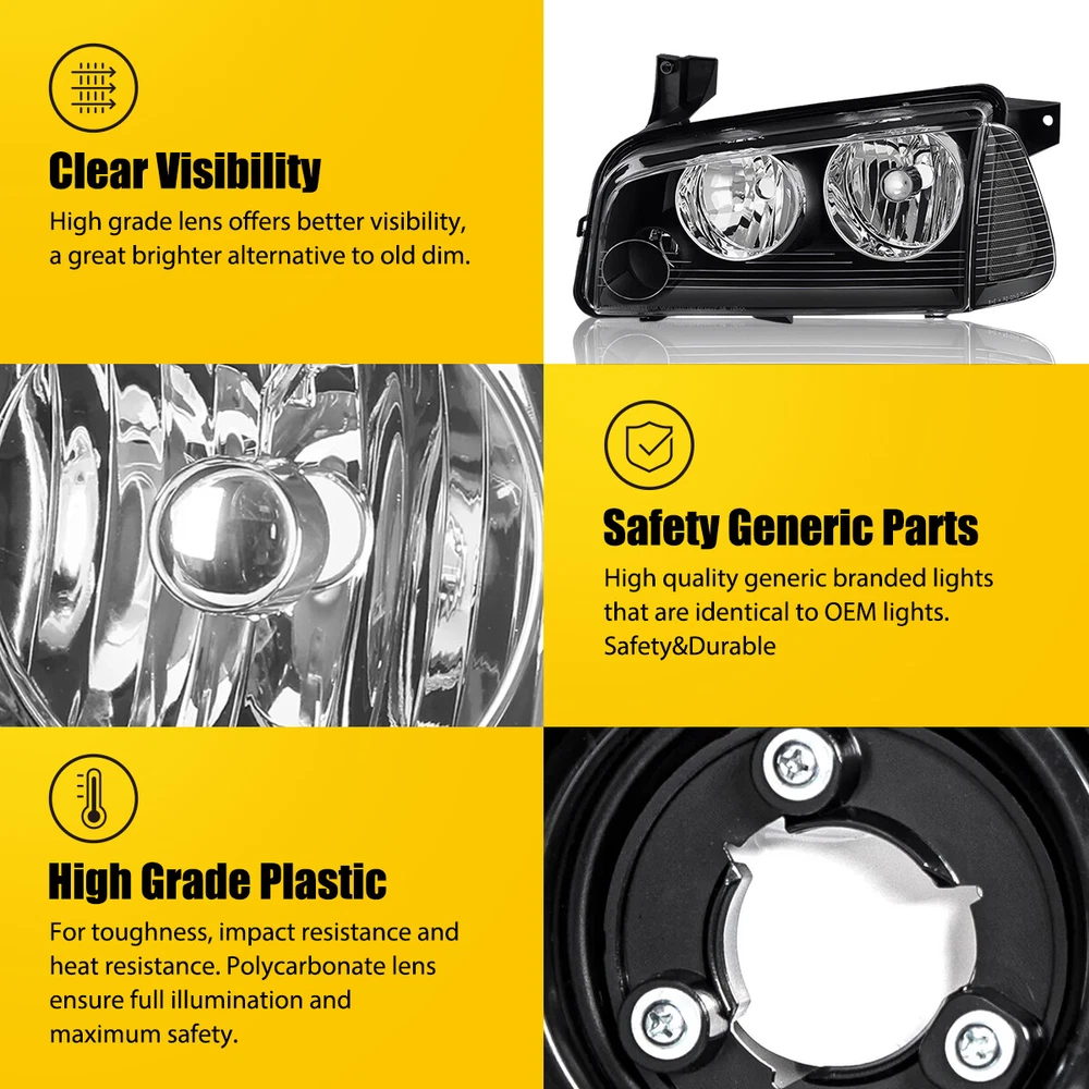 Fit for: 2006-2010 Dodge Charger (Not compatible with 2008-2010 Models W/ Factory Xenon HID Headlights ) Specifications: OE number: 4806164AG 4806165AG 4806165AF 4806164AF CH2502163 CH2502181 CH2503163 CH2503181 Material: ABS+PC (ABS Plastic Housing/Polycarbonate lens) Appearance color: 1.Housing Color: Black 2.Lens Color:Clear 3.Reflector Color:White Note: Projector ×(Not Include) DRL × (Not include) Bulb × (Not include) Features: *Easy to install: Fit 2006-2010 Dodge Charger Black Headlights Corner Signal Lamps Assembly 06-10 Fit for: 2006-2010 Dodge Charger (Not compatible with 2008-2010 Models W/ Factory Xenon HID Headlights ) Specifications: OE number: 4806164AG 4806165AG 4806165AF 4806164AF CH2502163 CH2502181 CH2503163 CH2503181 Material: ABS+PC (ABS Plastic Housing/Polycarbonate lens) Appearance color: 1.Housing Color: Black 2.Lens Color:Clear 3.Reflector Color:White Note: Projector ×(Not Include) DRL × (Not include) Bulb × (Not include) Features: *Easy to install: Direct replacement, drilling and cutting are not required. *Superior quality: Made of ABS and PC materials with toughness and heat resistance functions to ensure its long service life and durability. *Angle adjustment: Equipped with a headlamp Angle adjustment knob, you can adjust the best Angle of view through the knob. *Suggestion: 1.Please confirm the OE number before purchasing!!! 2.Professional installation is required!!! Packaging include: Headlights*2(Left+Right) Item Specifics Brand AUXITO Lighting Technology Halogen Type Headlight Assembly Features Reflector Housing, SAE-Certified, Sealed Assembly Housing Color Black Placement on Vehicle Front Left,Right Light Color No Bulb Lens Color Clear Reflector Color White Manufacturer Part Number DGCG06.03 33 Color Temperature \ Voltage 12 V Mounting Style Screws Vintage Part Yes Performance Part Yes Manufacturer Warranty 5 Years Universal Fitment No Number of Bulbs 0 Finish Smooth Model For 2006-2010 Dodge Charger OE/OEM Part Number 4806164AG 4806165AG 4806165AF 4806164AF CH2503163 CH2503181 Quantity 2 Headlight assembly Packaging include Left & Right Side Headlights Assembly Bulbs Included Not Included Bulb Shape Code Please Use Stock Bulbs Include Projector Not Included Include DRL Not Included Fitment Type Direct Replacement Assembly Type Composite Type Headlight Assembly Mounting Hardware Included No Certifications DOT, SAE Dust and Moisture Protection Yes Waterproof Yes Ballast Included No Applicable Regions US Items Included Headlight Assembly Bulb Shape Code Just like the original Wattage \ FAQ ♥ If you have a decoding problem or any other problems, please contact us first, we will help you with it. We will reply you within 24 hours in working days. I'm a new seller, thanks a lot for your trust and convince! I will serve you with all my heart. ♥ Q1: Will this bulb fit my vehicle? A: We can match almost any vehicle to one of our bulb sizes. eBay only lets us include some vehicle fitments per listing, but if your vehicle does not show up on the compatibility table at the top of our listings, welcome you to contact us for free consulation before purchasing a product. Q2: My item has not arrived, what's taking so long? A: Sometimes items take longer than expected, especially if it’s going far or to rural area. Check with your post office to see if your item has been held up. Sometimes Royal Mail will not update a tracking number until it has arrived at its destination. If your item still don't arrive after a few days, let us know so we can double check for you and help solve it asap. Q3: My bulbs won't fit, help! A: Special bulb holder may be required. See if you can take the holder from the stock bulb. If not, let us know. The bulb size may be wrong, double check the item you received with the item you ordered. Do you have an aftermarket lighting housing? These may not be perfectly fitted for aftermarket bulbs and will require some manual modifications. Q4: Neither side lighting up? Both sides flicker, hyper flash, or work inconsistantly. A:Check the light fuses, and then check the ballast plugs to insure correct installation. If this doesn't work, there may be a voltage problem with the vehicle. You probably just need a relay or capacitor. Even though some bulbs are builtin resistors, they may still need a decoder. Payment (1). We gladly accepts payment via PayPal, We will ship your item(s) within 24 hours. (2). Before payment, please keep the consistency of Paypal address and ebay address. (3). Quantity orders are welcome! Returns (1). We offer 60 days free return policy. Please contact us within 60 days from the date you receive your order if you have any issues with the product or want return. Refund will be send after we got your resend package. (2). All returned items should be in the original packaging , return tracking information should be provided . Contact us (1).Negative feedback will not help resolve any problems you have, please contact us via eBay messages before leaving negative feedback , our customer service will make best effort to help you with the issues. (2).We maintain high standards of excellenceand strive for 100% customer satisfaction! Feedback is very important to us. We request that you contact us immediately before you give us neutral or negative feedback, so that we can satisfactorily address your concerns. About us We're professional in car and motorcycle accessories, especially in LED bulbs. We have our own factory and R&D team. Our belief is to sell top quality items that fit your car and serve you with our heart. Anything please feel free to contact us! Our customer service is very responsibility. Come and follow us! DESCRIPTION PAYMENT SHIPPING RETURN POLICY CONTACT US Shop Category Store Home Other Hot Item 2x H7 Super Bright LED Headlight Bulbs 60000LM Kit High Low Beam 6500K White USD 24.99 AUXITO 9012 HIR2 LED Headlight Kit Bulb High/Low Beam White 80000LM Super Bright USD 44.99 AUXITO 7440 7443 7444 LED Backup Rev