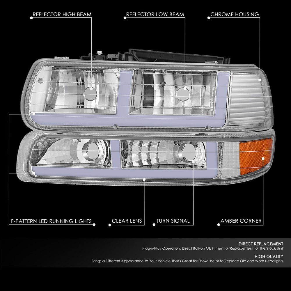 Welcome to our eBay store DPT Motorsport Business Hours: Monday - Friday, 9 AM to 6 PM PST. Store Home Payment Shipping Returns Need Help Add to Favorites About Us Fit 99-06 Tahoe Silverado Suburban 1500 F-Pattern LED Bar Chrome Amber Headlight Product Description A headlight (headlamp) is a lamp attached to the front of a vehicle to light the road ahead. Headlight performance has steadily improved throughout the automobile age, spurred by the great disparity between daytime and nighttime traffic fatalities. Headlights are one of the most important components of your vehicle; they allow you to see the road in front of you clearly during the night and in any bad weather that may arise. Our headlights upgrade the face of your vehicle with clear style and extreme range. Easy to Install Replacement for the Stock Unit Comes with a Complete Set of Headlights (Driver and Passenger Side) Comes with a Complete Set of Front Parking / Turn Signal Lights (Driver and Passenger Side) Brings a Different Appearance to Vehicle that's Great for Show Use or to Replace Old and Worn Headlights Requires Wiring Driving Lights to Existing Vehicle Wiring Harness No Bulbs included White LED F-Pattern Design Driving Light Bars Includes: 1 X Pair of Headlights (Left & Right) 1 X Pair of Front Parking / Turn Signal Lights Notes: Compatible with: 99-02 Chevrolet Silverado 1500 99-02 Chevrolet Silverado 2500 01-02 Chevrolet Silverado 1500 HD 01-02 Chevrolet Silverado 2500 HD 01-02 Chevrolet Silverado 3500 00-06 Chevrolet Suburban 1500 00-06 Chevrolet Suburban 2500 00-06 Chevrolet Tahoe 100% Brand New Professional Installation is Highly Recommended Installation Instruction is NOT Included About Us Payment Shipping Returns Feedback Contact Us Have any questions or need info about something you already purchased? We'd love to hear from you! For items already purchased, please kindly include your eBay item number for faster response time. DPT Motorsport operates from Monday through Friday, 10 am to 6 pm (PST). ATTENTION: We are closed on Saturdays and Sundays. All messages will be replied in the order it was received during business days Thank you for choosing DPT Motorsport and happy bidding! We accept PayPal only. We reserve the right to file Non-Paying Bidder if payment is not received 10 days after the auction ended. Shipping Methods All shipments are made via either UPS or United States Postal Service depending on the types of products purchased. Majority of our orders will be ship within 2 business days (mostly within 24hrs) (All mail transit time stated above is best estimated but not guaranteed.) All shipments requires physical addresses, no PO Box address will be shipped. Shipping and handling charges are not negotiable. Return Policy **We stand behind the products we sell. If for any reason you are not satisfied with your purchase, we'll be happy to process a refund the product less S&H within 30 Days of your purchase. All return items will require a RMA number, which is given by our Customer Service Department only. Please allow 10-14 days for returns and exchange to be process. Please inspect all your order(s) upon receipt. All return items MUST be in brand new condition which means the item is never installed and kept in the original packaging. We will not reship replacement(s) before we get a claim approval for the lost or stolen item(s) or the returned item from customers. In most cases, all shipping and handling fees are non-refundable, unless it has been approved by our Customer Service Department. Any item(s) that the buyer states as defective will be tested by our Returns Department, if there is no problems or errors found during testing. Once the RMA# is issued, the buyer will have 30 days to return the item, if any items that is return after 30 days, the item(s) are subject for rejection. All items are brand new unless otherwise stated. PROFESSIONAL installation is highly recommended. Buyer assumes all risk on usage. About Us Have any questions or need info about something you already purchased? We'd love to hear from you! For items already purchased, please kindly include your eBay item number for faster response time. DPT Motorsport operates from Monday through Friday, 10 am to 6 pm (PST). ATTENTION: We are closed on Saturdays and Sundays. All messages will be replied in the order it was received during business days Thank you for choosing DPT Motorsport and happy bidding! Payment We accept PayPal only. We reserve the right to file Non-Paying Bidder if payment is not received 10 days after the auction ended. Shipping Shipping Methods All shipments are made via either UPS or United States Postal Service depending on the types of products purchased. Majority of our orders will be ship within 2 business days (mostly within 24hrs) (All mail transit time stated above is best estimated but not guaranteed.) All shipments requires physical addresses, no PO Box address will be shipped. Shipping and handling charges are not negotiable. Returns >Return Policy **We stand behind the products we sell. If for any reason you are not satisfied with your purchase, we'll be happy to process an exchange or refund the product less S&H within 30 Days of your purchase. All return items will require a RMA number, which is given by our Customer Service Department only. Please allow 10-14 days for returns and exchange to be process. Please inspect all your order(s) upon receipt. All return items MUST be in brand new condition which means the item is never installed and kept in the original packaging, otherwise you will be subjected to a 20% restocking fee. We will not reship replacement(s) before we get a claim approval for the lost or stolen item(s) or the returned item from customers. In most cases, all shipping and handling fees are non-refundable, unless it has been approved by our Customer Service Department. Any item(s) that the buyer states as defective will be tested by our Returns Department, if there is no problems