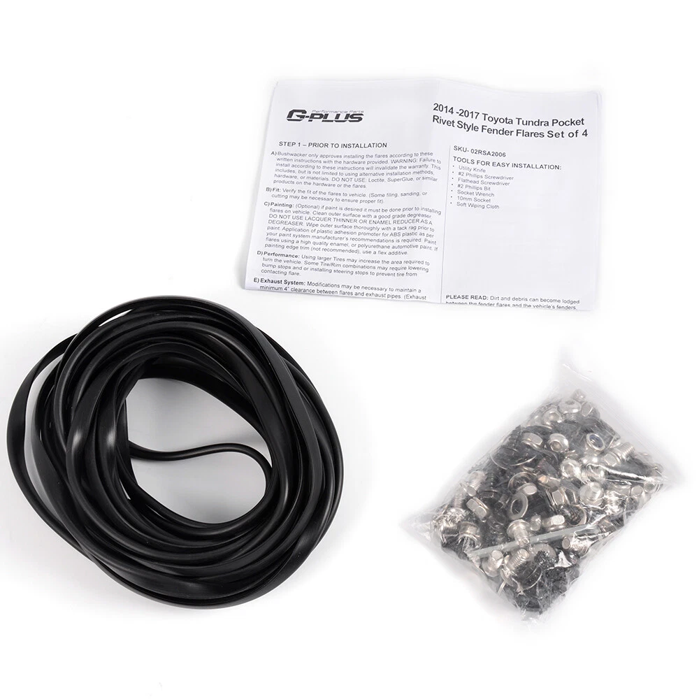 AUTOMOTO PRODUCT Fit For 2014-2020 Toyota Tundra Smooth Black Pocket Rivet Wheel Fender Flares Product Introduction Title: Fender Flares Application: 2014-2020 Toyota Tundra SR | SR5 | Platinum | Limited | 1794 Edition| TRD PRO Regular Cab | Double Cab | Crewmax Cab Bed Length: 66.7 | 78.7 | 97.6 Color: Black Description: 100% brand new in original packaging. Product will be received exactly the same as shown in the picture! SIX pieces set of pocket rivet style fender flares. (4 for front and 2 for rear) Full protection from mud scratches, sand and other outer damages for your wheels. Helps to reduce spray and protects paint with fender flares. Comes with bolts, nuts and all necessary mounting hardware for installation. Easy to install, no further modification to the body needed High quality injection moulding fender flares with smooth and precise edge cutting finish. Package Includes: A set (6pcs) of pocket style Fender Flares Note: All of the items in our shop will come to you with the tracking number. Visit shop home WELCOME to our ebay shop CONTACT US We Open 7 Days A Week ABOUT US ABOUT US: Welcome to GPLUS's eBay Store. We specialize in aftermarket automotive car parts and is the #1 industry distributor for affordable and quality products. Welcome to GPLUS's eBay Store. We specialize in aftermarket automotive car parts and is the #1 industry distributor for affordable and quality products. Welcome to GPLUS's eBay Store. We specialize in aftermarket automotive car parts and is the #1 industry distributor for affordable and quality products. SHIPPING Shipping Information All items will ship within 24 hours (Monday - Friday). Payment cleared/received on Friday will be shipped on the next business days (Monday or Tuesday). We are not responsible for carrier transit time. This information is provided by the carrier and excludes weekends and holidays. Note that transit times may vary, particularly during peak periods or in climate weather conditions, and that delivery times frames will need to be extended for any processing time frames in excess of 1-2 business days. excess of 1-2 business days. International Shipping: International buyers are responsible for possible customs fees, brokerage fees or duty fees. We would appreciate for understanding of tracking number would not be updated in between the city of departing in the U.S. and the city of destination. ATTENTION Cargo transportation Double check shipping address. We are not responsible for incorrect or undeliverable addresses. Please use Shipping & Payments tab on top of page for shipping details for your location. Transaction will be held until a full shipping amount received. Shipping address Some of the packages cannot be delivered to a PO Box. Customer is responsible to ensure PO Box address given is deliverable by the shipping company. Package will be held until a valid physical address is provided. Customer assumes shipping charges incurred in shipping to undeliverable address. Customs duties International buyers are responsible for all customs duties, taxes, and other applicable fees incurred by the country's customs/border regulations. Please contact customs for more information. We are not responsible for any changes to address after item has been shipped. RETURN please notify us within 30 days after you've received your purchased item. Return Policy: Buyers pay for return shipping fee. Items to be returned must be in resalable condition.14 Days money back, please notify us within 14 days after you've received your purchased item. If your order has been received and it is not what you ordered, or if your item has a manufacturer defect, please contact us within 14 days from delivery date. And you must contact us to request an Return Merchandise Authorization Number (RMA). No return package will be accepted without a valid RMA number. All products are covered by our warranty against defects. EMAIL click here for questions All return requests must be submitted through your eBay account. Iterms and Condition For emissions related items, please check with your local jurisdiction for emission specific requirements before purchasing. All items do not come with installation instruction unless otherwise specified. If item is questionable, please consult your local professional/mechanic before making purchase. On Jan 14, 2025 at 10:37:33 PST, seller added the following information: