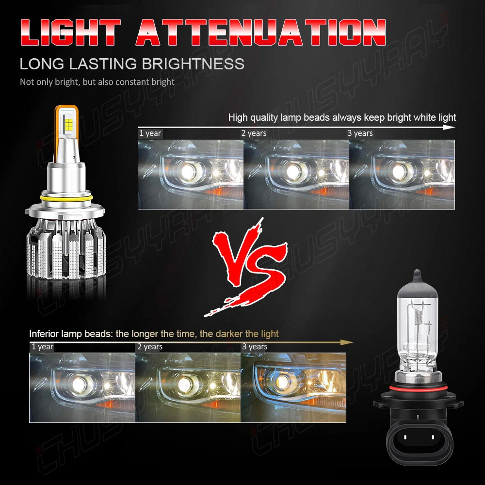 Product Parameters: Light source: 3570 Material: Aviation Aluminum Working Voltage: 9-23V Color temperature: 6000K Lumen: 10000LM Life: 50000 hours Working environment: -40℃~80℃ Waterproof grade: IP67 Product Performance: 1)SUPER BRIGHT 3570 LED CHIP 0.5mm thinnest LED spacing,the shorter the distance the better spotlight,super focused beam design,no dark spot. 2)ROTATABLE DESIGN Removable collar ring,you can now adjust the beam angle to a perfect one.Fit for 98% headlamp covers on market 3)COOLING SYSTEM,FOUR WAYS HEAT DISSIPATION Copper heat conduction;Evaporation from aviation aluminum;Polyhedral grid;Built-in turbo fan,silent and high speed. 4)IP67 WATERPROOF DESIGN For the most extreme conditions,with explosion-proof,shockproof,hign temperature hign pressure and other charateristics. 5)Small outer diameter, easy to install, high brightness, very concentrated, and fast heat dissipation. 6)Wider and further illumination areas than halogen lamp,300% brighter than traditional halogen lamps. 7)White light source, easy to accept by human eyes, will not feel tired Package Included: 2x LED 9005/HB3 headlight bulbs high beam 2x LED 9006/HB4 headlight bulbs low beam 2x LED H11/H8/H9 foglight bulbs New and old packaging will be shipped randomly Information: If you are unsure the item fit or not , please do remember send message to tell us your car make, model, year and other information which is helpful to check the item fit or not. For example: For 2004 Ford F150, high/low beam For 2015 RAM 1500 with projector-type, high beam For 2019 Ford F150 ,XL Crew Cab Pickup 4-Door 2.7L Notice: 1.The product must be installed by professionals. Please disconnect the car battery before installation. Please check the wiring after installation. 2.Please reserve enough space in the headlight housing for installtion and heat dissipation. All our products are manufactured under the strictest quality control. If the project is not functioning properly, please contact us by email first. If you have any questions, please contact us in time.