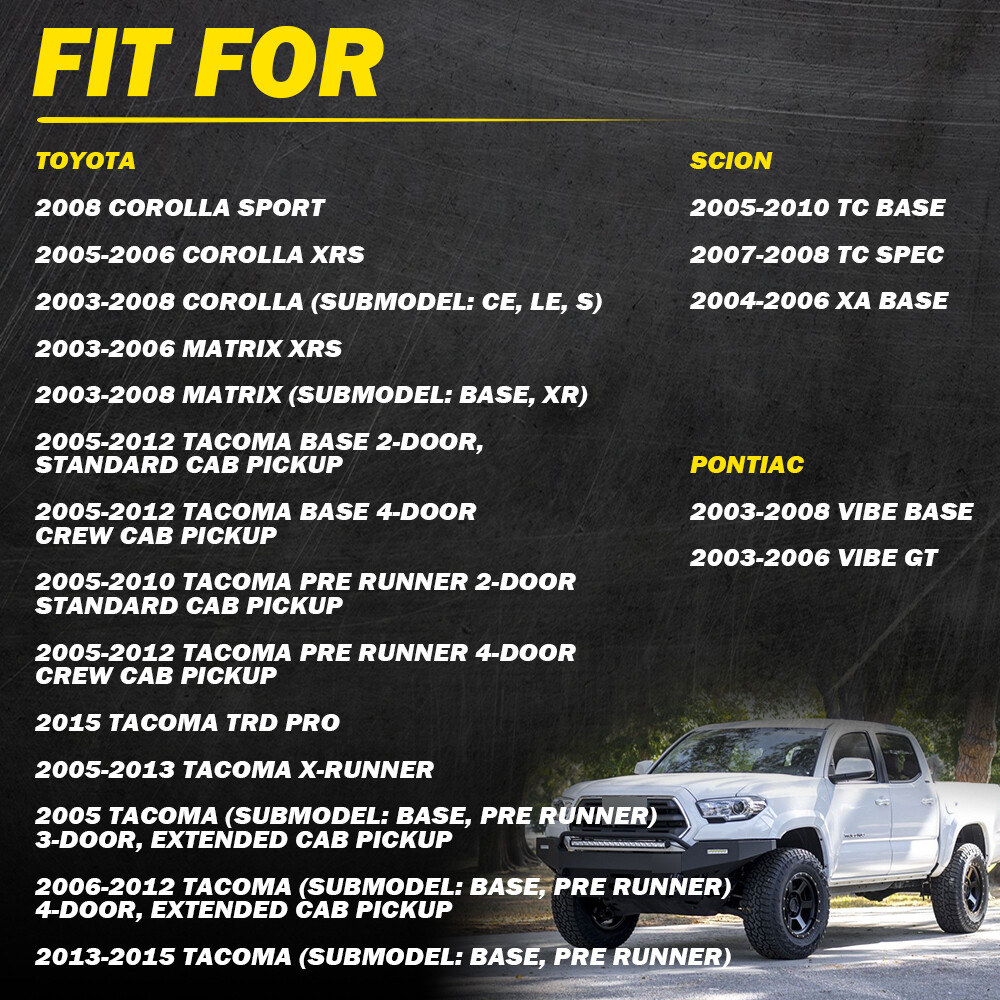 Fit for: Pontiac 2003-2008 Vibe Base 2003-2006 Vibe GT Scion 2005-2010 tC Base 2007-2008 tC Spec 2004-2006 xA Base Toyota 2008 Corolla Sport 2005-2006 Corolla XRS 2003-2008 Corolla (submodel: CE, LE, S) 2003-2006 Matrix XRS 2003-2008 Matrix (submodel: Base, XR) 2005-2012 Tacoma Base 2-Door, Standard Cab Pickup 2005-2012 Tacoma Base 4-Door, Crew Cab Pickup 2005-2010 Tacoma Pre Runner 2-Door, Standard Cab Pickup 2005-2012 Tacoma Pre Runner 4-Door, Crew Cab Pickup 2015 Tacoma TRD Pro 2005-2013 Tacoma X-Runner Fits Toyota 2003-2008 Corolla Inside Interior Door Handle Right Left Front Rear Fit for: Pontiac 2003-2008 Vibe Base 2003-2006 Vibe GT Scion 2005-2010 tC Base 2007-2008 tC Spec 2004-2006 xA Base Toyota 2008 Corolla Sport 2005-2006 Corolla XRS 2003-2008 Corolla (submodel: CE, LE, S) 2003-2006 Matrix XRS 2003-2008 Matrix (submodel: Base, XR) 2005-2012 Tacoma Base 2-Door, Standard Cab Pickup 2005-2012 Tacoma Base 4-Door, Crew Cab Pickup 2005-2010 Tacoma Pre Runner 2-Door, Standard Cab Pickup 2005-2012 Tacoma Pre Runner 4-Door, Crew Cab Pickup 2015 Tacoma TRD Pro 2005-2013 Tacoma X-Runner 2005 Tacoma (submodel: Base, Pre Runner) 3-Door, Extended Cab Pickup 2006-2012 Tacoma (submodel: Base, Pre Runner) 4-Door, Extended Cab Pickup 2013-2015 Tacoma (submodel: Base, Pre Runner) Specifications OE Number: 6920612190B0 6920512190B0 Product Material: ABS Color: Beige/Black/Gray (as pictures show) Placement on Vehicle: Left right side of inner door Features: *Perfect Fitment Comply with the industrial standards, use it with confidence. *Strict Quality Control All of our handles undergo strict quality control not just before shipping but throughout the production process. *Durable Material Mainly made of high-quality material to ensure the long service life and durability. *Simple Installation Easy installation with direct replacement, other modifications are not required. *Warm Notice Please double-check the part number and models in the description to guarantee it fits your vehicle before ordering. Packaging Include: Door handle (as your choice) Item Specifics Brand Unbranded Bundle Listing Yes Components (2) Interior Door Handles Features With door lock button Fitment Type Direct Replacement Interchange Part Number 6920512200A2 6920612200A2 2012 2011 2010 2009 2008 2007 2006 2005 2004 2003 Pontiac, Scion, Toyota Vibe tC xA Corolla Matrix Tacoma 2-Door, Standard Cab Pickup 4-Door, Crew Cab Pickup 3-Door, Extended Cab Pickup 4-Door, Extended Ca Manufacturer Part Number 14913751 Manufacturer Warranty 1-year unlimited-mileage warranty Number of Pieces 4 OE Number 6920512200A2, 6920612200A2 OE/OEM Part Number 6920512200A2, 6920612200A2 Part Name Interior Door Handle Placement on Vehicle Left, Right, Front, Rear Superseded Part Number 6920512200A2 6920612200A2 2012 2011 2010 2009 2008 2007 2006 2005 2004 2003 Pontiac, Scion, Toyota Vibe tC xA Corolla Matrix Tacoma 2-Door, Standard Cab Pickup 4-Door, Crew Cab Pickup 3-Door, Extended Cab Pickup 4-Door, Extended Cab Type Interior Door Handle UPC Does Not Apply Material ABS Material ABS Payment Returns DESCRIPTION PAYMENT SHIPPING RETURN POLICY CONTACT US Shop Category Store Home LED Headlight ◈ H4 ◈ H13 LED FogLight ◈ H10 / 9145 / 9140 LED Reverse Light ◈ T15/921/W16W LED Side Marker Light Car Parts & Accessories Tail Light assemblies Other Hot Item Picture New List Item AUXITO 2PCS 880 Fog LED Light Bulb DRL 6500K White Super Bright 890 892 893 899 USD 20.99 10X AUXITO 175 168 2825 194 T10 LED Parking Light Bulb Canbus Super Bright Amber USD 14.99 Super Bright H7 LED Bulbs Headlight Conversion Kit High Low Beam White 1-10Set USD 28.99 4 LH RH For Silverado Chevrolet 1500 99-06 Black W/Chrome Exterior Door Handle USD 41.99 H11 9005 LED Headlight Bright Super Bulb 6000K White HIGH/LOW BEAM Lamp 1-10Set USD 66.99 Help & Info Payment Policy Shipping Policy Return Policy FAQ About Us Fits Toyota 2003-2008 Corolla Inside Interior Door Handle Right Left Front Rear Fit for: Pontiac 2003-2008 Vibe Base 2003-2006 Vibe GT Scion 2005-2010 tC Base 2007-2008 tC Spec 2004-2006 xA Base Toyota 2008 Corolla Sport 2005-2006 Corolla XRS 2003-2008 Corolla (submodel: CE, LE, S) 2003-2006 Matrix XRS 2003-2008 Matrix (submodel: Base, XR) 2005-2012 Tacoma Base 2-Door, Standard Cab Pickup 2005-2012 Tacoma Base 4-Door, Crew Cab Pickup 2005-2010 Tacoma Pre Runner 2-Door, Standard Cab Pickup 2005-2012 Tacoma Pre Runner 4-Door, Crew Cab Pickup 2015 Tacoma TRD Pro 2005-2013 Tacoma X-Runner 2005 Tacoma (submodel: Base, Pre Runner) 3-Door, Extended Cab Pickup 2006-2012 Tacoma (submodel: Base, Pre Runner) 4-Door, Extended Cab Pickup 2013-2015 Tacoma (submodel: Base, Pre Runner) Specifications OE Number: 6920612190B0 6920512190B0 Product Material: ABS Color: Beige/Black/Gray (as pictures show) Placement on Vehicle: Left right side of inner door Features: *Perfect Fitment Comply with the industrial standards, use it with confidence. *Strict Quality Control All of our handles undergo strict quality control not just before shipping but throughout the production process. *Durable Material Mainly made of high-quality material to ensure the long service life and durability. *Simple Installation Easy installation with direct replacement, other modifications are not required. *Warm Notice Please double-check the part number and models in the description to guarantee it fits your vehicle before ordering. Packaging Include: Door handle (as your choice) Payment Returns All rights reserved. On Jan 31, 2025 at 23:23:22 PST, seller added the following information: