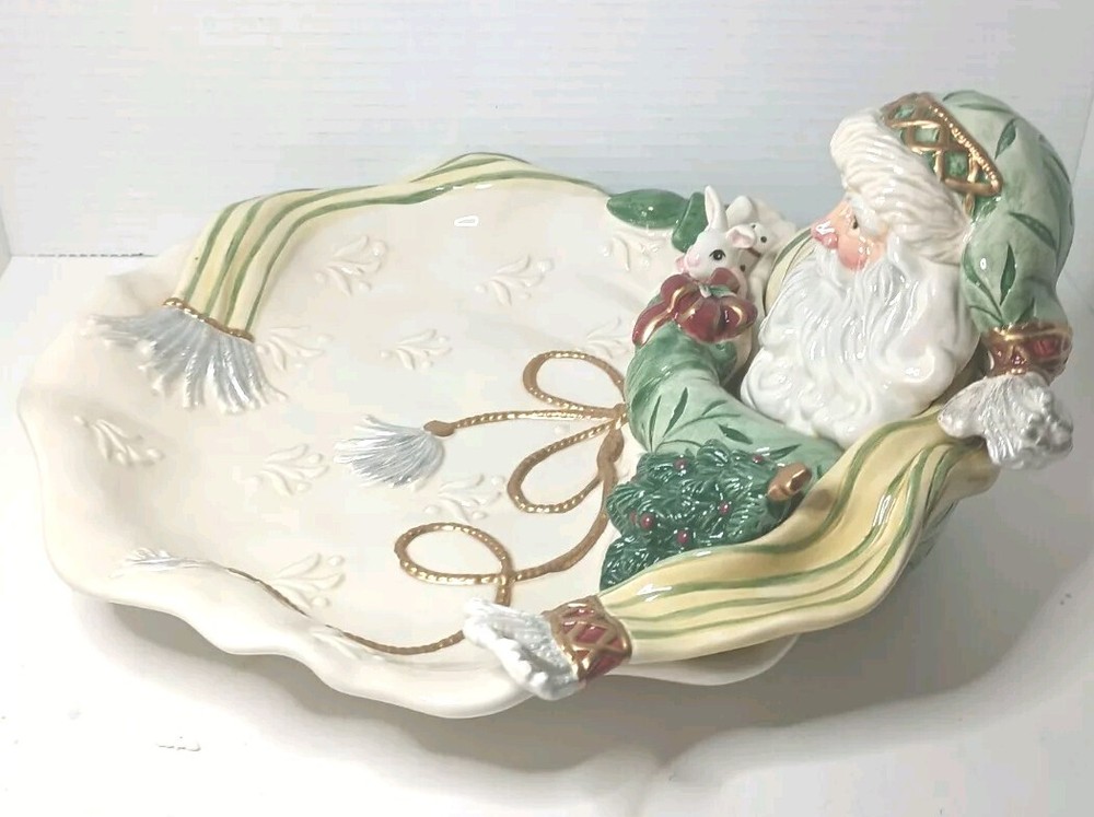 This Fitz and Floyd Gregorian Santa Christmas Classics Centerpiece Serving Platter is a must-have for any holiday collector. The beige color and intricate design make it a beautiful addition to any table setting. Made of ceramic and porcelain, this serving platter is durable and will last for years to come. With a brand name of Fitz & Floyd, you know that this serving platter is of high quality. It was manufactured in China in 1991 and is part of the holiday collectibles category. This item is perfect for those who enjoy collecting unique pieces during the holiday season. Add it to your collection today! In the original box.