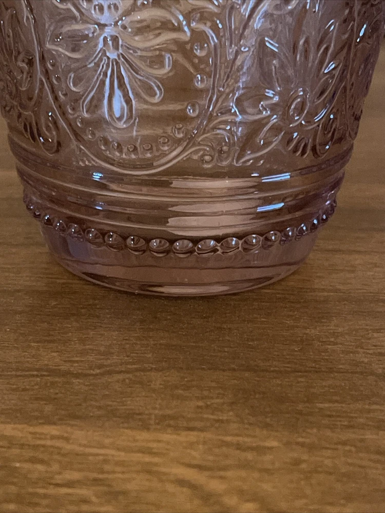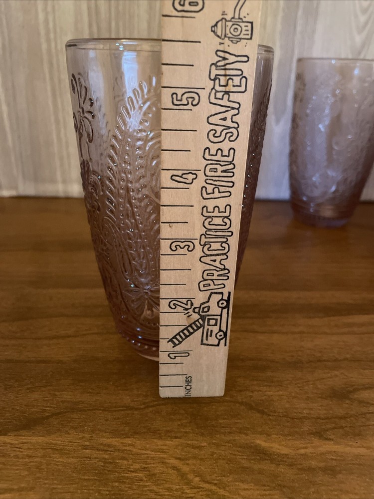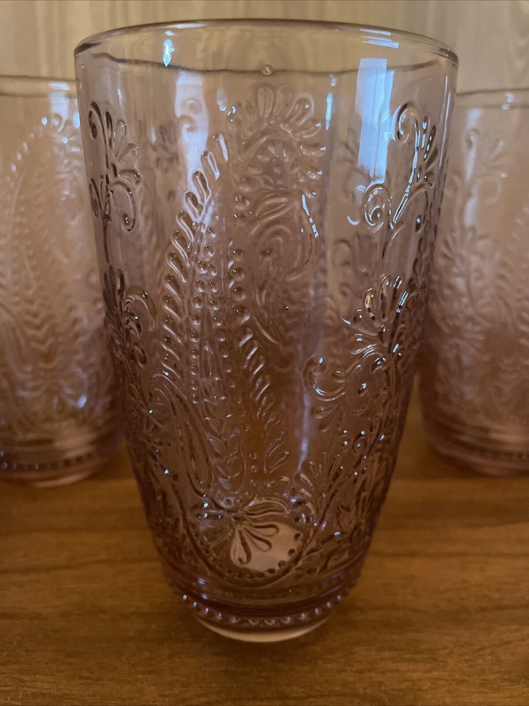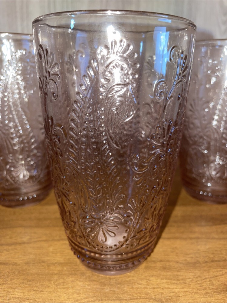 Glasses will ship in original manufacturer carton, then boxed within an outer box for extra protection in shipping. Elevate your home bar with this exquisite set of four Fitz and Floyd Maddi highball glasses. The glasses are adorned with a beautiful paisley pattern in a stunning purple color, adding a touch of sophistication to any occasion. These 15-ounce glasses are perfect for all occasions and are made of high-quality glass material. The set includes four glasses, each with a decorated feature, making it an ideal choice for a service of four. Whether you're hosting a party or enjoying a drink alone, these glasses are a must-have addition to your glassware collection.