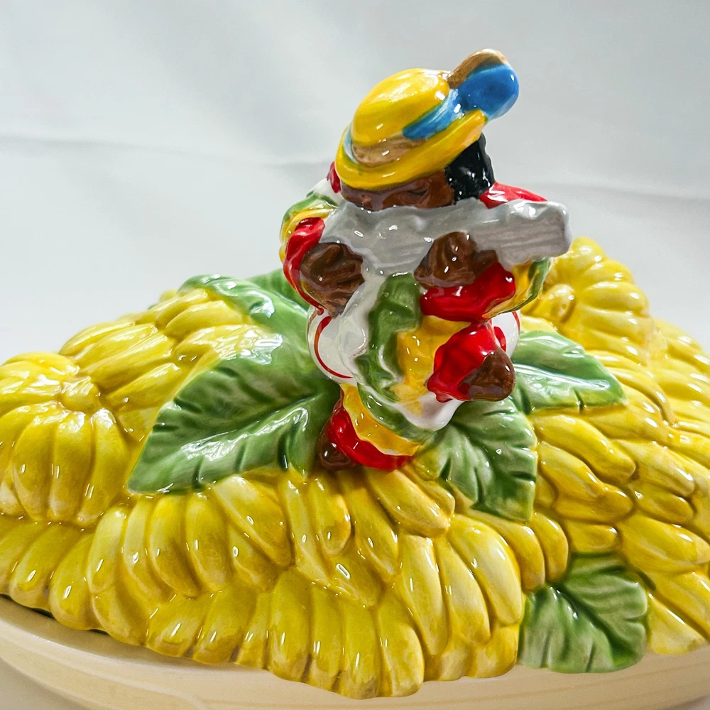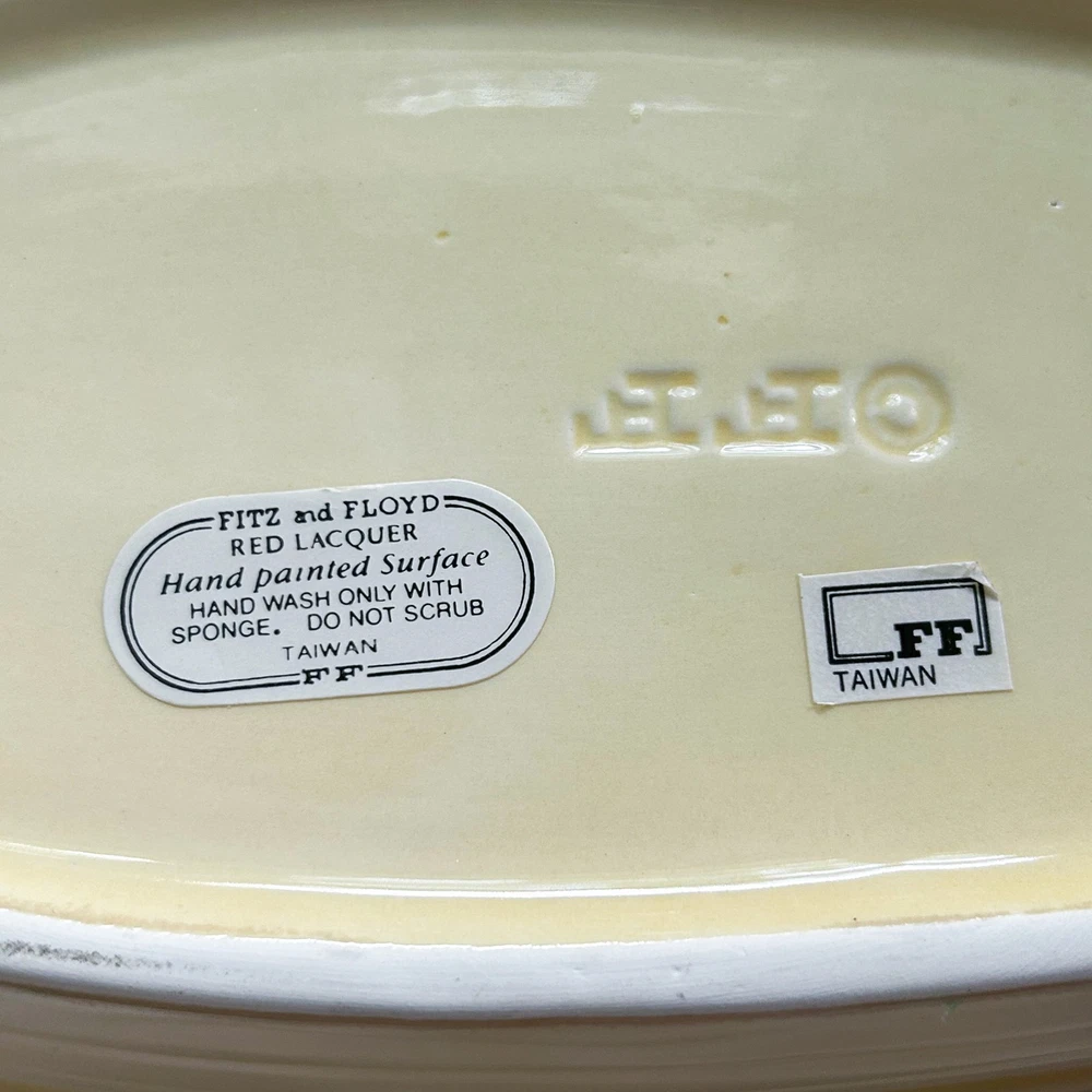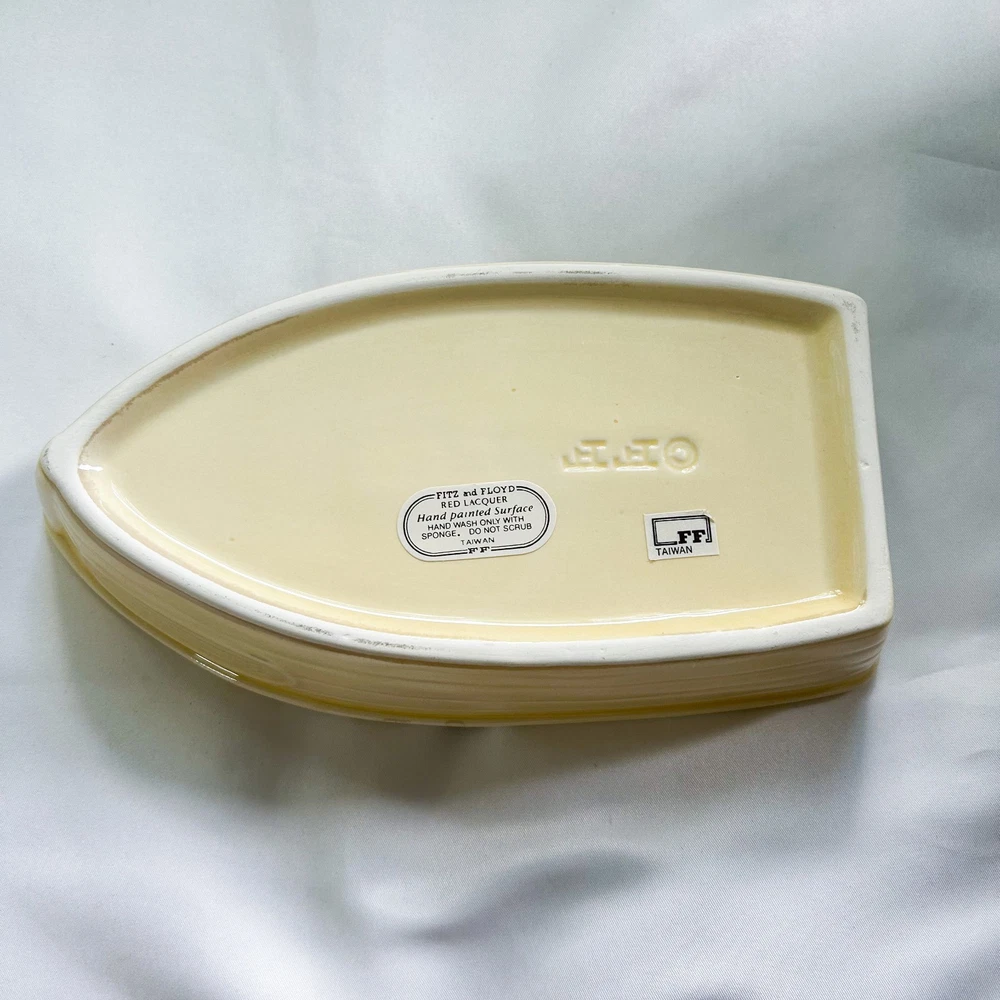 Fitz and Floyd Red Lacquer Rio Rita Banana Boat Covered Dish, Rare. This covered dish was made between 1989-1990. Handpainted. Made in Taiwan. Approximate dimensions: 6 1/4” tall, 7” long. New, in original open box. Item will be shipped in a recycled box.