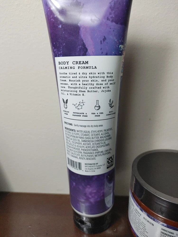 Brand:Five Deep BreathsBody Area:Full BodyProduct Line:Five Deep Breaths Body Caregtin13:811170039819Features:Animal Cruelty-Free, Contains Vitamins, Hydrating, Paraben-Free, Phthalate-FreeUPC:811170039819Formulation:CreamScent:Lavender & ChamomileMain Purpose:Moisturizer, Stress ReliefColor:PurpleSet Includes:Daily Use, Day Treatment, Night TreatmentCountry/Region of Manufacture:ChinaType:Daily UseDepartment:UnisexVolume:11.5 oz each (3)Period After Opening (PAO):12MSkin Type:All Skin TypesIngredients:Aloe Vera, Shea Butter, Jojoba Oil, Vitamin E, Lavender & ChamomileSize:Regular