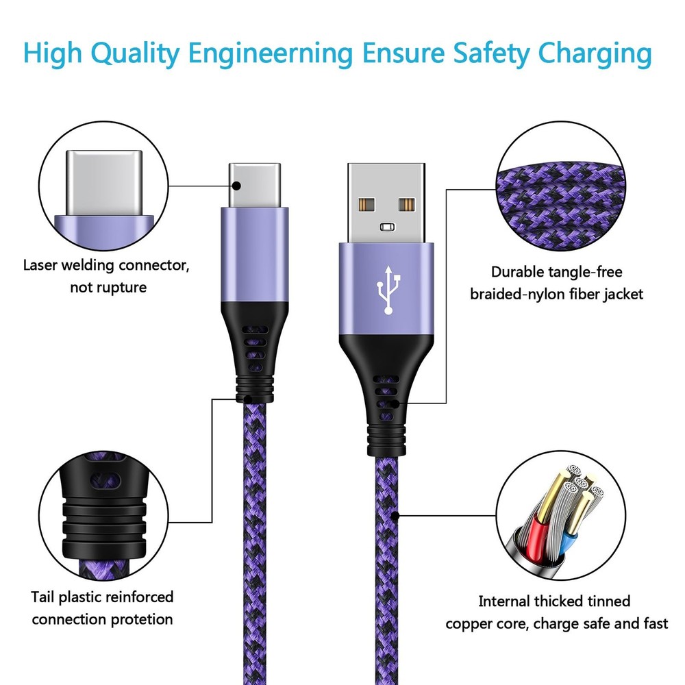 ☛[3A Fast Charge & Sync] Fast charging speed up to max 3Amp, and data/sync speed up to 480Mbps. ☛[High Durability] with thick tinned copper core, premium aluminum housing and sturdy nylon fiber jacket, the cable is resistant to kinking, bending and pulling. ☛[Compatibility Devices] Compatible LG G5 G6 G7 G8 G8X V20 V30 V30S V35 V40 V50 ThinQ (Not for LG G4/G3/G2/V10/V60 ThinG) , LG Stylo 4/5/6 (Not for Stylo 2/3) , LG Velvet 5G, LG Wing 5G, LG K51 K52 K61 K62 K71 K92 K42 K41S K51S (2020/2021) (Not for LG K20/K30/K40) , iPhone 16/ 16 Pro/ 16 Pro Max/ 16 Plus, 15/ 15 Pro/ 15 Pro Max/ 15 Plus, Google Pixel 9, 9 Pro, 9 Pro XL, 9 Pro Fold, 8, 8a, 8 Pro, 7, 7a, 7 Pro, 6, 6a, 6 Pro, 5, 5a 5G, 4, 4a, 4 XL, 3, 3a, 3 XL, 2, 2 XL, XL, Samsung Galaxy S24 S23 S22 S21 S20 S10 S10e, Moto G10 G9 G8 G7, Google Pixel and more type c connector device. ☛[Package Including] 4pcs 6-feet USB type c cable (blue/purple/green/pink). 【Universal Compatibility】USB type c charging cable power cord compatible for iPhone 16, 16 Pro Max, 16 Pro, 16 Plus, 15, 15 Pro Max, 15 Pro, 15 Plus, Google Pixel 9 Pro XL Fold 8 7 6 Pro 5 4 3 2 XL 8a 7a 6a 5a 4a 3a, LG G5 G6 G7 G8 G8X V20 V30 V30S V35 V40 V50 ThinQ (Not for G4 G3 G2 V10 V60 ThinG), LG Velvet 5G, LG Wing 5G, LG Stylo 4/5/6 (Not for Stylo 2/3), LG K51 K52 K61 K62 K71 K92 2020/2021 (Not for K20 K30 K40), Samsung Galaxy S24 S23 S22 S21 S20 S10e and more device. 【3A Fast Charge & Sync】The cable supports a safe fast charging speed up to max 3Amp, and data/sync speed up to 480Mbps. Note: Only the cord will not fast charge, you should charge with fast wall charger. 【Sturdy & Durable & Safety】with 6000+ times bend lifespan, internal thick tinned copper core, premium aluminum housing and sturdy nylon fiber jacket. 【6ft length】Extra long length, you can use freely on sofa, bed, office, backseat of the car, no worry of distance limited. 【What we offer】4pcs 6-feet usb c cables and 3-years w arranty, if there is any problem, please contact with us, we will solve the problem within 24 hours.