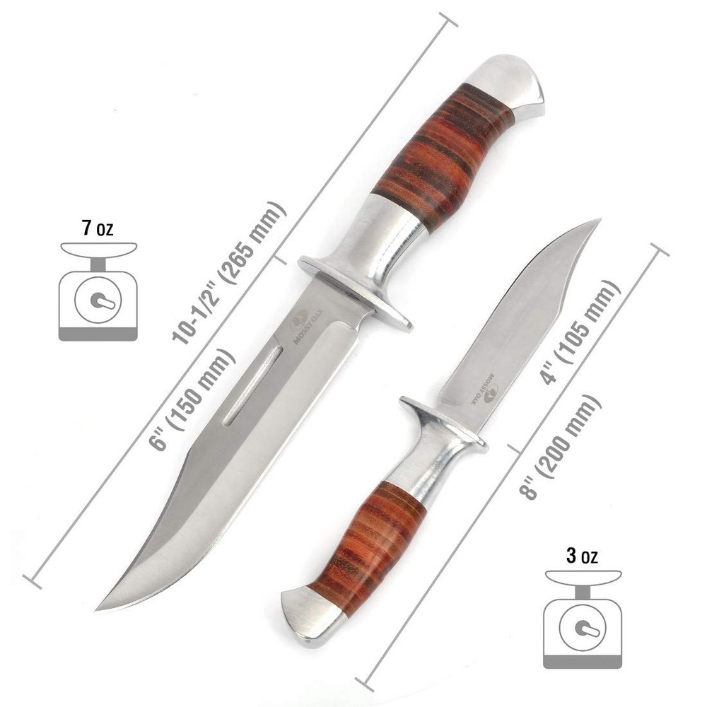 Fixed Blade Bowie Knife, 2-piece Hunting Knife with Leather Handle Featuring Laser Pattern, Sheath Included Knife Dimensions - Large Clip Point Knife Total Length: 10-1/2”; Blade Length: 6”; Weight: 7 oz/200 g; Small Clip Point Knife Total Length: 8”; Blade Length: 4”; Weight: 3 oz/83 g Razor Sharp Blades - Excellent strength, edge retention, and corrosion resistance for lasting durability, good for piercing, detail work, and cutting in tight places Full Tang Structure - Well-made full tang knife features a solid stainless steel blade. Ergonomically styled handle with grooves help prevent slip during use, includes pommel to guard your fingers Handle Grip Design and Sheaths - Cloud-patterned laser handle grips combine practicality and aesthetics. It comes with a nylon sheath for each knife Wide Applicable Occasions - Suitable for various military, hunting, survival, tactical, industrial, and outdoor situations Fixed Blade Bowie Knife, 2-piece Hunting Knife with Leather Handle Featuring Laser Pattern, Sheath Included Classic, multipurpose bowie knives set, a worthy companion to hunters, fishers, and outdoor survivals ( Not suitable for batoning firewood) Product Features Versatile clip point - classic design, delivers excellent cutting properties, and is equipped to handle your chopping, cutting and slicing duties. Ergonomically shaped leather handle - finger grooves designed on the handle to facilitate and make the work of knife more comfortable, widen the range of possible tasks for its application from hunting, fishing and other camping, survival purpose. Improved balance and grip - it is equipped with steel bolster and a pommel, to prevent the knife slipping from your hand and offer perfect balance in hand. Full tang construction - providing greater strength and reliability than folding knives, weighs tough and stable in your hand Item Dimensions Blade surface: satin finish Handle material: leather Blade type: fixed blade Blade shape: clip point /bowie knife blade Blade length: 4" / 6" Handle length: 4" / 4-1/2" Overall length: 8" / 10-1/2" Weight: 7 oz / 3 oz Our service If you have any questions about the products or unsatisfactory over us, contact us without hesitation, we would reply within 24 hours. Shipping We offer FREE shipping on all orders! We ship within Three business days of payment, usually sooner. We use a selection of shipping services such as UPS, FedEx, USPS etc. We only ship to the lower 48 states, no APO/FPO addresses or PO Boxes allowed. Local pickups and combined shipping options are not provided at this time. Return You can return a product for up to 30 days from the date you purchased it. Any product you return must be in the same condition you received it and in the original packaging. Please keep the receipt. Payment We accept payment by any of the following methods: PayPal Please pay as soon as possible after winning an auction, as that will allow us to post your item to you sooner! Feedback Customer satisfaction is very important to us. If you have any problem with your order, please contact us and we will do our best to make you satisfied. Contact Us If you have any queries, please contact us via ebay. We usually respond within 24 hours on weekdays. Please visit our eBay store to check out other items for sale! Thank you for shopping at our store.