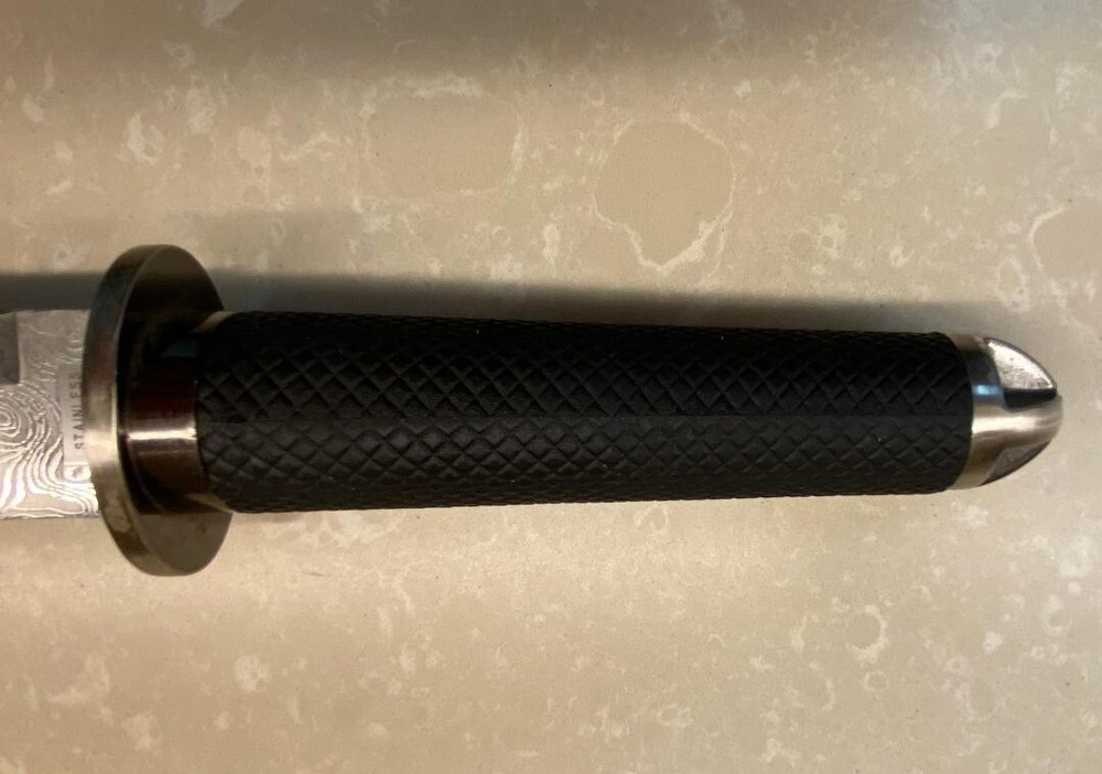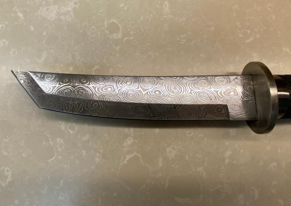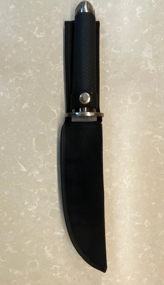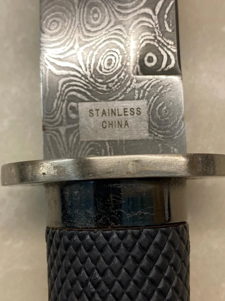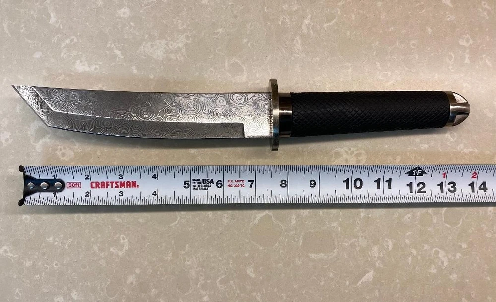 This fixed tanto blade stainless knife is in fantastic condition. The blade has the original edge and appears to have never been used. The etched pattern on the blade is similar to a raindrop Damascus pattern. The handle screws off and is hollow with a steel dowel insert. This is a heavy, well-made knife weighing 1 lb. 5 oz. The belt sheath is in very good condition with a very small amount of rust on the snap. Please see the photos to appreciate the overall nice condition. Thanks for taking a look.