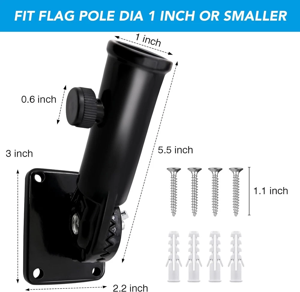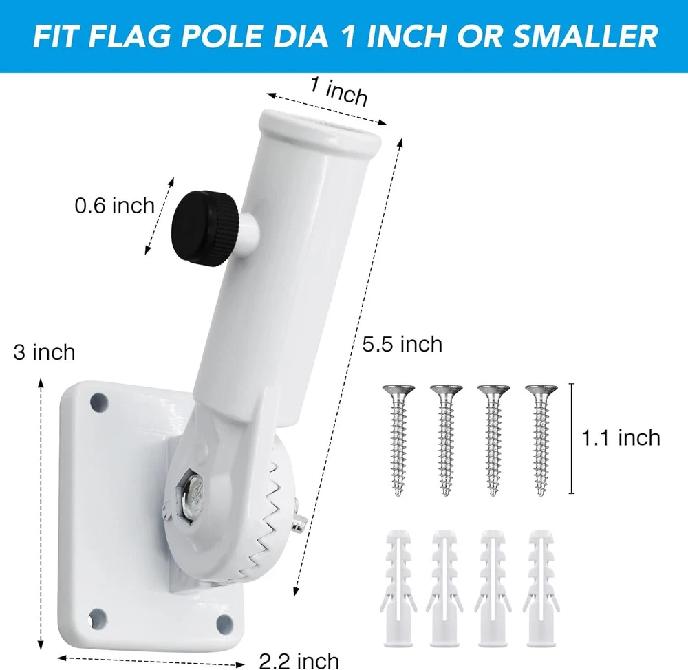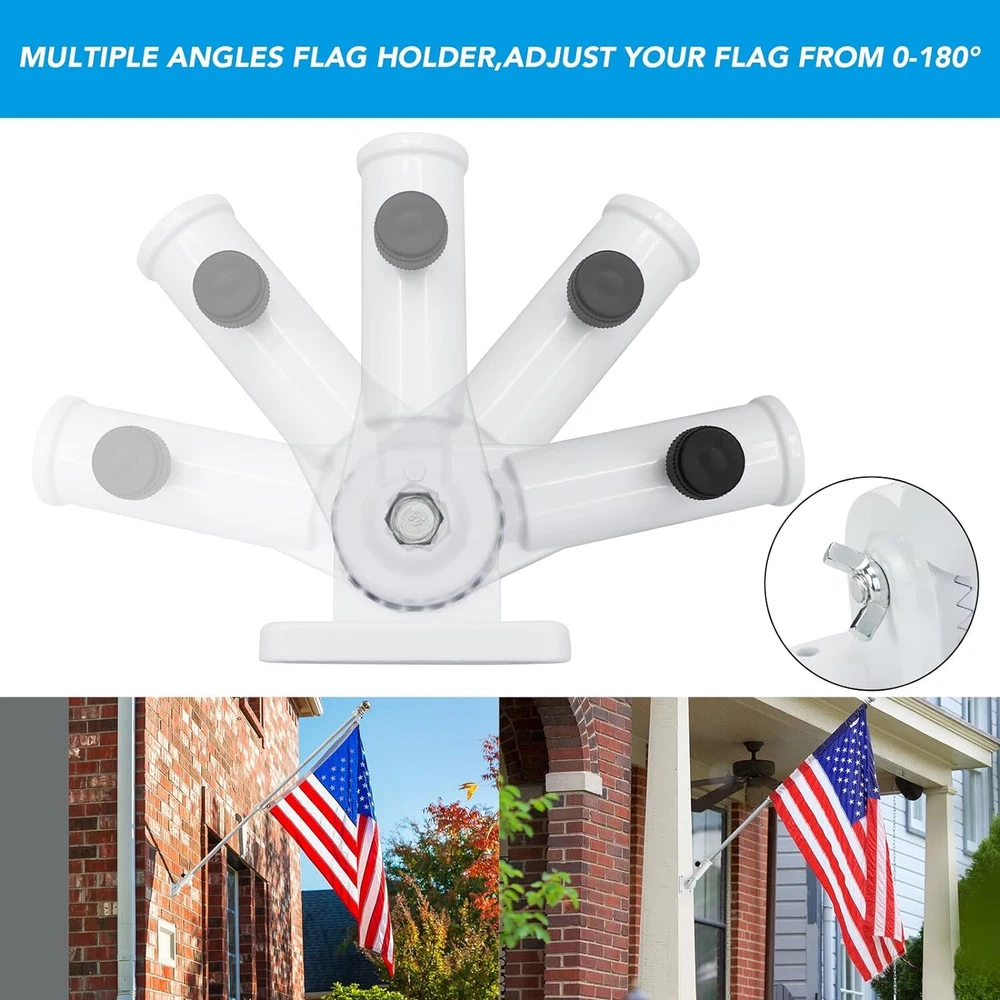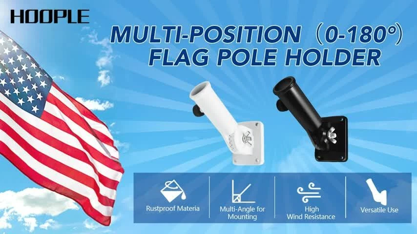Heavy Duty Flag Pole Holder Bracket: HOOPLE Flag Pole Holder. Being the sturdy mount of the greatest Flag. Our flag pole holder is made of premium aluminum alloy and long lasting powder coated finish, which won’t fade or rust for years and can make the flag pole base heavy duty and long lasting. High Wind Resistant: HOOPLE flag pole bracket is tested to be extra wind resistant and forever rustproof in all weather conditions. Our flag pole mounting bracket uses 1 adjustable stainless steel butterfly screws for better strength and grip. Durable All-Weather withstanding flag pole holder will become the best tool to display your American Pride. Salute our flag! Flag Pole Holder for Outside,Multi-Position Aluminum Adjustable Bracket Mount Heavy Duty Flag Pole Holder Bracket: HOOPLE Flag Pole Holder. Being the sturdy mount of the greatest Flag. Our flag pole holder is made of premium aluminum alloy and long lasting powder coated finish, which won’t fade or rust for years and can make the flag pole base heavy duty and long lasting. High Wind Resistant: HOOPLE flag pole bracket is tested to be extra wind resistant and forever rustproof in all weather conditions. Our flag pole mounting bracket uses 1 adjustable stainless steel butterfly screws for better strength and grip. Durable All-Weather withstanding flag pole holder will become the best tool to display your American Pride. Salute our flag! Multi Angles Design: HOOPLE wall mount flag pole holder for outside house adopts adjustable design, multi angles design makes the flag holder can be adjusted within a 180 degree range totally 13 different positions to perfectly display your flag. The flag pole bracket can be mounted anywhere with any angle. Designed for most 1-inch flag pole. There’s no better way to show your patriotism. Easy to Install: Don’t worry about the hassle of setting up the base of a flagpole. 4 screws, 4 anchors and 1 thumb rotating screw can make the flag pole holder fixed on the wall or pillar tightly and safely. Adjust the stainless steel butterfly screws to secure the flagpole firmly in place. Wide Application: HOOPLE all-weather metal flag pole holder for outside can be mounted anywhere with fixed position. Our flag holder mounting bracket is perfect for securing flag poles on your outdoor railing, house porch, walls, patio, yard, roof, the wooden pile, or even your truck and boat. Play Video Previous page Next page Choose Us Premium Quality SIZE of Flag Pole Holder 90 Degree 45 Degree Advantages of HOOPLE Flag Pole Holder Multiple-Position Design & Easy to Install Premium Aluminum Alloy & Rustproof Sturdy and Durable, Not Easy to Break Professional Quality & Heavy-Duty Construction Rust-Free Coating & All-Weather Resistant Disadvantages of Others Flag Pole Holders Only One Angle Cheap Material, Easy to Break Not Waterproof, Easy to Rust Fragile Plastic Material Not Adjustable Screw Thicken Flag Pole Holder Base HOOPLE Flag Pole Holder is designed with thicker materials to provide extra strength and durability and withstand strong winds and weather conditions. Rustproof, High-Wind Resistant HOOPLE Flag Pole Holder for the house is made of rustproof materials that are able to withstand harsh weather conditions without bending or breaking. Multiple-Position Design HOOPLE flag pole holder can offer 0-180 drgree, allowing you to adjust the angle of the holder compatible with a variety of flag pole sizes. Stainless Adjuatable Screw HOOPLE flag pole holder is designed with a stainless steel adjustable screw, you can easily adjust the size to fit 1 inch or smaller flag pole.