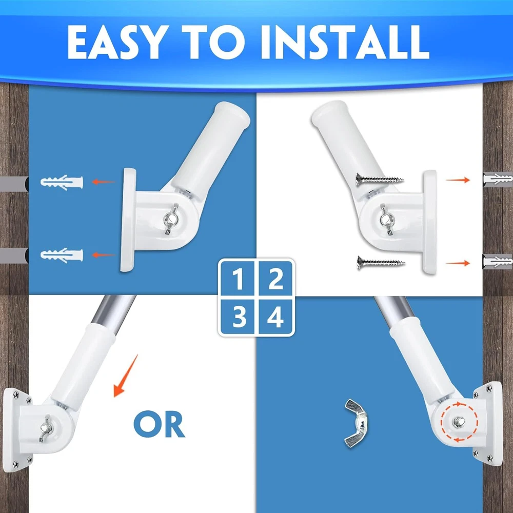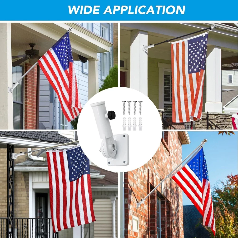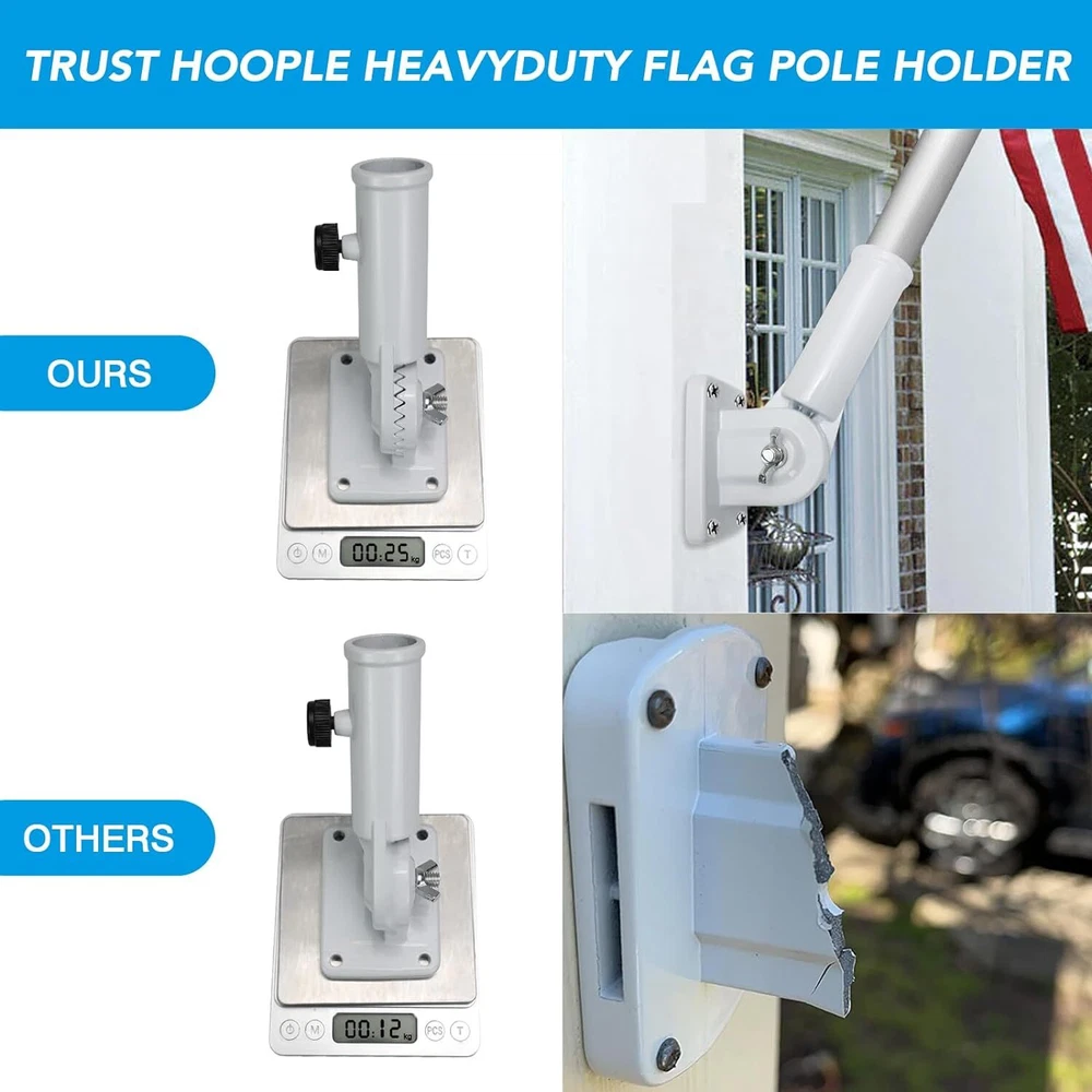 Heavy Duty Flag Pole Holder Bracket: HOOPLE Flag Pole Holder. Being the sturdy mount of the greatest Flag. Our flag pole holder is made of premium aluminum alloy and long lasting powder coated finish, which won’t fade or rust for years and can make the flag pole base heavy duty and long lasting. High Wind Resistant: HOOPLE flag pole bracket is tested to be extra wind resistant and forever rustproof in all weather conditions. Our flag pole mounting bracket uses 1 adjustable stainless steel butterfly screws for better strength and grip. Durable All-Weather withstanding flag pole holder will become the best tool to display your American Pride. Salute our flag! Flag Pole Holder for Outside,Multi-Position Aluminum Adjustable Bracket Mount Heavy Duty Flag Pole Holder Bracket: HOOPLE Flag Pole Holder. Being the sturdy mount of the greatest Flag. Our flag pole holder is made of premium aluminum alloy and long lasting powder coated finish, which won’t fade or rust for years and can make the flag pole base heavy duty and long lasting. High Wind Resistant: HOOPLE flag pole bracket is tested to be extra wind resistant and forever rustproof in all weather conditions. Our flag pole mounting bracket uses 1 adjustable stainless steel butterfly screws for better strength and grip. Durable All-Weather withstanding flag pole holder will become the best tool to display your American Pride. Salute our flag! Multi Angles Design: HOOPLE wall mount flag pole holder for outside house adopts adjustable design, multi angles design makes the flag holder can be adjusted within a 180 degree range totally 13 different positions to perfectly display your flag. The flag pole bracket can be mounted anywhere with any angle. Designed for most 1-inch flag pole. There’s no better way to show your patriotism. Easy to Install: Don’t worry about the hassle of setting up the base of a flagpole. 4 screws, 4 anchors and 1 thumb rotating screw can make the flag pole holder fixed on the wall or pillar tightly and safely. Adjust the stainless steel butterfly screws to secure the flagpole firmly in place. Wide Application: HOOPLE all-weather metal flag pole holder for outside can be mounted anywhere with fixed position. Our flag holder mounting bracket is perfect for securing flag poles on your outdoor railing, house porch, walls, patio, yard, roof, the wooden pile, or even your truck and boat. Play Video Previous page Next page Choose Us Premium Quality SIZE of Flag Pole Holder 90 Degree 45 Degree Advantages of HOOPLE Flag Pole Holder Multiple-Position Design & Easy to Install Premium Aluminum Alloy & Rustproof Sturdy and Durable, Not Easy to Break Professional Quality & Heavy-Duty Construction Rust-Free Coating & All-Weather Resistant Disadvantages of Others Flag Pole Holders Only One Angle Cheap Material, Easy to Break Not Waterproof, Easy to Rust Fragile Plastic Material Not Adjustable Screw Thicken Flag Pole Holder Base HOOPLE Flag Pole Holder is designed with thicker materials to provide extra strength and durability and withstand strong winds and weather conditions. Rustproof, High-Wind Resistant HOOPLE Flag Pole Holder for the house is made of rustproof materials that are able to withstand harsh weather conditions without bending or breaking. Multiple-Position Design HOOPLE flag pole holder can offer 0-180 drgree, allowing you to adjust the angle of the holder compatible with a variety of flag pole sizes. Stainless Adjuatable Screw HOOPLE flag pole holder is designed with a stainless steel adjustable screw, you can easily adjust the size to fit 1 inch or smaller flag pole.