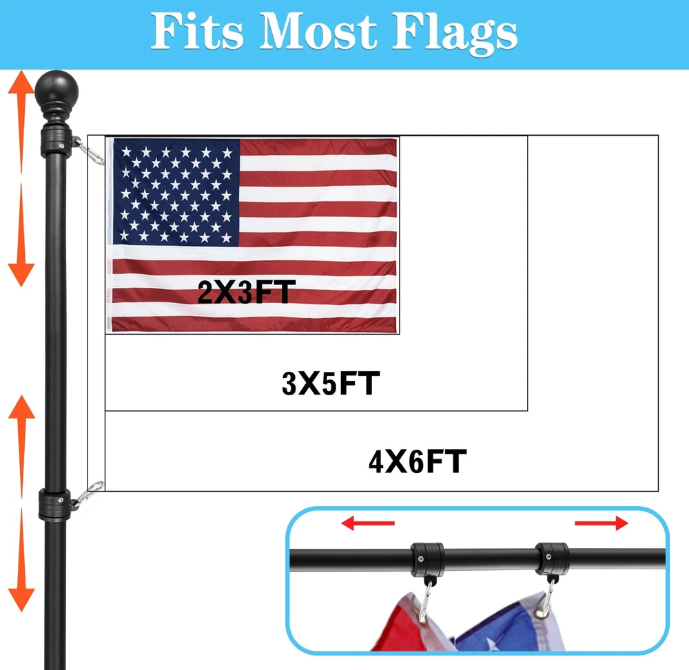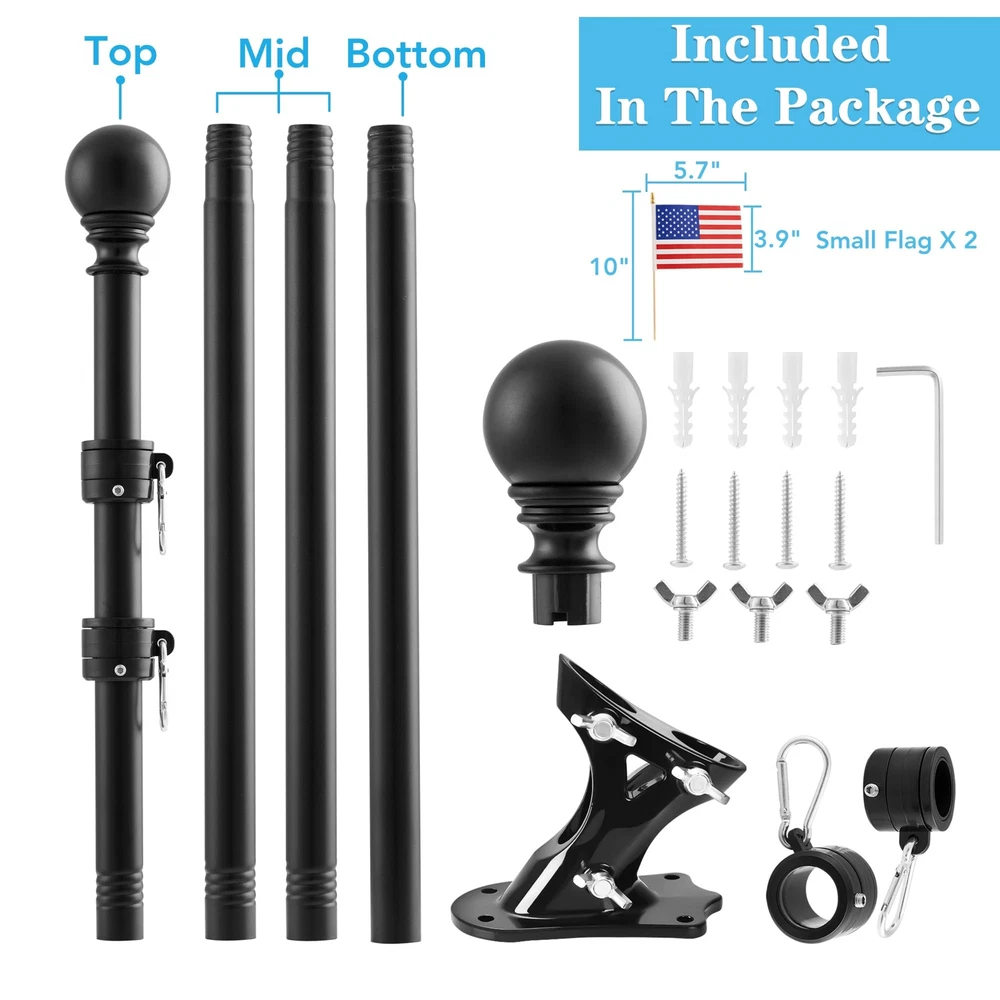 Splice Design: The flagpole is spliced and assembled by threaded connector, it is easy to disassemble and assemble, convenient to carry and save space. Includes 3x5 Embroidered American Flag, 2 small handheld flags. Anti-Trangle Design: specially designed flag rings, which can be rotated 360°, allow the flag to fly in the wind without getting tangled on the flagpole, and you can also install different sizes of flags by adjusting the distance between the rings. Dual Position Holder: The flagpole holder has been designed with positions (90°and 45°) to allow for horizontal flag hanging, or the flagpole can be mounted tilted upwards at 45°. 4 fixing holes are designed on the flagpole holder to make the flagpole more solid. Of course it can also be fitted with a tail end cap to hold it in your hand. Strong And Durable: 1-inch thick diameter and high quality alloy material make the flagpole stronger, rust-resistant and can withstand all-weather outdoor environment. Suitable for Many Scenes: The flagpole comes with holders that can be mounted on walls, roofs, suitable for houses, porches, decks, garages, and patio decorations.