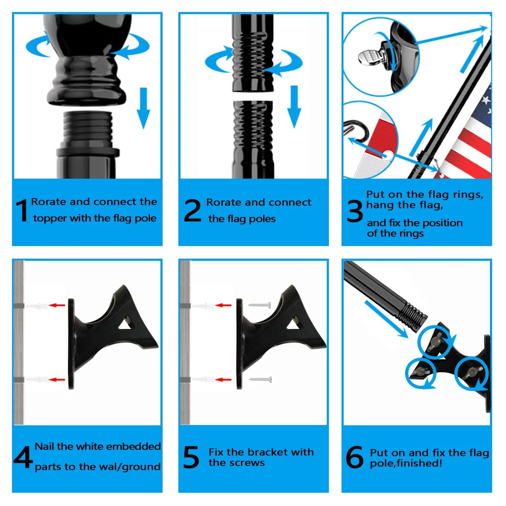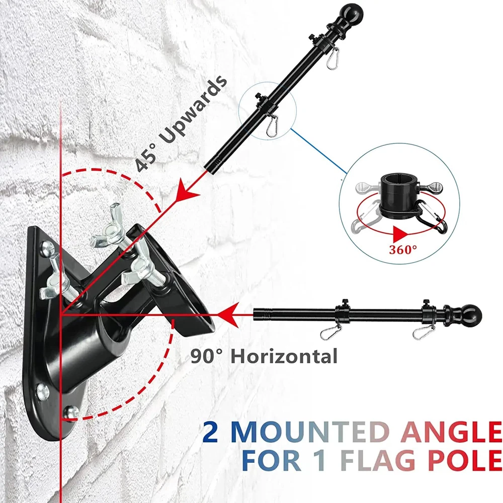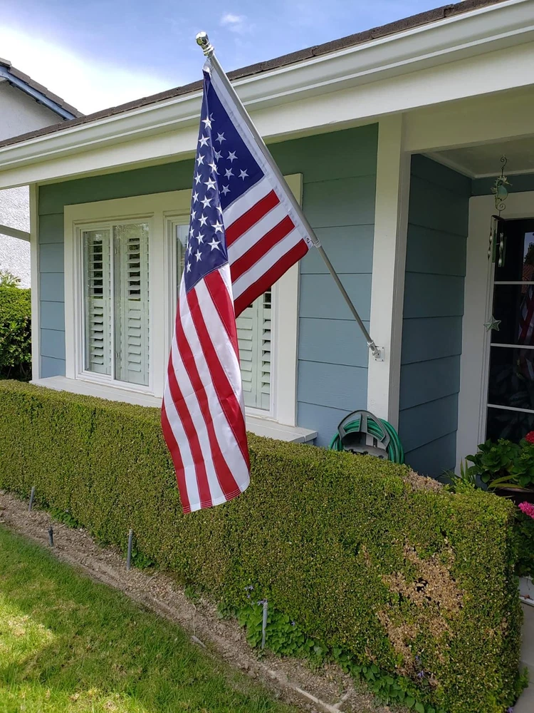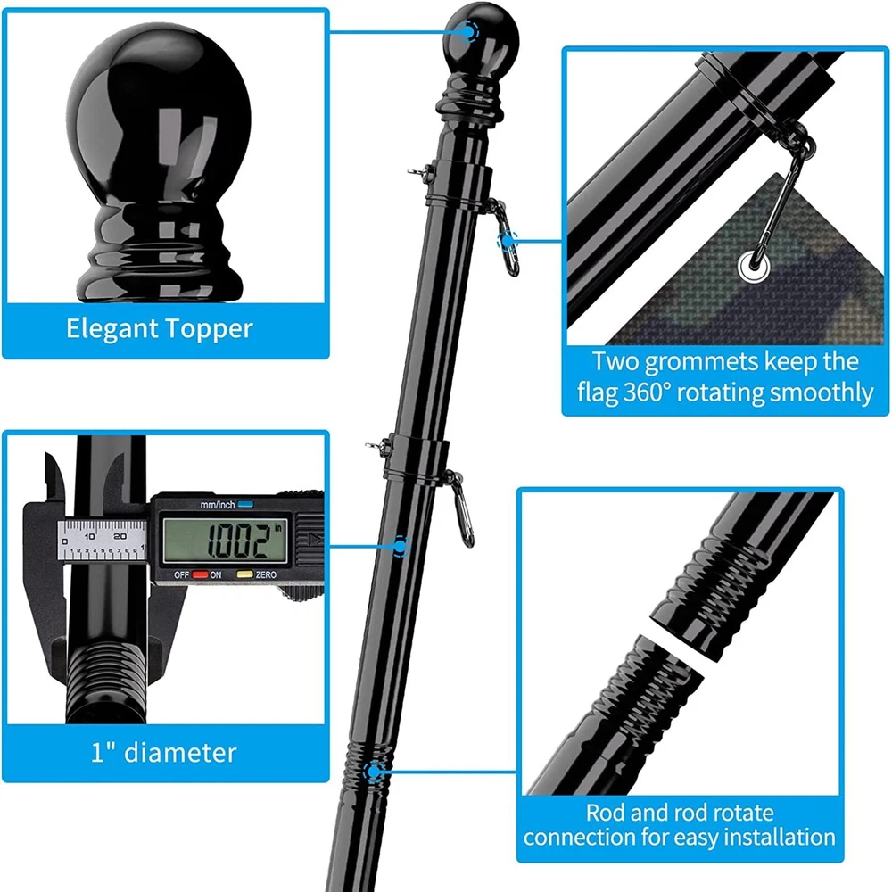 【Sturdy Anti-rust Flag Pole Kit】This 1-inch diameter flag pole kit is made of high quality stainless steel, can be installed in any outdoor environment, can withstand wind and rain in normal weather and will not rust 【Sturdy Anti-rust Flag Pole Kit】This 1-inch diameter flag pole kit is made of high quality stainless steel, can be installed in any outdoor environment, can withstand wind and rain in normal weather and will not rust 【Anti-tangle design flag pole】With two freely rotatable anti-winding rings, let your flag fly freely in the direction of the wind without winding the flagpole 【Suitable for most flags】Our flag pole with adjustable flagpole kit ring is suitable for 2*3/ 3*5 /4*6 flags 【Easy to Assemble and Use】The 4-section threaded flag poles only need to be spliced to each other, and can be easily disassembled and stored when not in use, with dual-Position Aluminum flag pole holder, you can install yours at 90° or 45° flagpole 【Multipurpose flag poles for outside house】: This 5ft flag poles for outside house is a great choice for residential, commercial properties, it can be installed to your yard, garden, house or even a truck with a flag pole holder