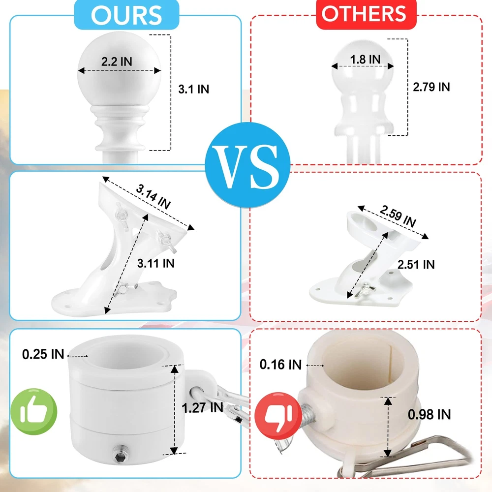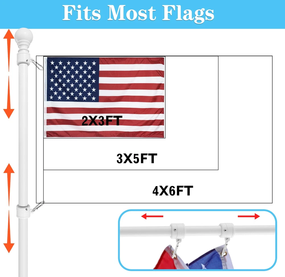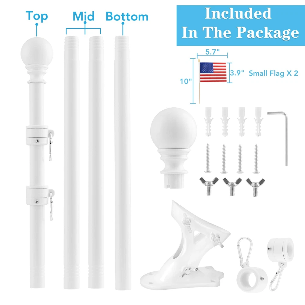 Flag Pole for House-5ft, Flag Pole kit Tangle Free with Holder and a 3x5 In American Flag Metal Flagpole Kit for Outside House, Porch, Yard, Truck, Boat (White) Splice Design: The flagpole is spliced and assembled by threaded connector, it is easy to disassemble and assemble, convenient to carry and save space. ANTI-TRANGLE DESIGN: 360° free rotating anti-tangle ring allows your flag to fly freely in the direction of the wind and won't get tangled on the flagpole. DUAL POSITION HOLDER: You can either hang your flag horizontally or tilt it upwards by 45°. Of course it can also be fitted with a tail end cap to hold it in your hand. STRONG AND DURABLE: 1-inch thick diameter and high quality alloy material make the flagpole stronger, rust-resistant and can withstand all-weather outdoor environment. [Suitable for Many Scenes] The flagpole comes with holders that can be mounted on walls, roofs and even trucks, suitable for houses, porches, decks, garages, and patio decorations. Splice Design: The flagpole is spliced and assembled by threaded connector, it is easy to disassemble and assemble, convenient to carry and save space. Includes one 3x5 Embroidered American Flag, 2 small handheld flags. Anti-Trangle Design: Two specially designed flag rings, which can be rotated 360°, allow the flag to fly in the wind without getting tangled on the flagpole, and you can also install different sizes of flags by adjusting the distance between the two rings. Dual Position Holder: The flagpole holder has been designed with two positions (90°and 45°) to allow for horizontal flag hanging, or the flagpole can be mounted tilted upwards at 45°. 4 fixing holes are designed on the flagpole holder to make the flagpole more solid. Of course it can also be fitted with a tail end cap to hold it in your hand. Strong And Durable: 1-inch thick diameter and high quality alloy material make the flagpole stronger, rust-resistant and can withstand all-weather outdoor environment. Suitable for Many Scenes: The flagpole comes with holders that can be mounted on walls, roofs, suitable for houses, porches, decks, garages, and patio decorations.