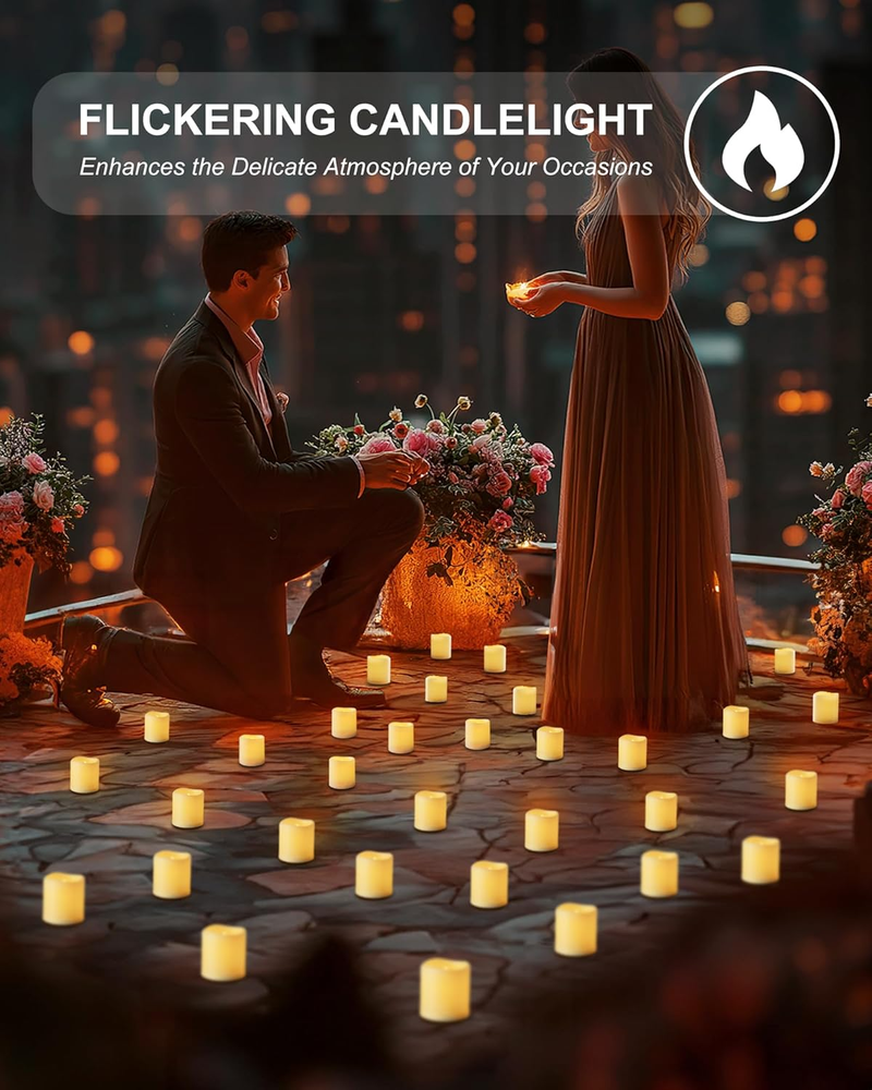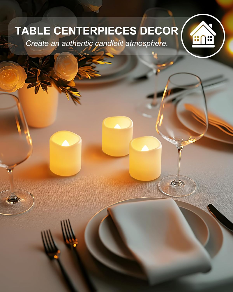 Long Lasting 200+Hour: These led votive candles(1.5"D x 1.6"H) come pre-installed with premium CR2032 batteries and will provide 200+ hours of continuous use. Easy to Use and Maintain: These candles eliminate concerns about fire hazards. They are also easy to maintain and reusable, allowing you to enjoy their beauty over and over again. Brightest Soft Light: These votive candles feature a realistic warm flicker, using latesting LED beads to emit bright, uniform soft white light. The pale yellow glow simulates a real candle, creating a cozy and warm ambiance. Safety First: These votive candles are thoroughly tested to ensure their reliability, and the secure battery cap design further enhances their safety. With (UN38.8) internationally certified batteries and healthy polypropylene materials, plus a secure battery cap design. Versatile Use: Perfect for home decoration, parties, events, and even as gifts. Their portable size makes them easy to carry and transport. You can take them with you to a picnic, a beach party, or any other outdoor gathering. Product Description