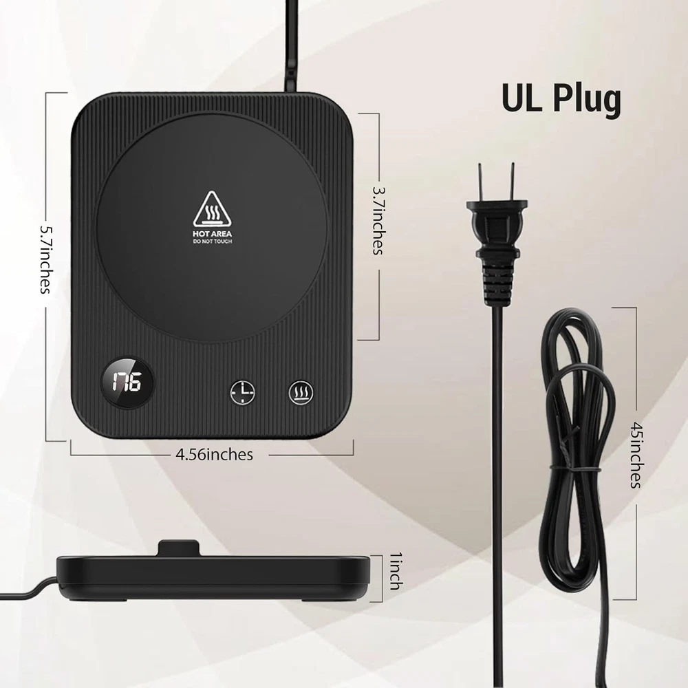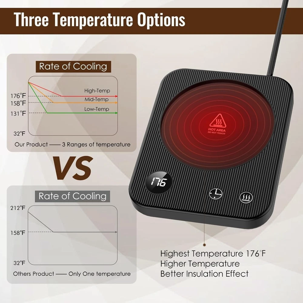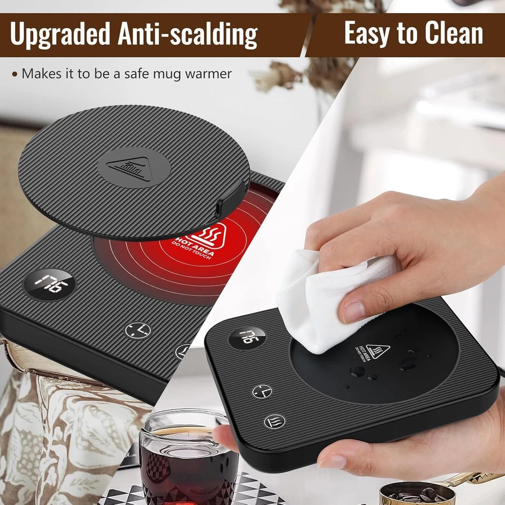 Model 2 ๐ฅโ๐๐ฐ๐จ ๐๐๐ฆ๐ฉ๐๐ซ๐๐ญ๐ฎ๐ซ๐ ๐๐๐ญ๐ญ๐ข๐ง๐ ๐ฌ --18 Watt coffee mug warmer with two temperature settings, maintaining your beverage temperature between high-temp: 122โ-140โand low-temp: 104โ-122โ. Mug warmer is neither too hot nor too cold. ๐ฅ๐ต๐๐ง๐ ๐๐จ๐ฎ๐๐ก ๐๐ฉ๐๐ซ๐๐ญ๐ข๐จ๐ง --Simply plug the cord, open the switch and put your mug on. Now the coffee mug warmer will keep your drink warm to the last. One Sensitive-touch button design to turn coffee warmer on/off, setting temp and enjoy your warm beverage. Mug warmer is simple operation and easy to use. ๐ฅ๐ฅค๐๐ง๐ญ๐ ๐ฅ๐ฅ๐ข๐ ๐๐ง๐ญ ๐๐ข๐ฆ๐๐ ๐๐๐ฌ๐ข๐ ๐ง --Timed shutdown mode, freely press the clock button to set the time between 1-12 hours, warm drink available at your wanted time. Coffee cup warmer will auto-power off 8 hours after the last operation by default. Safe and energy efficient. No worries about forgetting turn mug warmer off. ๐ฅ๐ฅ๐๐๐ญ๐๐ซ๐ฉ๐ซ๐จ๐จ๐ & ๐๐จ๐ฆ๐ฉ๐๐๐ญ --Candle warmer is made of tempered glass and aluminum alloy, without security concern for splashing or spilling water on the heating plate. Coffee warmer is waterproof and easy to clean, which has rubber non-slip foot pad, stable and not easy to slip off. Mug warmer only 0.7in thick, easy to carry. ๐ฅ๐ฅ๐๐๐ญ๐ญ๐๐ซ ๐๐๐๐ญ๐ข๐ง๐ ๐๐ฅ๐๐ญ๐ --Coffee warmer plate without groove, fit most cups (glass cup, stainless steel cup, ceramic cup etc). We recommend using the cup with flat bottom for better heating different beverages (coffee, tea, hot chocolate, milk and cocoa). Placing a lid over the mug also help retain heat. ๐Coffee mug warmer not support to boil liquids. ๐ฅ๐ฏ๏ธ๐๐๐ซ๐ฆ๐ฌ ๐๐๐ง๐๐ฅ๐๐ฌ ๐๐๐๐ ๐๐ญ --Besides keeping coffee hot, mug warmer can also melt candles to give the room a lovely scent without an open flame. Choose a candle in an appropriately sized glass or ceramic vessel that's safe to use with your candle warmer, and that's really all there is to candle warmer. Model 1 3-Temperature Mug Warmer - The coffee mug warmer is designed with 3 adjustable temperatures. You can choose one heating temperature you prefer and enjoy your hot drink with our coffee warmer. Whether you like the beverage to be extremely hot or warm, the mug warmer for desk can satisfy your needs and work safely during heating. 2-12H Auto Shut Off - The coffee cup warmer can work long hours and shut itself automatically. There are 6 different working hours that you can set for the coffee warmer for desk, ranging from 2 to 12 hours. The coffee cup warmer for desk will keep heating before the time is over. Cup Warmer Prevent Scalding - The coffee mug warmer for desk is equipped with a silicone pad which can insulate the heat. The silicone of the cup warmer for desk can avoid scalding and safely heat the drinks. Waterproof Tea Warmer - The coffee warmer plate is made of waterproof materials. So the liquid wonโt penetrate into coffee warmer for desk auto shut off. Also itโs easy to clean the cup warmer for coffee simply by washing and wiping. Digital Screen with Status - You can check the temperature and time settings anytime on the digital display of the mug heater. The little screen can show the current status of the electric mug warmer. Thoughtful Coffee Gifts - Our mug warmer auto shut off is simple, useful and suitable for cold winter. If you are confusing about how to choose office gifts or the coffee gift, our coffee heater will be a nice option. The mug warmer is able to warm the beverage and accompany you, your families and your friends in the coming winter. THANK YOU