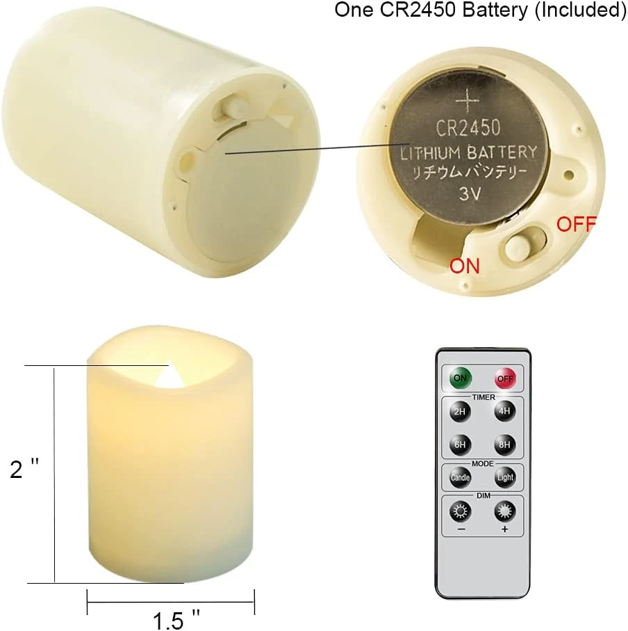 Neighborhood service Flameless Flickering LED Votive Candles with Remote, Battery Operated Tealights Battery Included,Warm White Light 1.5 X 2 Inch Set of 6 for Christmas Decoration ENJOY THE FEATURES 6 Long Lasting Batteries Included: Each votive tea light candle comes with high capacity CR2450 battery which have 350+ hours of light time. You don't need to change the battery frequently. You will enjoy a longer run time with these votive tea lights Remote Control & Easy to Use: With the remote, you can control these led tealights on or off easily. Also simply switch on/off on the bottom of votive tea lights Flickering with Warm Soft Light: Our tea light candle looks and flickers like a real candle and glow with soft warm white light, also worked great inside your votive holders or other holders. A perfect addition to your Christmas holiday decorations Safe Comes First: These LED tea lights can be used without having to worry of flame, absolutely no fire hazards or burning risks, safe for families with pets or kids. Can be widely used for Thankgiving Day, Christmas, birthday, wedding, church, party, bar, home, temples, beach Satisfaction guarantee: Each led tea light is thoroughly tested before leaving the factory, if any problems occurs to our products, please kindly contact our customer support and we will offer you a satisfactory solution Product Description Specification: Material: Plastic Color: White Diameter: 1.5" Height: 2" Light Color: Warm White Battery: CR2450 Included Timer: 2/4/6/8 Hour Remote: 10-Key Remote Package Information: 6 x White Flameless Votive Candles 1 x 10-Key Remote 1 x User Manual Plastic Resin High quality durable plastic candle shell. heat resistant allow you can use them for years ON/OFF Switch 2-Way slide switch on candle bottom, turn off the switch if plan not to use frequently CR2450 Battery Included Each candle comes with one CR2450 battery, nearly 300 hours long lasting life Warm Light Amber white light creates a warm and romance atmosphere in your room 10-Key Remote ON/OFF Make sure all candles bottom switch at ON status, then you can use the remote control all candles to turn ON/OFF with one convenient press 2H/4H/6H/8H Cycle Timer Once the timer is set, candle will run into a cycle timer mode, for example, if you set the 4H timer at 18:00, candles will light on for 4 hours and automatically turn off at 22:00, and will light up again at 18:00 next day, cycle every day Candle/Light Mode This mode function is to help you switch candle flickering or non-flickering. Flickering mode is more like real candles, non-flickering provides a steady light Dimmable Decrease candle light Increase candle light Light Source Type LED Item model number 02040006 Style Classic Number of Items 1 Power Source Battery Powered Pattern Solid Number of Light Sources 1 Control Method Remote Cutting Diameter 1.5 Inches Is Electric No Batteries Included? No Lighting Method Uplight Lamp Type Floor Lamp Number of Pieces 1 Room Type Bedroom Bulb Shape Size T6 1/2 Product Dimensions 1.5"D x 1.5"W x 2"H Material Plastic Shape Candle Installation Type Decoration Controller Type Remote Control Is Discontinued By Manufacturer No Specific Uses For Product Thanksgiving Day, Christmas, birthday, wedding, church, party, bar, home, temples, beach, decoration, indoor, outdoor Included Components Shade included Indoor/Outdoor Usage Indoor Water Resistance Level Not Water Resistant Batteries Required? No Assembled Diameter 1.5 Inches Item Weight 200 Grams Connectivity Technology IR Connectivity Protocol Infrared Special Features Cycle Timer, Dimmable, 10-Key Remote, Plastic, 2-Way Switch Special Feature Cycle Timer, Dimmable, 10-Key Remote, Plastic, 2-Way Switch Part Number CD3VSL-6W Shade Color White Mounting Type Tabletop Color D-6 Pack White Remote Wattage 1.5 watts Is Cordless? Yes Base Material Plastic Is Waterproof false Batteries 1 CR2 batteries required. Voltage 3 Volts Recommended Uses For Product Decoration Shade Material Plastic Switch Type Toggle 1.5 "h x 1.5 "h x 2.0 "h. Weight: 200.0 grams PAYMENT We accept all payments via Ebay using Credit Cards , PAYPAL , Apple Pay and many others SHIPPING We are always working hard to ensure your package arrives as soon as possible. Please understand that some factors like weather, high postal traffic, and the performance of shipping companies are outside of our control. We offer free shipping to the lower 48 states and ship within 3-5 business days of payment, usually sooner. We do not accept P.O. Boxes. Please provide a physical address. We do not ship internationally at this time. DELIVERY & RETURN POLICY We do not offer returns unless the item violates eBay policies. Please be aware these polices only make sellers accept returns if the item violates eBay's Buyer Guarantee. If you would like to learn more about this please visit eBay's Help Page. Thank you for your business