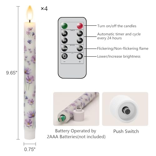 Return Policy Fast Delivery Trusted seller Purple Flowers Flameless Taper Candles with Remote Timer, LED Taper Candles Battery Operated Warm 3D Wick Flickering, Real Wax CandleSticks, Wedding Birthday Christmas Decor Product Description Charming Floral Accent: These flameless taper candles are adorned with beautiful purple flower designs, adding a touch of elegance and color to any decor, making them perfect for weddings, birthdays, or holiday celebrations Realistic 3D Flickering Effect: Featuring a 3D wick, these LED taper candles create a lifelike flickering flame, providing a warm, inviting glow that enhances the atmosp without the risks of open flame or wax drips Battery Operated for Safety: Powered by batteries, these flameless candles offer a safe, convenient alternative to traditional candles, ideal for homes, events, or settings w open flames are a concern Remote Control and Timer: With a remote control and timer function, you can effortlessly turn the candles on and off and set them to run for specific time intervals, providing added convenience and energy efficiency Versatile and Elegant Decor: Made with real wax exteriors, these taper candles are a versatile addition to any decor, adding a sophisticated and romantic touch to dining tables, mantels, or any festive occasion like weddings, birthdays, or Christmas Shipping Returns Payment Shipping Shipping is FREE to all addresses other than APO/PO boxes in the lower 48 states. All our stock ships from US-based warehouses. Shipped via USPS or UPS (depending on location and package weight) Unless stated otherwise, all orders will ship within 24-72 hours of your payment being processed. Check our feedback to see the great reviews of FAST shipping we offer. Returns Seller does not accept returns Payment We currently accept payment via eBay managed payments only. Once payment is cleared, we will dispatch your shipment within 1-3 business days. Please refer to the "Shipping" tab for more information regarding shipping speed to your destination.