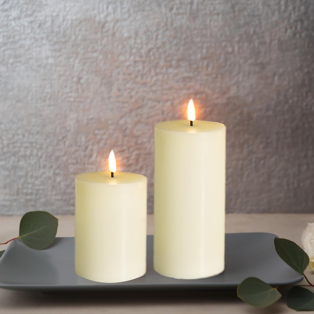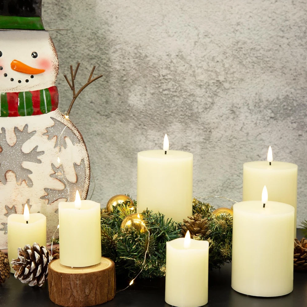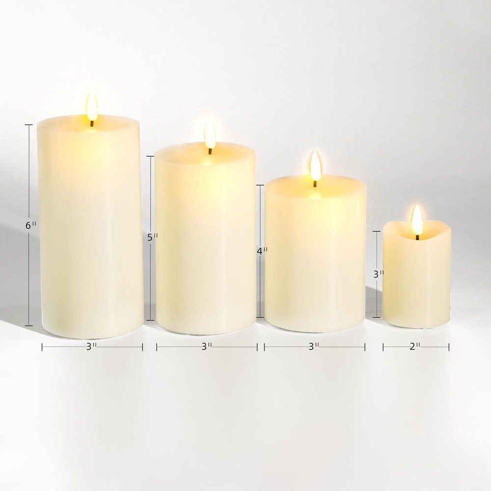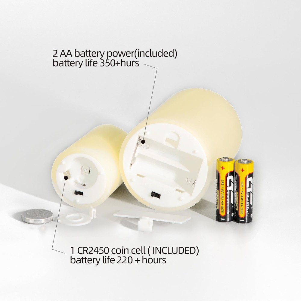 Ivory Flameless LED Pillar Candles with Remote Assorted Size, Flickering Battery Operated Candles Set of 7 These electric LED candles are made with real wax and 3D still flickering flame that gives off a warm, natural-looking glow, a perfect addition to your home or special occasions, like christmas, wedding, party, dinner, date! Why Choose Flameless LED Candles? Most Realistic - these led candles is coated with paraffin wax, simulated with flickering 3D black wick, it is too realistic to fool your eyes especially lit up -Long Battery Life & Battery Included - batteries was equipped in each candle, 3 inch diameter led candle takes 2 AA batteries, 2 inch diameter candles takes 1 cr2450 coin cell, lasting over 350+ hours. Convenient Remote & Timer Function - remote controller allows you to control all candles within 20 ft, including turning candles on/off, set 2/4/6/8 hours timer, adjust brightness, set flickering effect. Great Decoration & Gift - these battery candles give off a soft warm glow, bringing the most realistic experience to any room and a candly vibe in the room while flameless, dripless, smokeless, windproof, great decoration for home, seasonal festival holiday, party and also ideal gifts for birthday, holiday, housewarming etc. Package Included - 7 pieces real wax led candles in ivory color, 1 x remote controller and user manual. More Tips: -This candle is made of real wax, please keep out of direct sunlight, away from heat sources and out of extreme temperatures or your candle may soften or melt. Realistic Flameless Candles - these ivory candles are coated with real wax, simulated with flickering black wick flame, it is too realistic to fool your eyes especially lit up. Remote Control & Timer Function - Each candles set comes 1 remote controller, which allows you to control power, set timer, adjust brightness, set flickering or static flame effect within 20 feet Battery Included & Long Battery Life - no need to prepare batteries, when you get this flameless candles set, you can enjoy it. Each pillar candle takes 2 AA batteries (INCLUDED), each votive candles takes 1 CR2450 coin cell (INCLUDED), remote takes 1 cr2025 coin cell. Safe & No Mess - Lifelike look while unscented, no drips, no smoke, no hazard, our candles safely go where traditional flame candles can’t, perfect for your home with kids and pets. Great Decorations & Gifts - package includes 7 pieces ivory flameless candles with remote, great decoration for Halloween, party, wedding, home and ideal as gift for housewarming, birthday, seasonal holiday festival and so on.