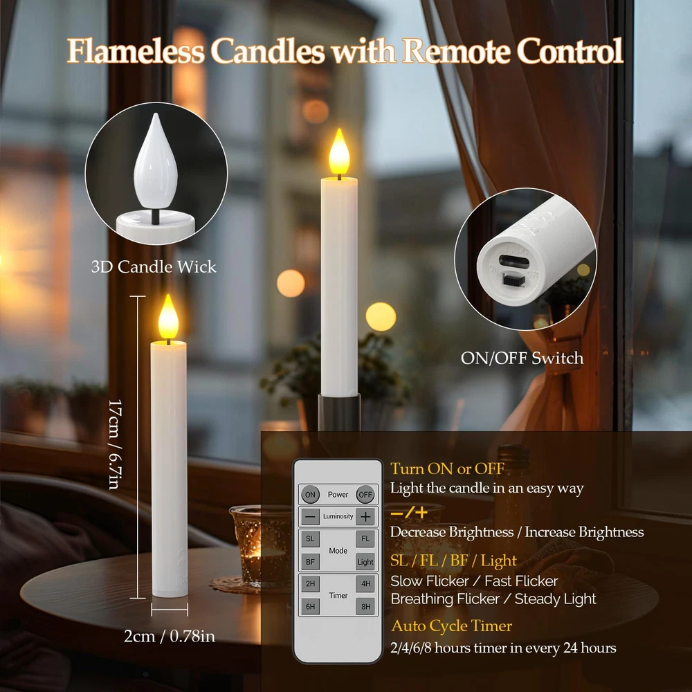 No Batteries or Future Expense Required - Rechargeable function eliminates the need for you to purchase additional batteries. Ideal for everyday home use as well as for wedding table decor. Good choice as Thanksgiving/Christmas gifts, show your best wishes for family & friends. with Convenient Charging Station - Simply laying your rechargeable flameless taper candles on the charging station. Fully charged in 2 hours, provides more than 200 hours of warm candlelight under the medium brightness, or longer if you dim the light via the remote! More than 20,000 hours of lifespan, durable to use! Fits Most Candle Sticks Holder Decor -【Candle Size: Height 6.7" x Diameter 0.78", makes it match with most candelabra (it can also stand alone).】Set them into your Halloween taper candle holders or placed them on the Thanksgiving centerpieces for tables or use them as Christmas window candles to to create festive atmosphere. Flameless Candles with Remote Control - Turn these taper candles ON via the bottom switch first, then you can adjust the light effect, flicker frequency, brightness with the remote - which is great if you put them up high or hang them on a chandelier/bookshelf for Halloween/Christmas Themed party. And you can also set a cycle timer for 2/4/6/8 hours. Versatile Decorative Rechargeable Candles - Elevate any space with the warm and enchanting glow of these rechargeable reusable taper candles. Classic white color shows the real taper candle appearance. Updated flickering effect as natural as breathing. Perfect for adorning homes, fireplace, tables, parties, weddings, bedrooms, and various events throughout the year. Flameless LED Taper Candles Set -【You Will Get: 10pcs Flameless Candles with Remote + 1*Charging Station + 1*USB Charging Cable. Designed box is nice as a gift.】Our flameless candles have been tested before sale. If any quality problems, please feel free to get in touch with our store customer service and we will offer you a satisfactory solution within 24 hours. Note: Please fully charge the battery for the first time. For each charge after that, deplete the battery completely before recharging to extend its lifespan.