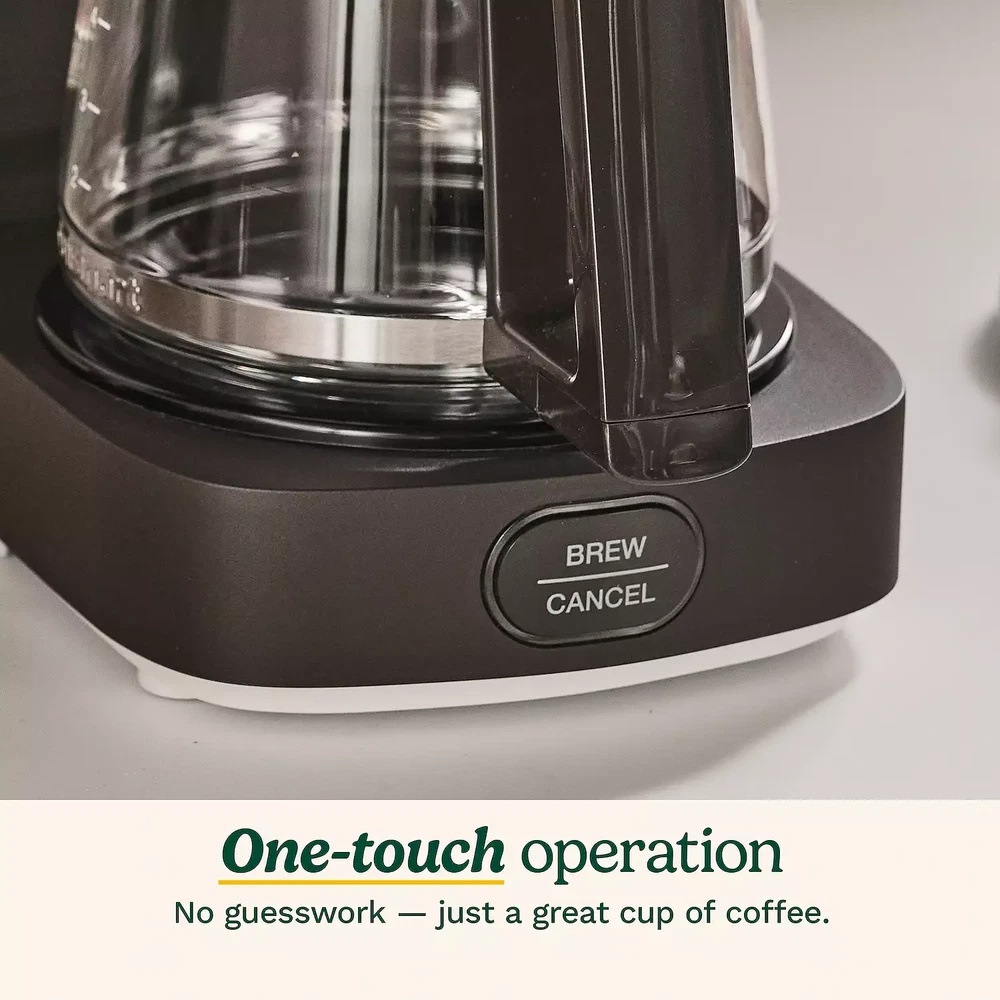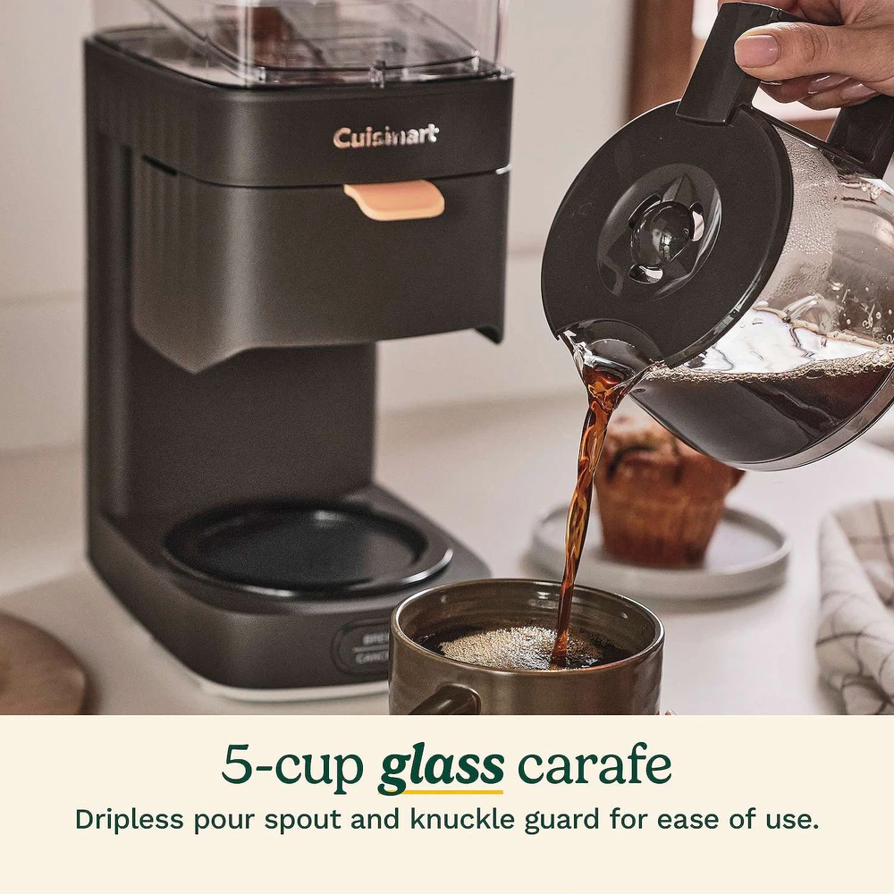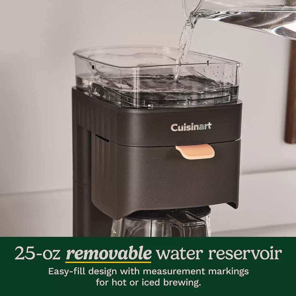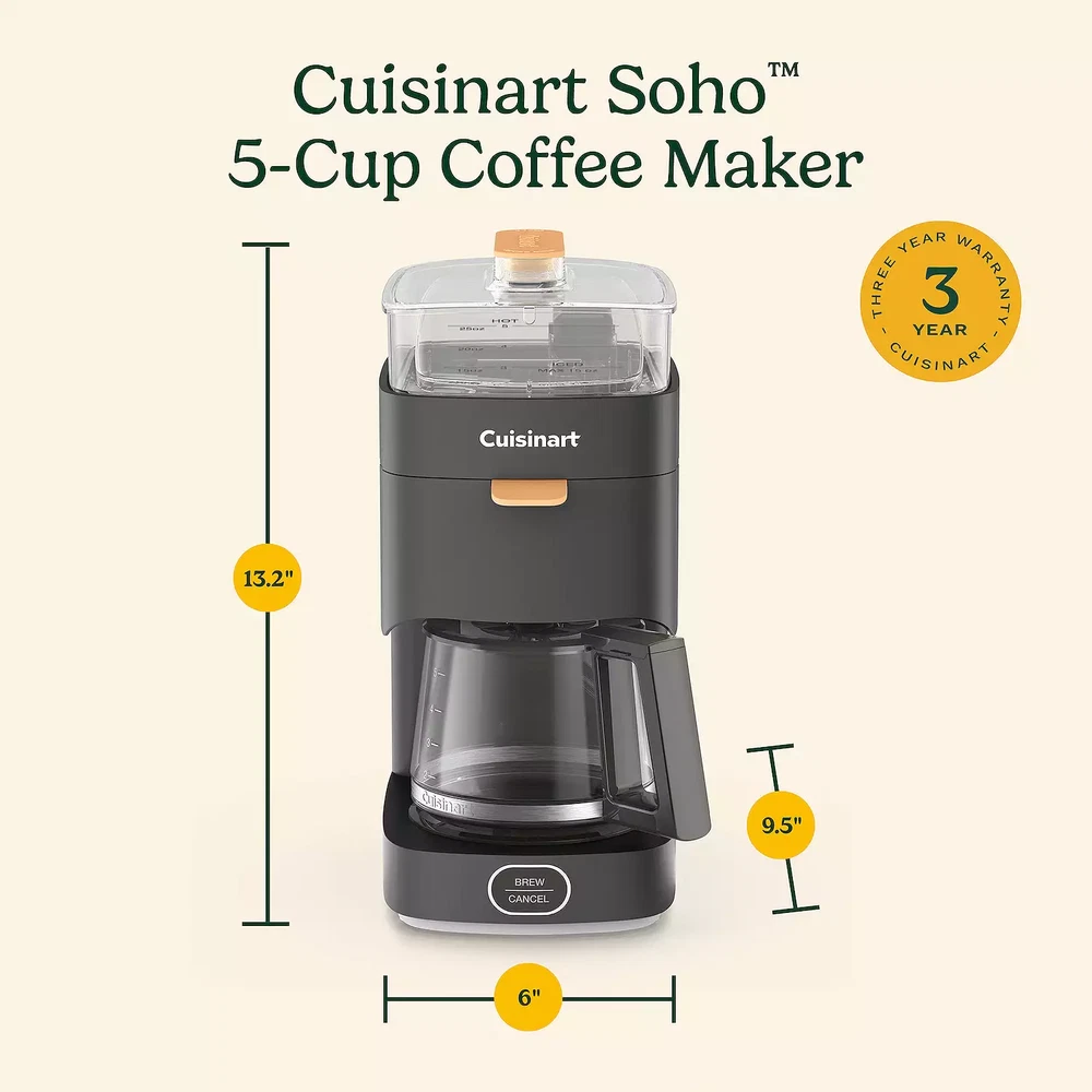 Start your day the right way -- with a steaming cup of coffee out of this Soho 5-cup coffeemaker from Cuisinart. FEATURES Dripless pour spout and knuckle guard Removable 25oz. water reservoir with measurements guide for Hot or Over Ice Brewing Easy one-touch button operation for hassle-free coffee brewing Integrated coffee scoop storage built into the top of the machine Brew Pause™ feature allows you to pour a cup of coffee before brewing has finished Integrated cord storage frees up counter space and makes for easy storage CONSTRUCTION & CARE Material: Plastic Hand wash DETAILS Dimensions: 13.2" x 5.9" x 9.5" Capacity: 5 cups Product weight: 4.3 lbs. Power usage: 550 watts Cord length: 30 in. 3-year warranty Imported