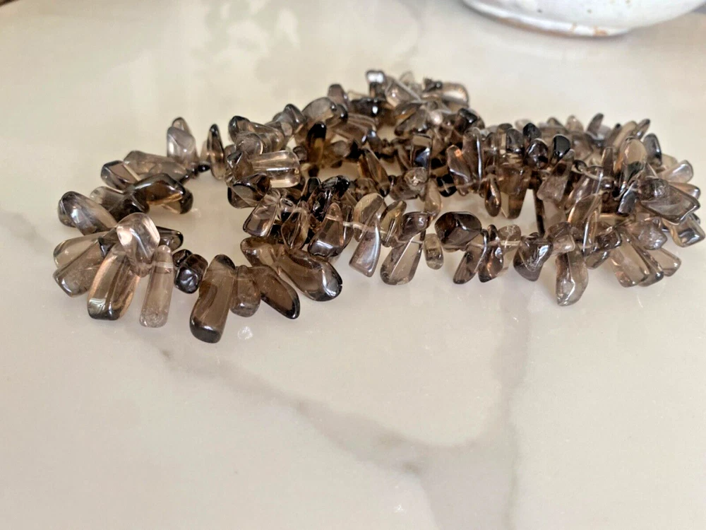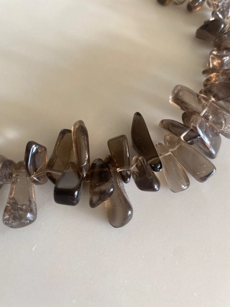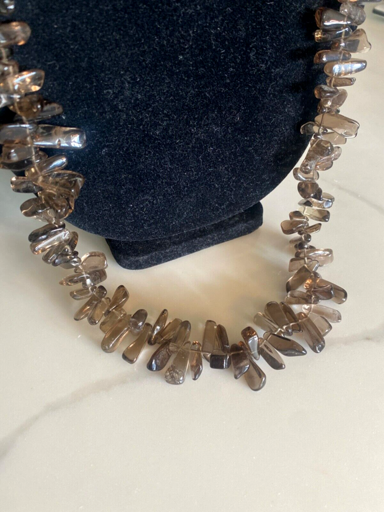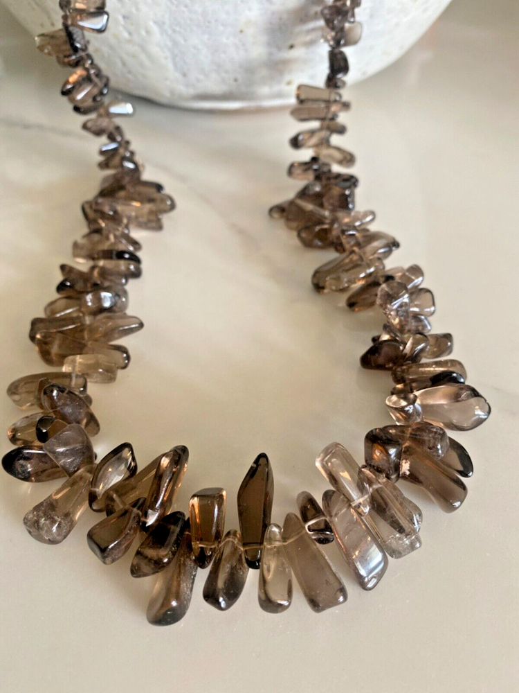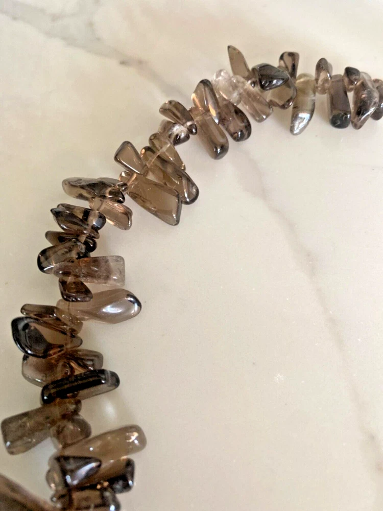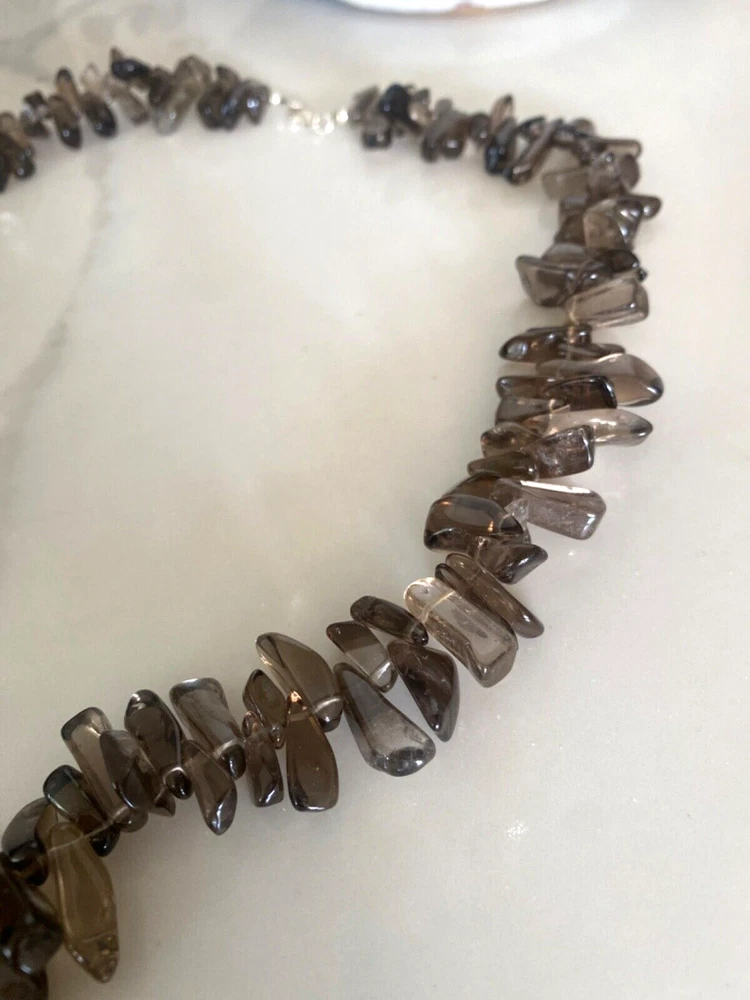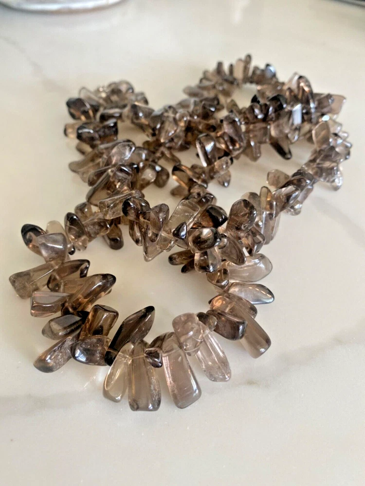 Gorgeous Polished Free Form Natural Smoky Quartz Beaded Long 36” Necklace Sterling Silver Clasp Features highly polished smooth free form natural Smoky Quartz beads with a sterling silver 925 lobster clasp closure. Wea it long or double it for a layered look! Smoky Quartz is a variant of the Quartz mineral family which ranges in color from a light gray to darker gray/brown/black and can be transparent to barely translucent. It is the national gem of Scotland, and sacred to the Druids in Celtic cultures. Hecate, the ancient Greek goddess was also associated with Smoky Quartz. Smoky Quartz is thought to help one become balanced and grounded especially with a chaotic life. These beautiful transparent Smoky Quartz beads are not uniform in size, with the smaller pieces measuring ~ 10mm x 6mm and the larger ~ 28mm x 16mm. It is in very good condition. No missing or broken stones. Please see all photos. Shipped USPS Ground Advantage. Message me with any questions. Thanks for looking!