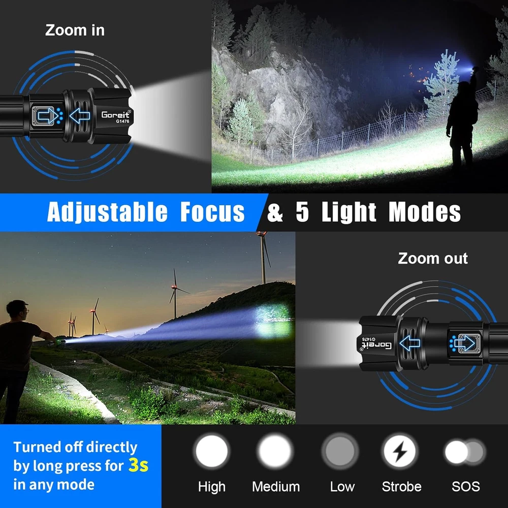 【990,000 LUMEN LED FLASHLIGHT】: Goreit flashlights high lumens utilizes upgraded XHP70.2 LED, which is stable and super bright and provides an incredibly powerful lighting, 10 times brighter than other normal led flashlights. A 120 square meter room can be illuminated without any problems, you can also focus on objects up to 1640FT away. This flashlights high lumens rechargeable is an ideal gift for mate, family, friends,colleagues, etc. 【USB RECHARGEABLE FLASHLIGHT & LONG WORKING TIME & POWER INDICATOR】: This rechargeable flashlight has been completely improved to shorten the charging time and extend the service life, which can provide up to 12 hours (Low mode) of powerful, non-diminishing brightness. Built-in USB charging interface, flash light can be charged through socket and laptop, convenient for indoor and outdoor charging. The LED display shows the power level exactly(25%, 50%, 75%, 100%). 【WATER RESISTANT & HEAVY DUTY FLASHLIGHT】: This IP67 waterproof flashlight is developed for rough handling and can withstand a fall of 5m or be temporarily submerged under water. This bright flashlight can even be frozen, run over by a truck, and it still works! Suitable for use in rain, snow, or emergency situations. The high powered flashlight made of aerospace grade aluminum can protect the convex lens from damage, and in emergencies it can also be used for Self-protection. 【ADJUSTABLE FOCUS & 5 LIGHT MODES】: This handheld flashlights has 5 lighting modes: High-Medium-Low-Strobe-SOS. You can turn off the rechargeable flashlights by long pressing the buttons for 3s in any mode. Depending on your needs, you can stretch the head of the flashlight to adjust the focus, freely choose the spotlight for remote viewing and the floodlight for large-area lighting. It is ideal for camping, hiking, climing, running, night walking, emergencies or the general household use. 【EXCEPTIONAL VALUE & BUY WITH CONFIDENCE】: Package contents: 1x Goreit super bright flashlight rechargeable with charging cable, 3x AAA Alkaline battery, 1x flashlight holster, 1x gift box and user manual. We have carefully checked all items before shipping and make sure the product is working properly, if you have any questions please contact our great customer service for a best solution within 24 hours. Product Description Goreit G1476 led flashlight rechargeable with 990,000 lumens can easily illuminate a distance of almost 500m and has a service life of up to 100,000 hours. Provides people with a reliable and convenient lighting tool. Super bright LED flashlight with high lumens and large range. Made of high quality aluminum alloy material, water resistance, super bright light and long service life, this high powered flashlight is great for camping, hiking, night running, fishing, climbing, hunting and some outdoor activities, Including family emergency (in the event of a power outage, circuit maintenance, etc.). ADJUSTABLE FOCUS Goreit G1476 flashlight telescope zoom allows you to choose the focus between spotlight and floodlight. Spotlights for remote observation and floodlights for large-area illumination. The spotlight for remote observation can easily illuminate a distance of nearly 500 m. HOW TO INSTALL? (Warning: do not remove the blue packaging) USB input and output USB CABLE INCLUDED, you can charge Goreit G1476 led flash light from your laptop, plus socket, computer. Unlike other led flashlight, Goreit G1476 led flashlight can prevent overcharging, which can protect the flashlights well. In addition, Goreit G1476 led flashlight can be used as emergency equipment to charge your devices in an emergency. 6 Advantages of Goreit G1476 Flashlight XHP70.2 LED Flashlight Super Bright The advanced XHP70.2 LED chip is built into the high lumens flashlight, stable and bright light, it can easily illuminate every corner of the whole yard. 990,000 lumens, 5000K daylight can illuminate things clearly within 500m, allows you to use it as a brightest long-range flashlight. High Powered Rechargeable Flashlight This High Lumen rechargeable flashlight can reach up to 12 hours (Low mode) working time; rechargeable flashlight and upgraded version of overcharge protection, the flash light will stop charging when it fully charged, so that you don't need worry about the safety issues when you forget the flashlight is in charging. LED Flashlight with 5 Light Modes 5 modes: High, Medium, Low, Strobe and SOS can meet your different occasion needs. Press the power button to toggle between the lighting modes. Press for 3 seconds to turn off the light in any mode. Rechargeable Flashlight with Power Display Our rechargeable Flashlight adds 4 small LED indicators 100% -75% -50% -25%, you always know exactly how much power and charge it in time. IP67 Waterproof and Durable Goreit G1476 led Flashlight is made of a durable aluminum alloy. It has high shock resistance and can withstand an impact from a height of 3 meters. With a waterproof rating of IP67, it can be used in various extreme weather conditions, but it cannot be submerged or immersed in water for an extended period of time. Rugged Design High-strength aviation aluminum alloy make it wear and hit resistance, it can protect you from danger in emergency situation.