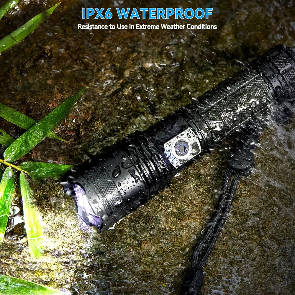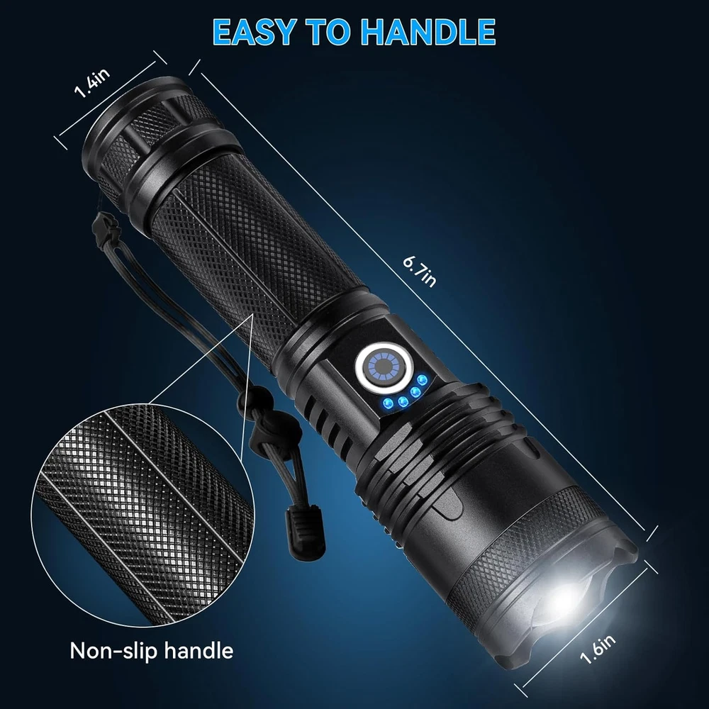 【990000 LUMENS FLASHLIGHT】Our flashlights high lumens is 30 times brighter than a regular led flashlight, and it can effortlessly illuminate an area of 200 square meters, with a maximum illumination distance of up to 3,280 feet. With an astonishingly high lumen output, offer exceeding 990000 lumens, this flashlight effortlessly pierces through darkness, illuminating the darkest corners and casting a brilliant, far-reaching beam of light 【LONG RUNNING TIME】Equipped with high-capacity rechargeable bāttery, and efficient led chip, our rechargeable flashlights high lumens can last up to 12 hours of continuous use without worrying about frequent recharging, making the rechargeable led flashlight a reliable companion during extended outdoor adventures 【5 LIGHTING MODES】The rechargeable high lumen flashlight offers 5 lighting modes: high, medium, low, strobe, and sos, to meet various scenario requirements. You can easily adjust the beam through the flash light head, switching between a wide beam light for close-up tasks and a concentrated beam light for long-distance visibility 【USB FAST CHARGING】The rechargeable flashlights features a built-in fast charging chip with a USB intelligent charging port, resulting in a 30% increase in charging speed. It only takes 3 hours to fully charge. The four indicator lights on the flash lights high lumens rechargeable provide clear bāttery status updates (25%, 50%, 75%, 100%) 【STRONG BEAM】Compared with other powered led rechargeable flashlights, our flashlights chip has a longer range, clearer edges, stronger beam, no annoying grid lines, clearer field of view, and is more suitable for activities such as field searching and patrolling 【IPX6 WATERPROOF】Our led flashlights high lumens is built to withstand the elements with its waterproof of IPX6. The bright camping flashlight features a sturdy construction, tight seals, and strong aluminum alloy materials, ensuring it can operate fully even in the harshest wet conditions 【TWO-YEAR WARRANTY】Sigoobal pays attention to product quality, and every flash lights passes strict quality inspection. We provide 30-day no-reason returns and a two-year warranty, please be confident to buy. Please feel free to contact us via the Amazon Message Center for any issues, we will always provide satisfactory solutions to your problems Product Description Introducing This Flashlight Our flashlights can be used in many situations, from navigating through dark spaces to signaling for help. Our rechargeable flash lights are widely used in outdoor activities such as camping, hiking. These powerful flashlights are also essential in emergency situations such as power outages, and search operations. Moreover, they are used in various professions such as mechanics, electricians, and plumbers to illuminate dark and tight spaces. So if you're looking for a flashlight that will never let you down, choose ours. With its unwavering reliability and powerful performance, it's sure to become your go-to tool for any adventure or emergency. BATTERY POWER : Our high lumens flashlight provides a runtime of up to 12H and more than 3-5 hours in high mode, plenty for your longest workdays orbackcountry adventures LONG-LASTING ΒATTERY : With an impressive bāttery life, you can rely on this flashlight for extended periods. Whether you're camping in the wilderness or facing a power outage, it won't leave you in the dark. LONG SERVICE LIFE : The LED flashlight with high lumens incorporates a smart chip to prevent overcharging and over-discharging, extending the flashlight's lifespan to up to 200,000 hours.The flashlight has been tested to endure over 150,000 recharge cycles USB CHARGING : With the included USB charging cable, you can use any USB universal device(such as a power bank, car socket, computer, laptop, etc) to charge the flashlight, A full charge takes about 5-8 hours POWER DISPLAY : The power indicator can display accurate flashlight power, 4 blue LEDs presents 25-100% power display. Showing you up-to-date on BATTERY status BRIGHT AND EFFICIENT : Equipped with powerful LEDs, this flashlight emits a brilliant and energy-efficient beam of light. Its adjustable beam allows you to convert in a narrow beam or a wide light QUICK SWITCH : Deep press 2-3 seconds under any modes to turn off without cycle through all modes 5 LIGHTING MODES : Customize your illumination with various lighting modes, including high, low, strobe, and SOS. These options ensure you have the right level of brightness for any situation. 990,000 HIGH LUMENS : Our led rechargeable flashlight can effortlessly illuminate an area of 200 square meters, with a maximum illumination distance of up to 3,280 feet COMPACT AND PORTABLE : Its sleek and compact design makes the camping flashlight easy to carry in your pocket, backpack, or glove compartment, ensuring you're always prepared wherever you go USER-FRIENDLY : Ergonomically designed for comfort and ease of use, this handheld flashlight features a non-slip grip and a convenient wrist strap, ensuring it's always within reach when you need it most IPX6 WATERPROOF: The high lumen flashlight has waterproof rubber ring at the charging port and the lamp head, can be used in rain, storm, and any challenging weather conditions STRONG CONSTRUCTION : Crafted from high-quality materials, this flashlights high lumens rechargeable is designed to endure rugged terrain and harsh conditions. It's drop-resistant, ensuring the flashlight remains intact even after accidental falls VERSATILE APPLICATIONS : Ideal for camping, hiking, fishing, boating, and emergency preparedness, this multifunctional rechargeable flashlight is a must-have tool for outdoor enthusiasts and safety-conscious individuals