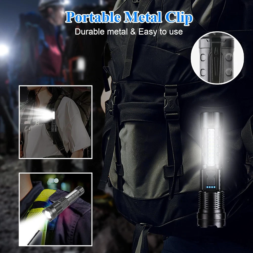【1,000,000 Lumens Super Bright Tactical Flashlight】 Equipped with upgraded efficient laser Chip LED chips, Sogidon rechargeable flashlight emits a stable and super bright lighting. Since the light penetration is stronger than other same-level lamp beads', its beam can pass through dust and fog well, especially suitable for foggy and rainy days with low visibility. It can illuminate an 2200-square-foot room or focus on objects up to 3900 feet away. 【7 Light Modes & Zoomable Focus】 There are 7 modes of Sogidon rechargeable flashlight: High / Low / Strobe for the main light, and High / Low / Red / Red&Blue Strobe for the COB side light. Equipped with zoomable head, the small rechargeable flashlight high lumens can emit a powerful focused lighting and an extensive extended lighting by adjusting the light head. As its compact design, you carry this small handheld flashlight in your pocket or the car glove compartment. 【USB C Fast Charging & Power Indicator】 Built-in a 6000 mAh rechargeable lithium-ion battery and equipped with more energy-efficient chips, the rechargeable flashlight battery powered working time is up to 8 hours. The USB C fast charging input achieves 30% reduction in charging time. It can be charged by power bank, USB plug, etc, with the USB C charging cable. You can see the remaining power at the power indicator light. 【IPX6 Waterproof】 This flashlight head adopts the high grade black aluminium alloy, and the frame adopts the ABS plastic. The waterproof grade of this flash light reaches IPX6 Waterproof. This rechargeable flashlight is non-slip, shockproof, waterproof, rainproof, dustproof. It can work well in severe outdoor weather conditions, such as rain and snow. It is an ideal outdoor handheld flashlight for working, hiking, camping, repairing, hunting, and Sogidon fishing. 【Easy to Carry】 Led flashlight is equipped with lanyard and pocket clip, which can be hung on your wrist or attach to your pocket , backpack shoulder strap, hat and belt. 【Customer Service】Please charge before first use. We have 1 year free replacement service and 7*24 hours customer service. If you have any questions, please feel free to contact us. We will offer you a satisfactory solution. Product Description 1 High Power Flashlight 2 Zoomable Focus 3 Portable Clip How to turn on the COB Side Light? Long press the switch for 2-3 seconds. How to know the flashlight is fully charged? All Indicator lights are bright and not strobing when charged. What is the material of the light? The head is made of the hard aluminum alloy. And the frame is made of the durable ABS plastic. How to zoom the beam? Extend the flashlight head to zoom the beam of light. Please extend it harder for the first time!