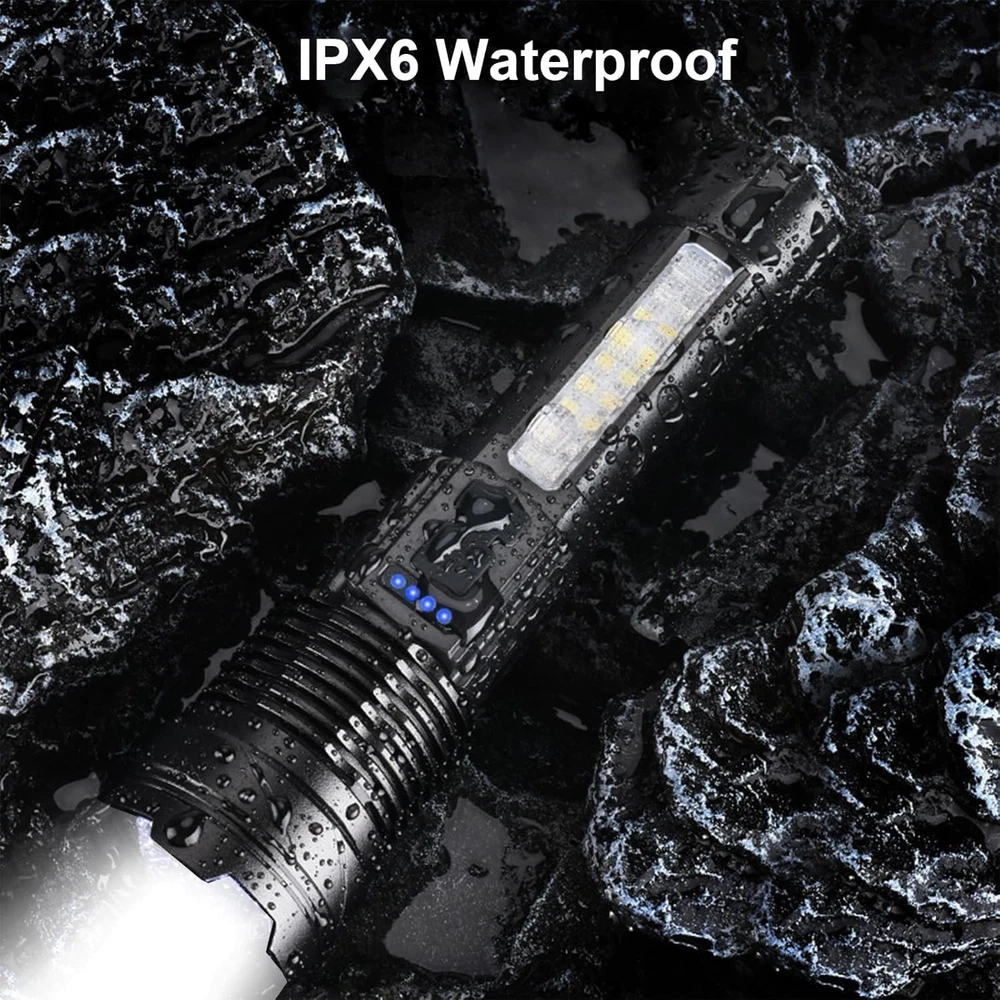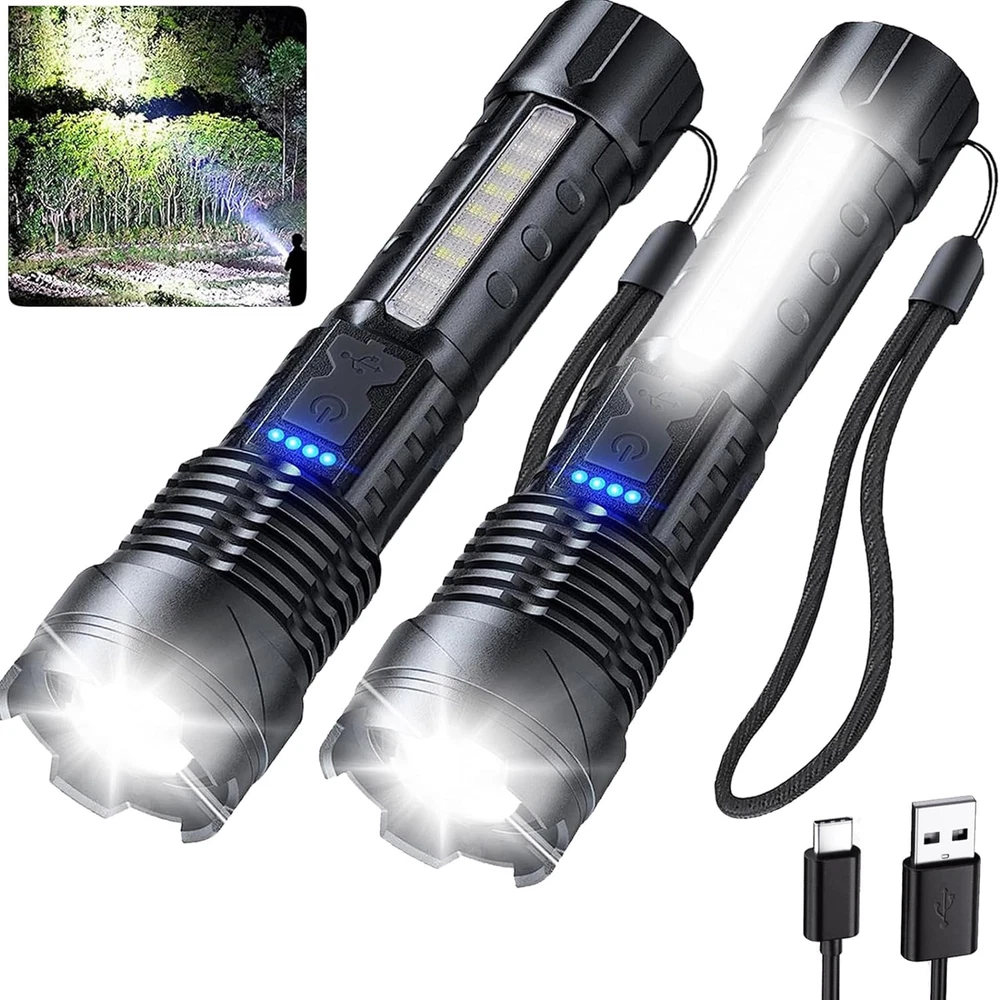 [1,000,000 Lumens Super Bright Tactical Flashlight] Equipped with upgraded aggregative laser chips, rechargeable flashlight emits a stable and super bright lighting. Since the light penetration is stronger than other same-level lamp beads', its beam can pass through dust and fog well, especially suitable for foggy and rainy days with low visibility. It can illuminate an 2200-square-foot room or focus on objects up to 3900 feet away. [7 Light Modes & Zoomable Beam] There are 7 modes of rechargeable flashlights: High / Low / Strobe for the main light, and High / Low / Red / Red&Blue Strobe for the COB side light. Equipped with zoomable head, the small rechargeable flashlight high lumens can emit a powerful focused lighting and an extensive extended lighting by adjusting the light head. As its compact design, you carry this small handheld flashlight in your pocket or the car glove compartment. [USB C Fast Charging & Power Indicators] Built-in an 5000 mAh rechargeable lithium-ion battery and equipped with more energy-efficient chips, the rechargeable flashlight battery powered working time is up to 6-10 hours. The USB C fast charging input achieves 30% reduction in charging time. It can be charged by power bank, USB plug, etc, with the USB C charging cable. You can see the remaining power at the power indicator lights. [IPX6 Waterproof] This flashlight head adopts the high grade black aluminium alloy, and the frame adopts the ABS plastic. The waterproof grade of this flash light reaches IPX6 Waterproof. This rechargeable flashlight is non-slip, shockproof, waterproof, rainproof, dustproof. It can work well in severe outdoor weather conditions, such as rain and snow. It is an ideal outdoor tactical flashlight for working, hiking, camping, repairing, hunting, and fishing. [Easy to Carry] The rechargeable flashlights are equipped with lanyard and pocket clip, which can be hung on your wrist or attach to your pocket , backpack shoulder strap, hat and belt. [Customer Service] Please charge before first use. Long press the switch to turn on the Cob side light. We have 1 year free replacement service and 7*24 hours customer service. If you have any questions, please feel free to contact . We will offer you a satisfactory solution.