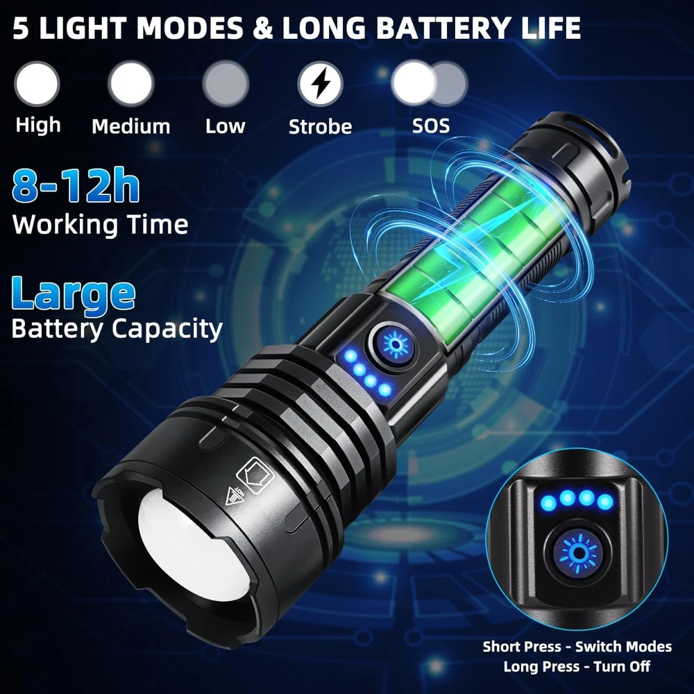 Flashlights High Lumens: WopkDupk rechargeable flashlights are equipped with upgraded P70 chips, reaching 990000LM brightness at the highest power, and can illuminate 1500ft² area or 2000ft distance. With the brightest flashlight, various lighting needs can be met, such as camping, hiking, home, emergencies. Adjustable Focus & 5 Modes: Powerful flashlights have 5 modes: High / Medium / Low / Strobe / SOS, which can be switched by pressing the power button. According to your needs, you can stretch the head of bright flashlight to change the focal length and beam size, and freely choose long-distance observation and wide-range lighting. Rechargeable & Power Display: With a fast-charging Type-C port and a large capacity battery, the flashlight rechargeable can be fully charged efficiently and work for 8-12 hours in different lighting modes. In addition, the power indicator on the flash light can clearly show the remaining power of the flashlight (100%, 75%, 50%, 25%). High Quality & IP67 Waterproof: Tactical flashlights high lumens are made of high-quality aviation grade aluminum alloy, with good heat dissipation and impact resistance, and are very practical and high quality. The sealed design makes the LED flashlight has good waterproof performance, and can withstand bad weather such as rain and snow. Multifunctional Flashlight: (1) With USB output port, the rechargeable flashlight can charge electronic devices. (2) With head cusp design, tactical flashlight can be used as safety hammer. (3) With dry battery function, flash light high lumens can be used in emergency. If you have any problems with flash lights, such as not working, not charging, lack of accessories, please message us via amazon, WopkDupk will provide you with good after-sales support service. Product Description FLASHLIGHTS HIGH LUMENS - WopkDupk Flash Light with High Brightness POWERFUL TACTICAL FLASHLIGHT - Adjustable Focus & 5 Working Modes RECHARGEABLE FLASHLIGHTS - Large Capacity Battery & Power Indicator LED FLASHLIGHT HIGH POWERED - Flashlight Easy to Install & Dual Power Supply SUPER BRIGHT FLASHLIGHT - Widely Use for Camping Home Emergencies