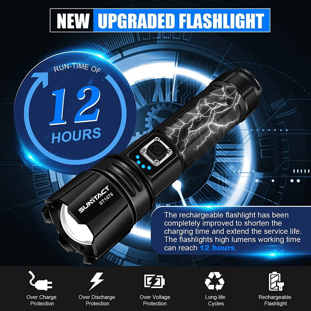 【990000 LUMEN LED FLASHLIGHT】: Sunitact ST1476 flashlights high lumens built-in advanced XHP70.2 LED chip, with a powerful 990000 lumens output, providing you the great light world you want, easily illuminates a 120 square meter room. we even can focus on objects up to 1000FT away, about the length of 3 football fields! And we can put all the parts in the gift box for easy carrying and storage. In additional, this bright flashlight is also an ideal gift for our friends or family. 【USB RECHARGEABLE AND POWER INDICATOR】: This rechargeable flashlights can provide up to 12 hours of runtime, with upgraded overcharge protection, it can be charged by usb cable(included). The flash light will stop charging when it fully charged, so that we don't need worry about the safety when we forget the flashlight is in charging. It can also charge the phone in an emergency. The power indicator above the flashlight helps you clearly understand the flashlight power (25%, 50%, 75%, 100%). 【ADJUSTABLE AND 5 LIGHT MODES】: This flashlights high lumens rechargeable has 5 lighting modes: High-Medium-Low-Strobe-SOS. According to our needs, we can stretch the head of the handheld flashlights to adjust the focus, freely choose long-distance observation and wide-range lighting. It is very suitable for camping, hiking, dog walking, fishing or any outdoor activities and emergency power-off backup. Long press for 3 seconds to turn off the light, no need to cycle all light modes. 【IP67 WATERPROOF AND PRACTICALLY INDESTRUCTIBLE】: Sunitact ST1476 IP67 waterproof LED flashlight is designed for rough handling. High-quality aerospace-grade aluminum alloy body protects the led flashlight rechargeable from rust or being scratched. After tests including freezing, underwater immersion and running over with a full-size truck and 10-foot drop, it still works! This high powered flashlight is durable enough in any situation, especially in rain, snow or emergency situations. 【FULL FLASHLIGHT KIT】: What you get: 1 x Sunitact ST1476 LED Flashlights High Lumens, 1 x USB charging cable, 1 x Lanyard and Flashlight holster, 1x Operating instructions and Gift box. We have carefully checked all flashlight rechargeable before shipment and ensured that the products are working properly. Most importantly, we provide 7*24 hours customer service. If you have any questions, please feel free to contact us. Product Description SUNITACT ST1476 SUPER BRIGHT FLASHLIGHT - LIGHT UP YOUR LIFE INSTANTLY! The adjustable focus of the Sunitact high powered flashlight allows you to choose the focus between spotlight and floodlight. Spotlights illuminate a longer distance, and floodlights illuminate a larger area. A stable and bright beam can be formed within 1000 meters. About Sunitact Sunitact focuses on the development, manufacturing and sales of outdoor sports lighting tools. We are brand sellers and our flashlights are sold all over the world. We continue to improve the quality of flashlights and provide customers with an excellent lighting experience. In any mode, we can press and hold the button for 3 seconds to turn off the flashlights high lumens rechargeable. Sunitact ST1476 XHP70.2 LED Flashlights High Lumens WHAT YOU WILL RECEIVE: 1 * Sunitact ST1476 Rechargeable Flashlights with Charging Cable 1 * Rechargeable Battery 1 *3 AAA Battery with White Battery Tube and Battery Holder 1 * Flashlight Holster and Lanyard 1 * Operating Instructions and Gift Box XHP70.2 SUPER BRIGHT FLASHLIGHT POWER DISPLAY & USB RECHARGEABLE WATER RESISTANT & VIRTUALLY INDESTRUCTIBLE ADJUSTABLE FOCUS & 5 LIGHT MODES SUPER HEAT DISSIPATION DESIGN POPULAR USE FOR HOME & WORK & OUTDOOR HOW TO INSTALL THE BATTERY? USB INPUT AND OUTPUT & POWER INDICATOR Connect the Cable (include) with all kinds of USB devices such as car sockets, computer, laptop,etc, it is convenient in any outdoor activities. Sunitact rechargeable flashlights can also be used as mobile power supplies to charge your device in an emergency. The power indicator can display accurate flashlight power (25%, 50%, 75%, 100%), and no longer have to guess the remaining power of the flashlight. XHP70.2 SUPER BRIGHT LED FLASHLIGHT Sunitact ST1476 LED flashlight adopts an upgraded version of XHP70.2 chip, which can provide up to 10,000 real lumens and incredible brightness. Its ultra-wide beam can illuminates the entire backyard effortlessly, and it can be focused up to 1,000 feet away. UPGRADED RECHARGEABLE FLASHLIGHT The rechargeable flashlights has been completely upgraded, the ultra-wide beam lasts for up to 12 hours of lighting in medium brightness mode. It provides overcharge, overdischarge, and overvoltage protection, super heat dissipation capacity, which is safer to use, and its service life can reach 100,000 hours. It takes about 6-8 hours to fully charge. 5 LIGHT MODES This high powered flashlight has 5 light modes: High/ Medium/ Low/ Strobe/ SOS, which can meet your various needs in daily life. Easy to change modes by pressing the switch button gently. Press for 3 seconds to turn off the light in any mode. IP67 WATERPROOF & DURABLE Made of high-quality aviation-grade aluminum alloy, it protects your flashlight from scratches, corrosion, rust and damage. IP67 waterproof, can withstand all kinds of extreme weather such as storm and heavy snow (do not immerse in the water for a long time). Goreit A IDEAL KIT FOR CAMPING, DOG WALKING, FISHING, HIKING, POWER OUTAGES, EVERYDAY USE, BACKUP, EMERGENCY, ETC、