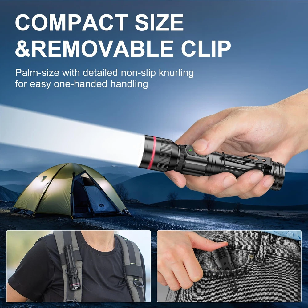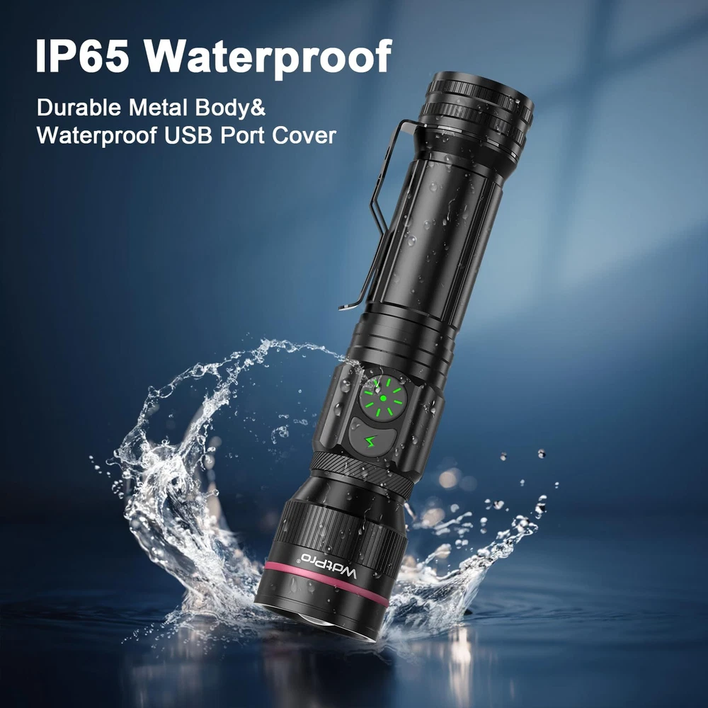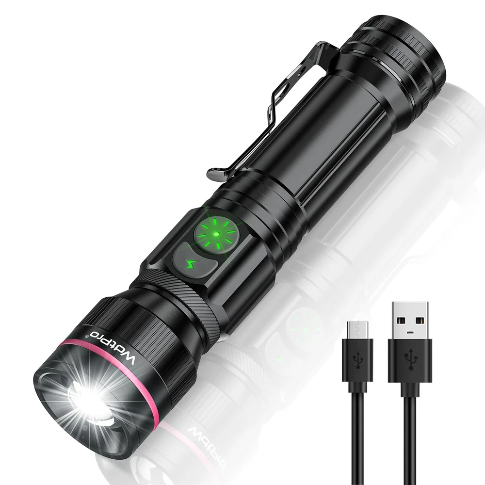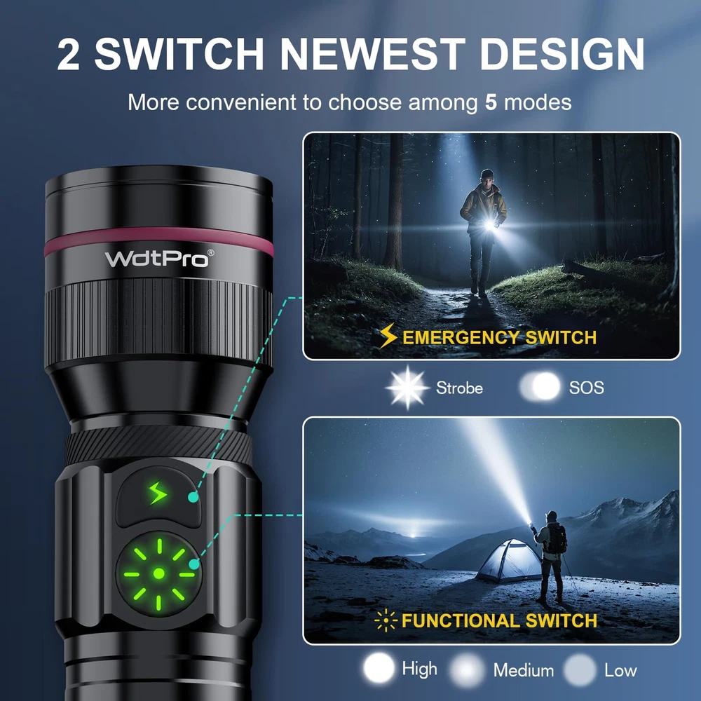 WdtPro Flashlights Rechargeable, 2000 High Lumens Super Bright LED Flashlight Portable, 5 Modes Dual Switch Tactical Flashlight with Clip, Waterproof Zoomable for Camping Emergency, Battery Included Super Bright Portable Flashlight: S2500 rechargeable flashlight with powerful LED produces up to 2000 high lumens, making for its incredible brightness and easily illuminates your entire room. Plus the zoomable function, the bright flashlight can be adjusted from the wide to narrow beam to meet your specific needs. Measuring length 5.5 inch, diameter 1.2 inch, the compact flashlight is very convenient to carry. Also with a pocket clip for your portable carrying USB Rechargeable Flashlight & Long-lasting: No buying batteries. Built-in upgraded 2000mAh rechargeable battery boasts of longer lifespan. USB charged flashlight only needs 3-4 hours to get a full charge, lasting for 12 hours continuously in low mode and 3 hours in high mode. Overcharge protection means the flash light will stop charging when it fully charged, safer to use 5 Modes LED Flashlight with Dual Switch : Just one click to strobe/SOS mode, which specially designed for camping, emergencies and your security. The other daily switch controls the remaining 3 modes: high/medium/low that can be used as a EDC flashlight for home. More practical and easier to choose between settings. In addition, low battery warning function is so smart that reminds you to charge since the indicator will turn from green to red when power is below 30% Waterproof Reliable Tactical Flashlight: Be of solid aluminum alloy construction and IP65 waterproof grade, the LED tactical flashlight withstands hard squeezing, freezing temperature, a 10-foot falling and any extreme weather such as heavy rain, snow, sleet, etc. Very great LED flashlight for camping Versatile & Buy with Confidence: The flashlight can be widely used for daily lighting, power outages, emergencies and so on; also used for outdoor sports such as camping, hiking, climbing, night walking, etc. Every single flashlight comes with a 1-year no questions asked replacement warranty and 24-hours online customer service. Just rest-assured to buy * Order Cancellation Policy ** You can return a product for up to 30 days from the date you purchased it. 1. The seller reserves the right to cancel the special case only due to eBay cancellation fee. 2. The decision of seller is the final. 3. The seller will respond to the cancellation request within 2 business days. Please wait for the result of cancellation. 4. In case the cancellation is not completed by some reasons, the buyer can follow the options below to get the refund. 4.1 The buyer can reject the item when it arrives. 4.2 The buyer can send the item back to the seller within 30 days If the buyer receives item (USA Shipment ONLY). The seller will provide the FREE return label to the buyer when the buyer opens " Return Item" case on eBay by using the reason as "Change my mind" ONLY. 5. When buyer has placed the order. The order will be processed and completed by automatic warehouse system within 5 minutes. In case that buyer sends the cancellation request after 5 minutes of placing the order, the request will be rejected. **Sending direct message to cancel the order is not allowed for every case.* Return Policy For the return case - If buyer would like to return the items for refund or replacement, please CONTACT SELLER to receive the free return label from seller. The refund or replacement will be processed with the tracking number of return label which is provided by seller only. The other ways of return which are not approved by seller will not be processed for the refund or replacement. SHIPPING Domestic Buyers - We ship within 3 business days of payment, usually sooner - We offer FREE shipping on all orders! - We only ship to the lower 48 states, no APO/FPO addresses or PO Boxes allowed - We have confidence in our products, but if you are not fully satisfied please contact us within 30 days of purchase and you will get full refund. International buyers – please note: Import duties, taxes, and charges aren't included in the item price or postage cost. These charges are the buyer's responsibility. - Please check with your country's customs office to determine what these additional costs will be prior to bidding or buying.