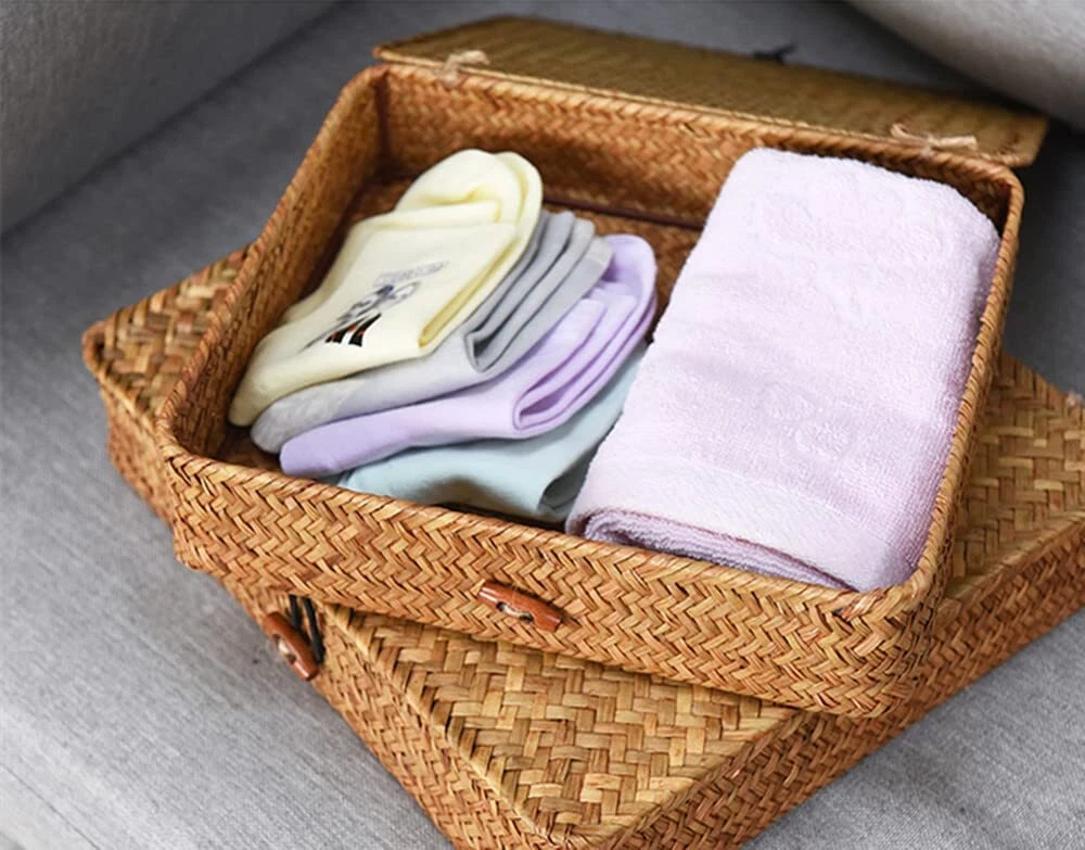 Flat Seagrass Storage Bins with Lid, Wicker Basket for Shelf Organize, Set of...