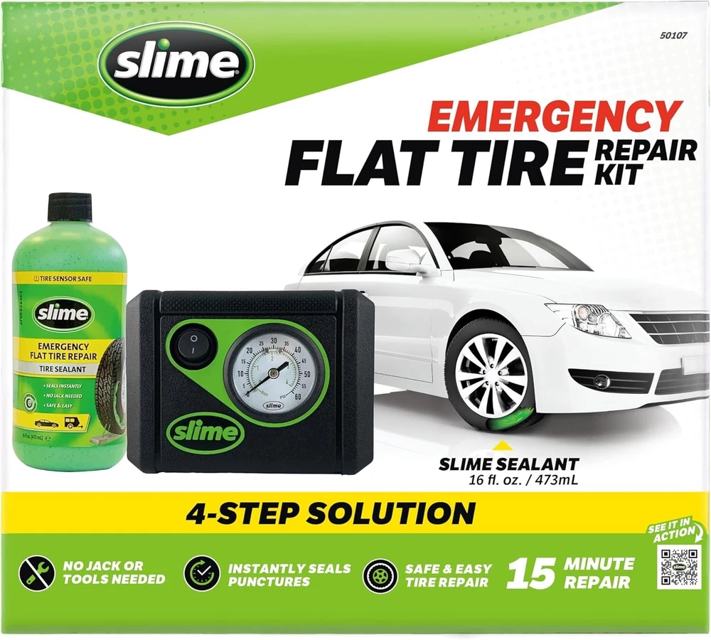 Flat Tire Puncture Repair, Smart Spair, Emergency Kit for Car Tires, Includes Sealant and Tire Inflator Pump, Suitable for Cars and Other Highway Vehicles, 15 Min Fix Emergency tire repair complete kit: Tire inflator, 16oz (473 mL) sealant (refills available,) accessories for inflatables (sports balls), instructions, zipped storage bag Just 15 minutes and four simple steps to repair and fully inflate your tire. No jack needed and no need to remove the tire For emergency use only! 's Emergency Tire Sealant is designed as a temporary formula in passenger vehicles and must be removed within 3 days or 100 miles Repairs punctures up to 1/4 inch, is TMPS safe and offers non-toxic, non-corrosive properties that are safe for tires and wheel rims Safe and easy emergency repair sealant. The Smart Spair is for standard tires and fits easily in a trunk The Smart Sapir Emergency Flat Tire Repair Kit combines tire sealant and a tire inflator, allowing you to repair and inflate a flat tire in minutes. Simply squeeze in the emergency repair tire sealant, inflate your tire with the included inflator, and that’s it! No jacks, no tools, no hassle. Easily repair your flat tire and get back on the road in 15 minutes. The Smart Sapir Emergency Flat Tire Repair Kit contains two distinct elements: Tire inflator and tire repair sealant. The tire inflator plugs into your car’s 12-volt accessory power outlet and features a quick connect air hose and a built in tire pressure dial gauge (0-100 psi). The 16 oz. bottle of emergency tire sealant instantly seals punctures up to a 1/4, ” is non-toxic, non-hazardous, non-flammable and non-corrosive (making it safe for finished metal wheels) and is tire sensor safe. The Smart Sapir Emergency Flat Tire Repair Kit fits neatly in the included zippered case for convenient storage.