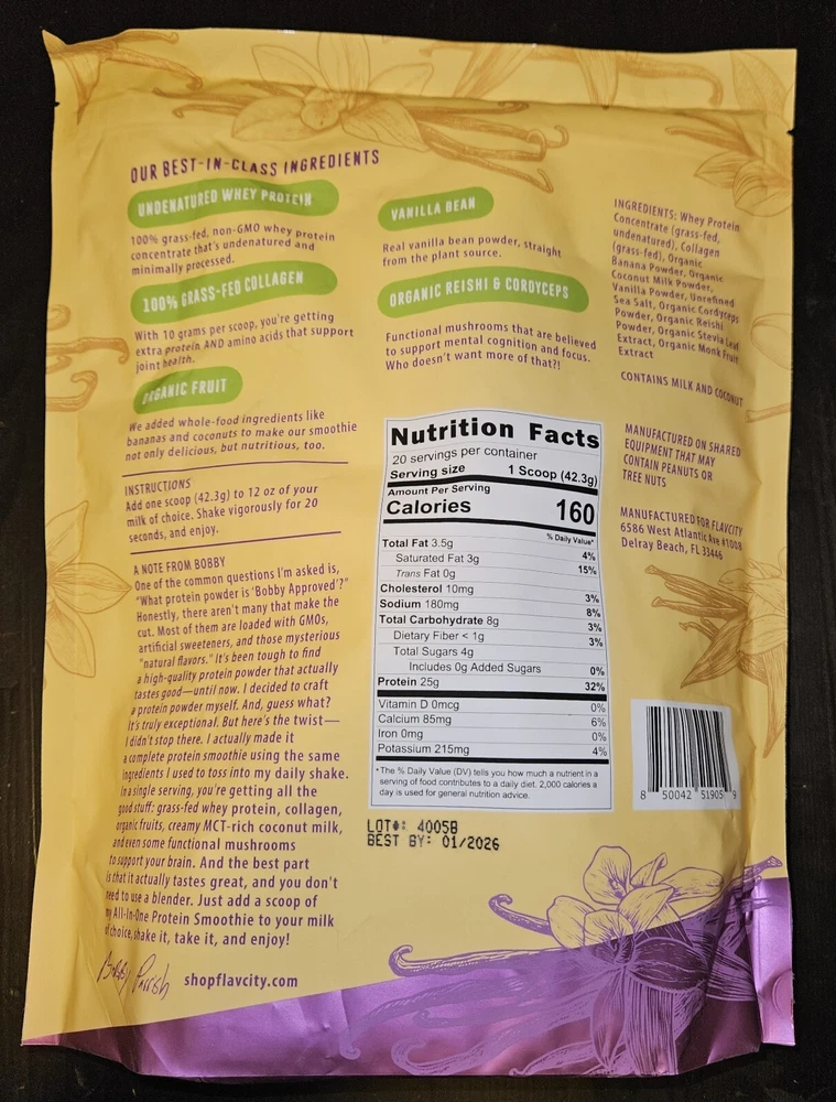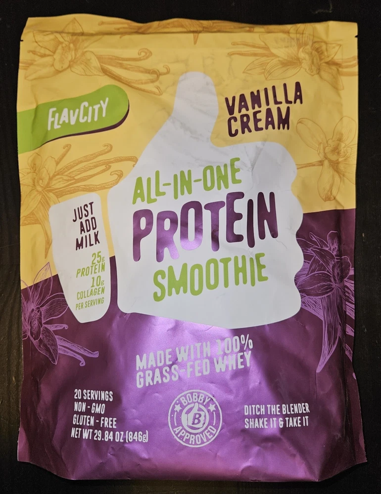 FlavCity All-in-One Protein Smoothie Vanilla Cream Made with 100% Grass-Fed Whey 29.84oz Powder Exp. Date: 01/2026 NEW & sealed