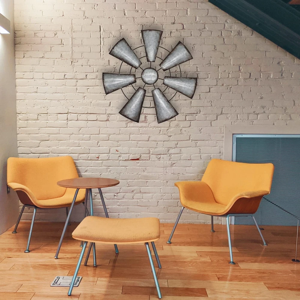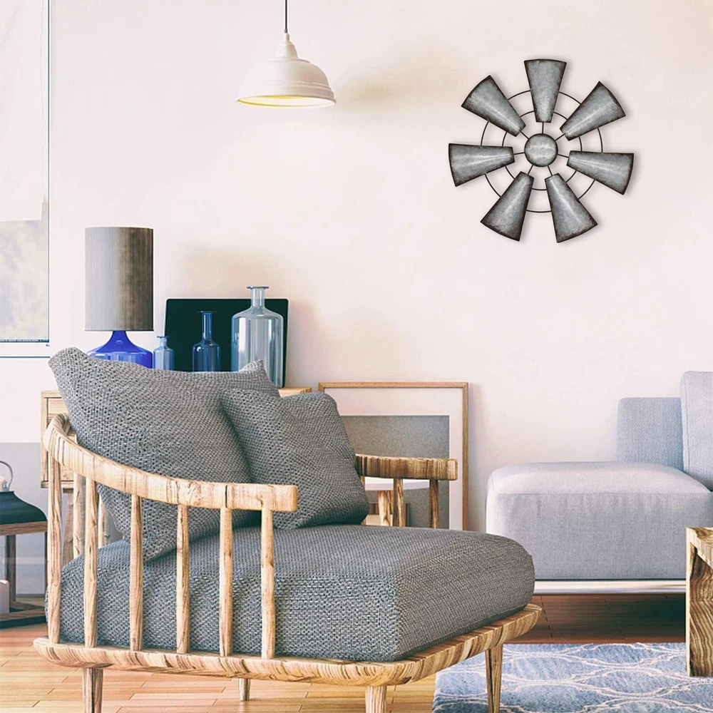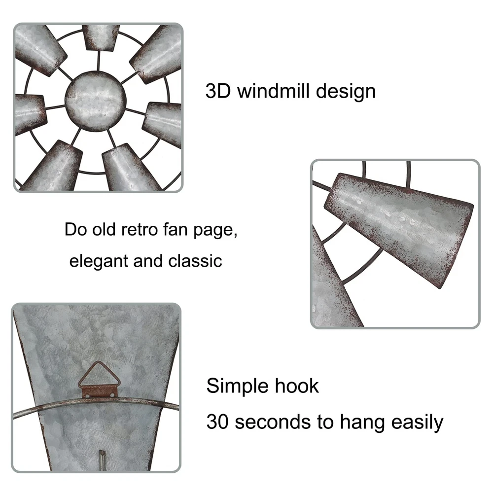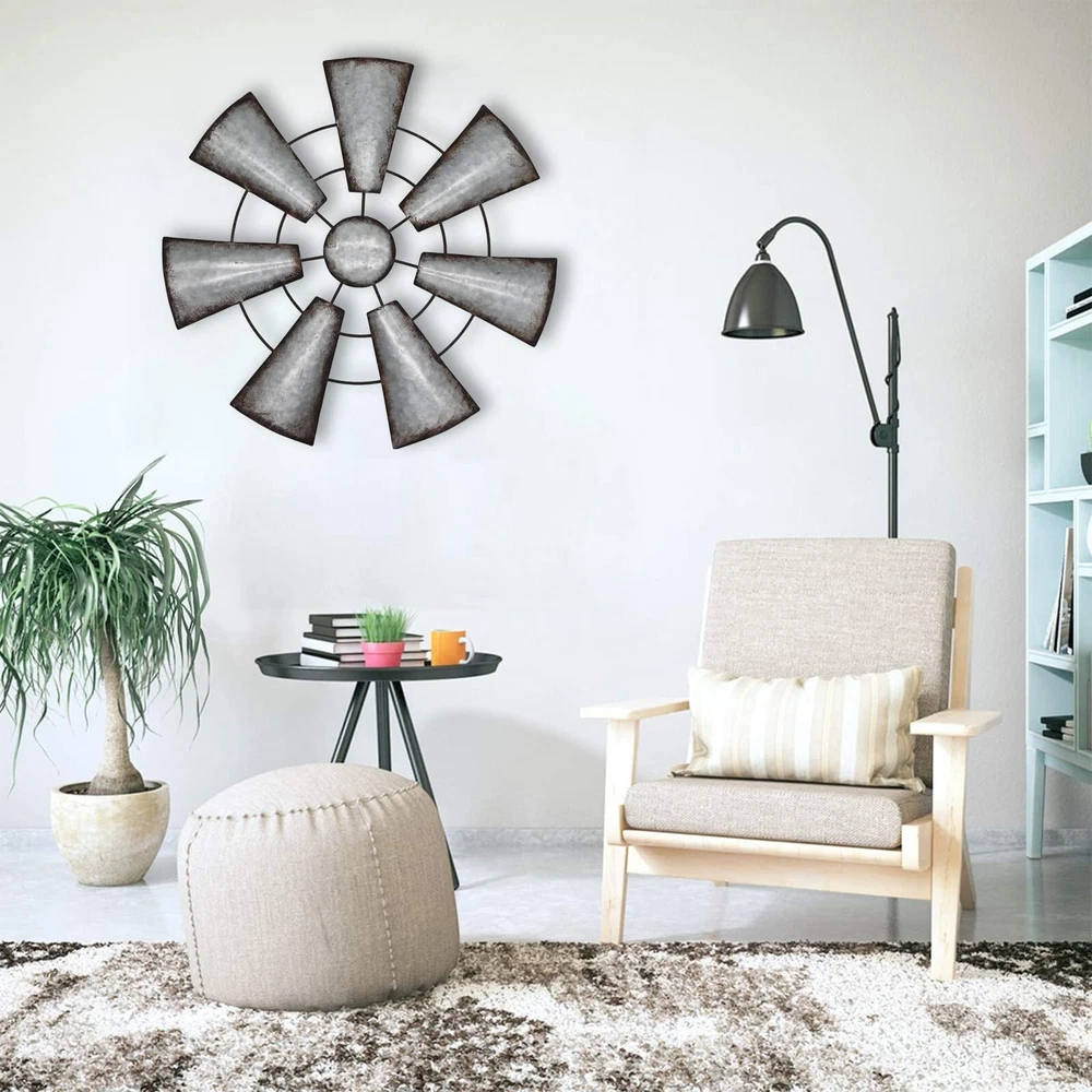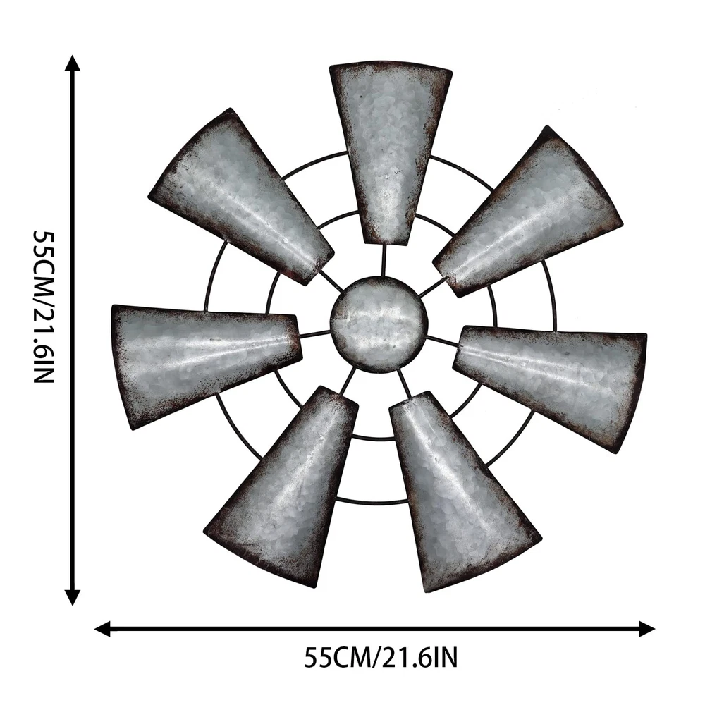 Fleecy day Windmill Wall Decor 22in, Rustic Metal Farmhouse Windmill Wall Art Decor, Galvanized Windmill Wall Hanging Home Kitchen Wall Sculpture Art for Bedroom Office Living room Product Details Size: Large Color: Gray Brand: Fleecy day UPC: 755738989324 EAN: 0755738989324 MPN: Does not apply Product Dimensions: 22 x 22 x 0.01 inches Item Weight: 1.8 pounds Manufacturer: Fleecy day Date First Available: December 9, 2021 CHOICE OF PERFECT SIZE: Pinwheels are 22" x22" in diameter, you can choose the right size for your needs (2 optional sizes). Metal pinwheels can be used to fill empty spaces on the wall or as a gallery wall Decorate, easily get the rustic farmhouse themed decor you want! RUSTIC FARMHOUSE DESIGN: The metal windmills are made of high quality iron, and the edges of each fan are designed with a distressed imitation rust finish, which looks very retro and elegant; pure hand-painted imitation rust finish, and decorative tapes for your room walls Come for a unique rustic atmosphere that gives you a rustic country feel. EASY TO APPLY: The chic metal pinwheel wall decor is perfect for any style of home decor, especially farmhouse. You can put it in your bedroom, study, living room, dorm, office, etc. EASY TO HANG: The metal pinwheel has a hook on the back for easy hanging! Use monkey hooks, nails or screws. Just 30 seconds! Authentic details will impress your friends and family. ATMOSPHERIC GIFT: Metal pinwheels are all handcrafted, with fan blade details and painted distressed details to perfectly accentuate your home's retro style, making it the perfect gift for retro vibe or farmhouse decor lovers as well as friends, family and loved ones.