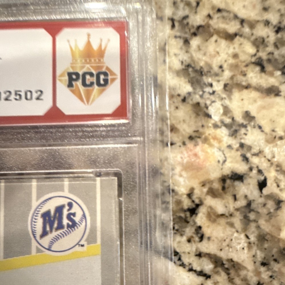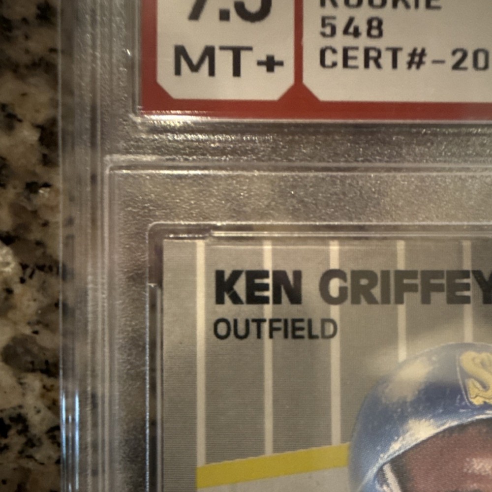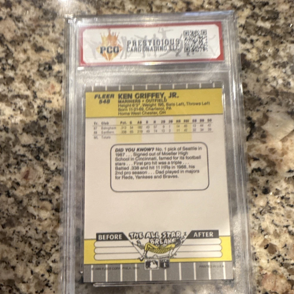 The product is a 1989 Fleer Glossy Ken Griffey Jr. rookie trading card, graded as a PCG 9.5 MT +. This vintage baseball card features the Seattle Mariners player in his rookie season, making it a highly sought-after collectible for fans and collectors alike. The card is made of card stock and is an original, licensed reprint from Fleer. With its iconic design and rarity, this card is a valuable piece of sports memorabilia for any baseball enthusiast.