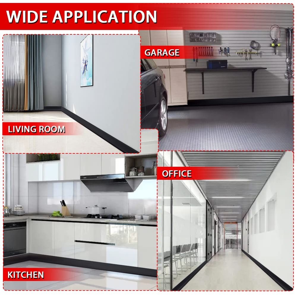 Features: Flexible and durable vinyl material construction, easy to cut and use with a strong, peel and stick backing. Can be widely used as decoration and base protection between wall and floor. Suitable for living room, kitchen, office, garage, school and more. Simple design and three color options, a decorative and easy home improvement project. Specification Material: PVC Size: 20 feet in length, 4 inches in width, 1/12 inches in thickness Color: white, black, gray Premium Material: made of high quality vinyl material, the self adhesive vinyl wall base with simple design is flexible and durable. 20ft long, 4in wide and 1/12in thick, proper size is perfect for most interiors. Self-adhesive Design: this flexible peel and stick vinyl baseboard with a strong adhesive backing is very convenient to complete the installation. Note: If the temperature is below 68℉, please use a hair dryer to heat the adhesive before sticking it to the wall. Quick Installation: easy to use without screws or drilling required. Measure and cut to the desired length, peel off the backing tape of the self adhesive vinyl baseboard and stick it to a smooth surface after wiping, firmly press with roller tool back and forth to achieve the flatness effect and secure grasp after installation. Widely Used: this vinyl wall base self adhesive is widely used as decoration and wall base protection in your living room, bedroom, kitchen, hallway, garage, and also can be applied to office, meeting room, school. Decorative Baseboard Trim: color in white, black and gray, with its simple design and multi color options, this adhesive back vinyl wall base has a decorative feature while helping to protect the base of wall and floor.