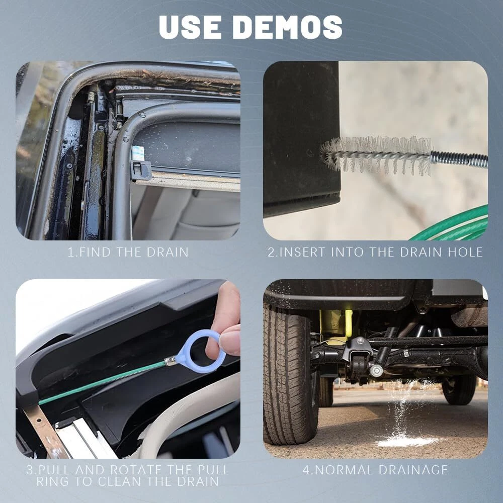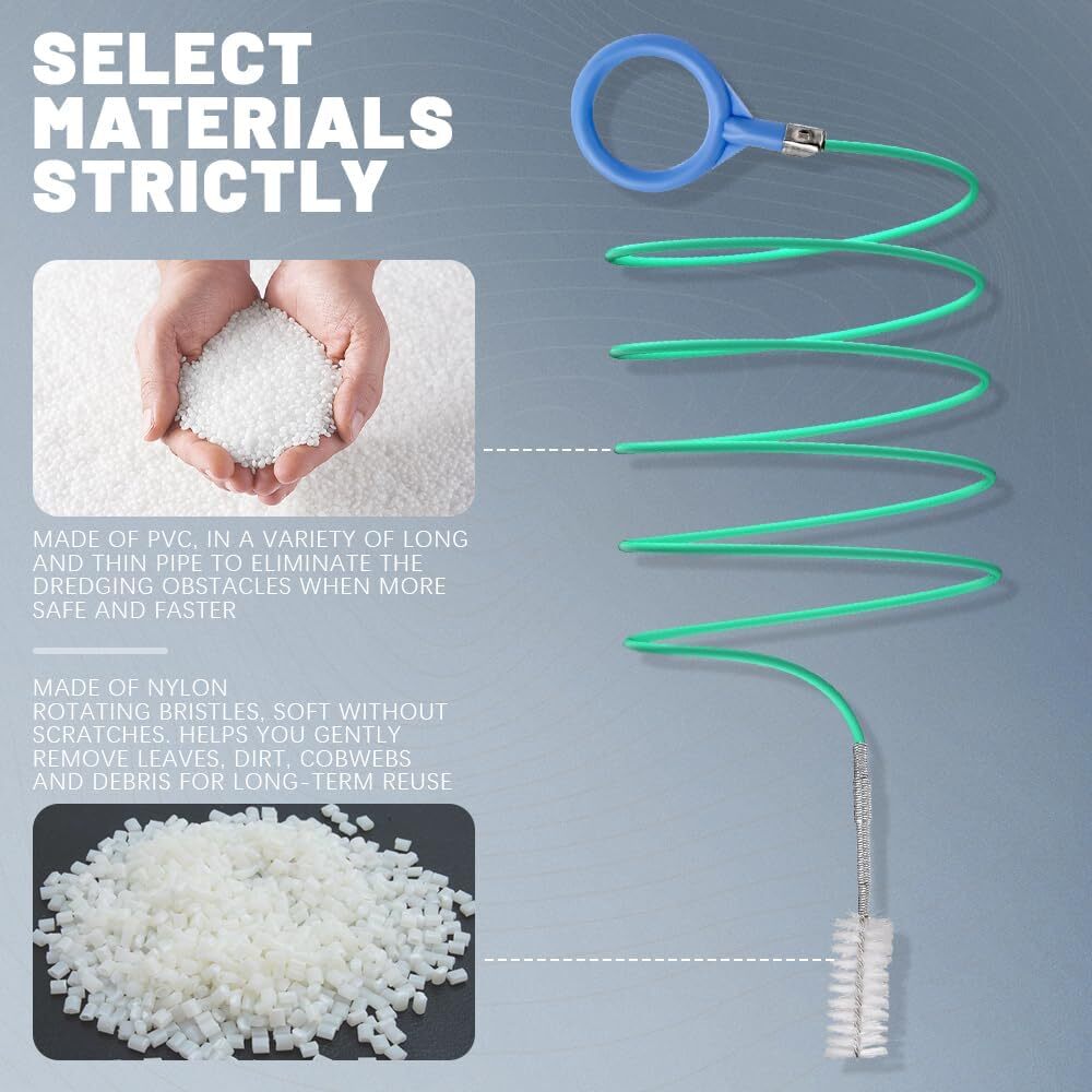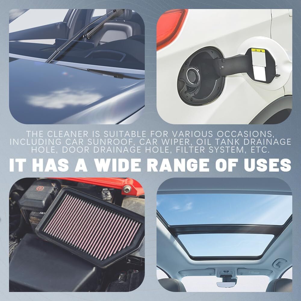 About this item [Nylon rotating bristles]: One end of the windshield cleaning tool is designed as a tubular brush, made of nylon material. The soft bristles can gently brush away sediment without scratching the rubber skylight hose, ensuring a more thorough cleaning of the pipeline. [Pull ring design]: One end of the car pipe cleaner features a hand pull ring, allowing for easy stretching and more convenient cleaning. This design helps prevent the car vent cleaner from falling into small pipes, making it easily retrievable and ensuring smooth use. [Flexible and easy to use]: The car cleaning brush has a length of 6.56FT/2M. The long strip design makes it highly flexible, allowing it to reach deep into bent hoses and tight spaces for thorough cleaning and effective clog removal. [Multiple uses]: This car detailing cleaning brush is versatile, suitable for cleaning car sunroofs, fuel tank drain holes, car wipers, skylight drain pipes, door drain holes, and more. It can also be used for cleaning refrigerator drain pipes, fish tanks, water pump accessories, and glass tubes, meeting a variety of needs. [Convenient tool]: The car cleaner brush can be easily rinsed with water after use, allowing for long-term reuse. It is compact and lightweight, making it easy to store and carry, which adds to its convenience. Dimensions: 9.53 x 5.16 x 0.63 inches.