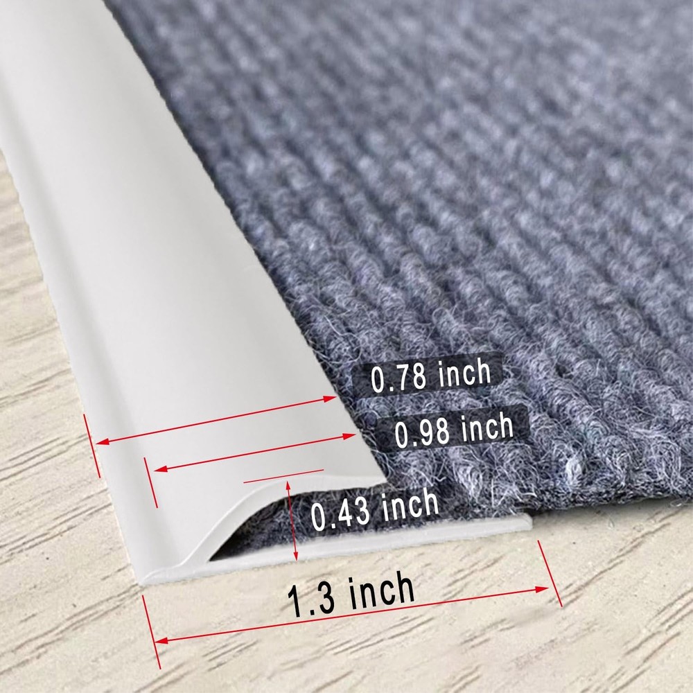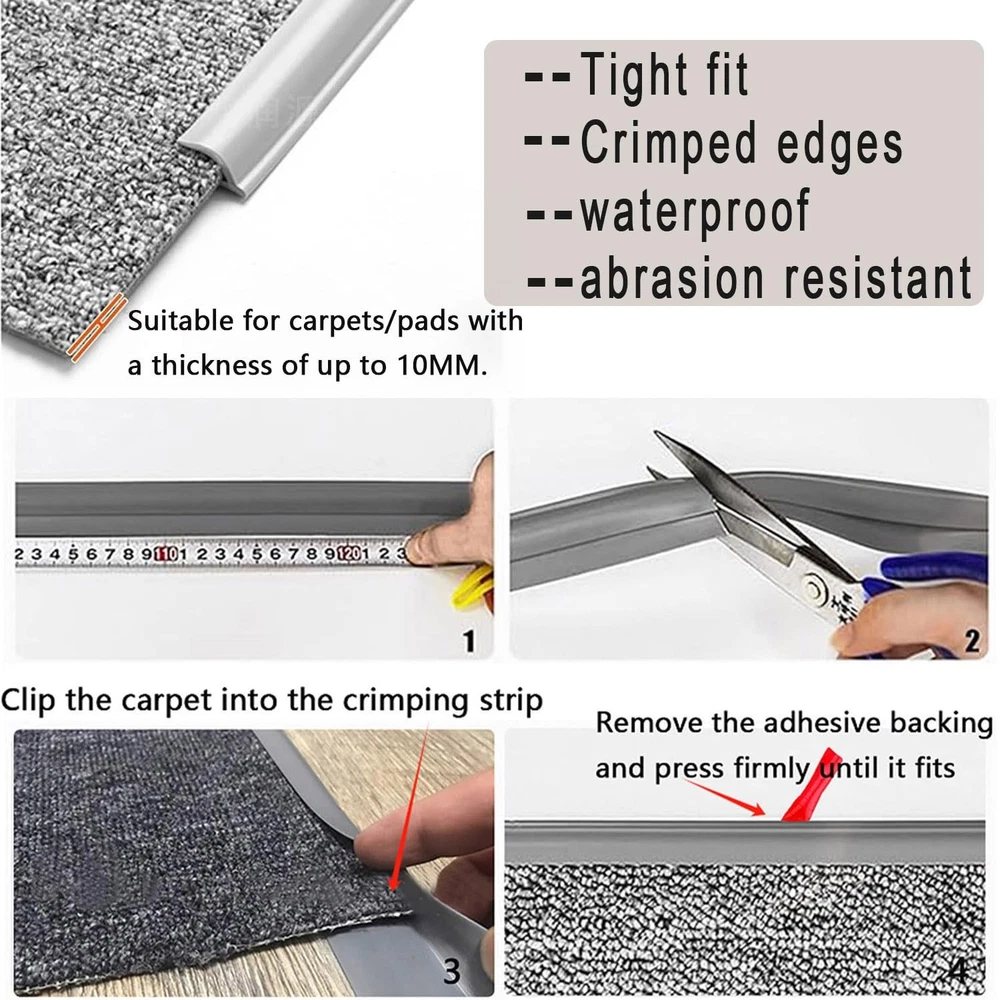 Flooring Transition Strips:This threshold transition strip is specifically designed to provide a fix, protection, and decorative solution for the transition between floors and thresholds or carpets.It Not Only Connects The Carpet And The Floor Smoothly, But Also Provides A Sealing Effect. It Protects The Edges Of The Carpet From Wear And Tear Rug Edge Protector: Are You Still Worried About The Carpet Buckling, Wrinkling, And Walking Back And Forth, Creating Safety Hazards? Are You Still Worried About The Germs Caused By Children And Pets Producing Waste Under The Carpet That Is Not Cleaned In Time? The Floor Carpet Transition Strips Are Made Of High-Quality Pvc Materials, that can easily cover the edges of floor tiles and carpets Carpet Edge Sealing Strip: It is made of premium material and features a strong adhesive that. Additionally, it is scratch-resistant, abrasion-resistant, stain-resistant, water-resistant, heat-resistant, and environmentally friendly.The carpet edging trim is durable, withstands high foot traffic areas in the home Flexible Cutting: Easy To Customize And Cut To Size With Scissors Or Knife, Easily Adjust To The Length You Need. It is also easy to clean and maintain. Suitable For 0-0.4 Inch Thick Carpet.please ensure the floor surface is clean and free from grease, dust, or moisture, as stickiness may be slightly reduced otherwise This transition strip finds wide application in various locations such as homes, hotels, restaurants, conference halls, etc. It can be used for multiple floor transitions and decorative purposes. The most common transitions include wood floor to carpet, tile to carpet, and tile to door threshold, among others