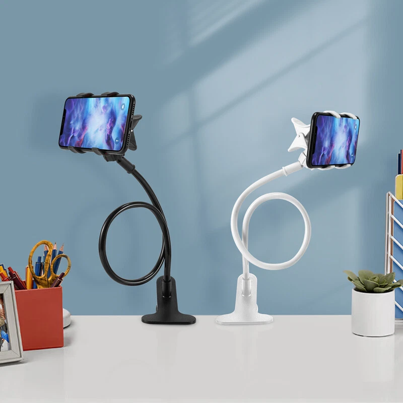 Flexible Lazy Bracket Mobile Phone Stand Holder Bed Desktop For iPhone Samsung Description The universal smartphone desk grip mount fits for most mobile phones. It has four clamps that sink in to grab your device for a strong stable hold. Attractive rubber pieces carefully hug your smartphone's body safely. A flexible long wire can be adjusted to any comfortable viewing angle or distance you desire. Mount to side of a table, desk, door, etc. via a sturdy metal spring clamp. Features: Lazy Bed Desktop Car Mount Phone Holder. Universal holder for Mobile Phone, MP3, Digital Camera, GPS, cameras etc. Watch movies / videos, Listen music on the bed without holding your phone! Flexible arm for different angle and distance. Specification: Material: Plastic + metal Length: 66cm (Approx) Flexible Arm length: Max. 600-660 mm/23.6”-25.9” Clamp for Phone: <125mm/4.92"(Width of the device) Clamp for Bed(Table): <75mm/2.95"(Thickness of the bed or table) Color: Black / White Package Included: 1x Lazy Bed Desktop Car Mount Phone Holder