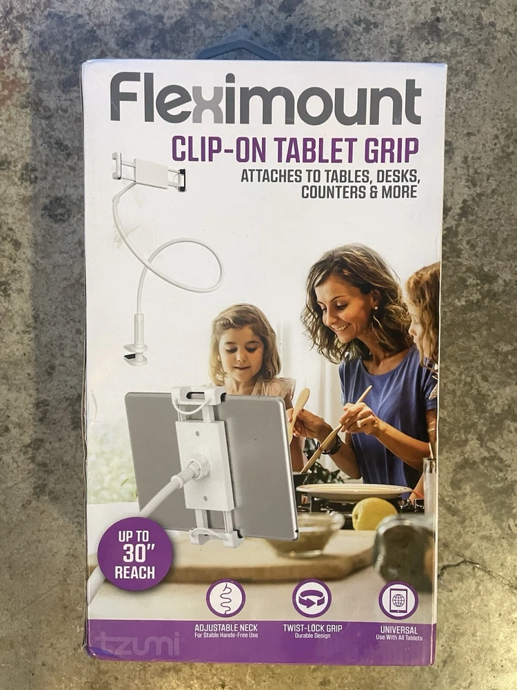 The Tzumi Fleximount Clip On Tablet Holder is a white desktop stand designed to securely grip tablets such as iPads. It is compatible with various brands including Apple, LG, and Samsung, and features a 360° flexible design for adjustable viewing angles. Made of plastic and metal, this mount can be easily attached to a desk for convenient hands-free use. Perfect for watching videos, reading, or video calls, this tablet holder provides a stable and secure grip for your device.