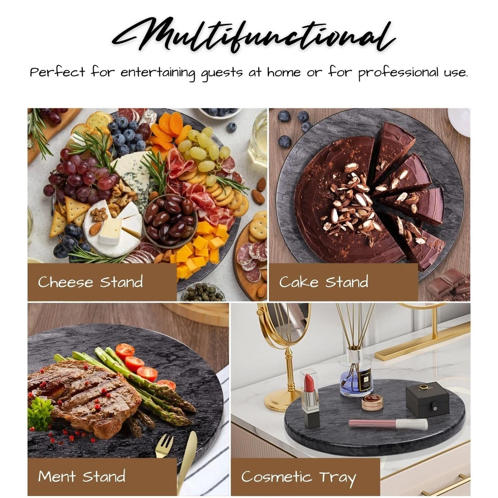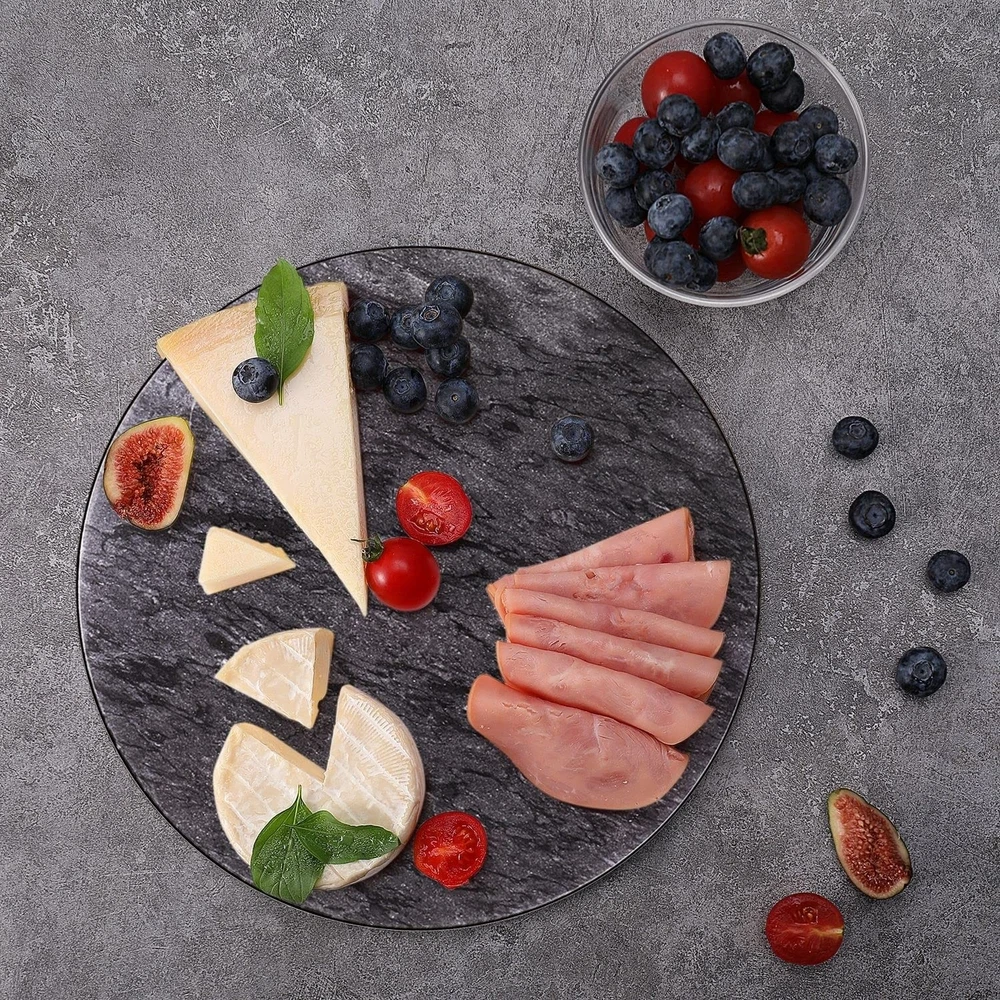 Serve your sweet and savory choice with our charcuterie board, and achieve an effortless presentation that brings everything together. Typically, a charcuterie board includes a variety of cured meats and cheeses, such as salami, prosciutto, Brie, and Gouda, in addition to additional small bites like hummus, jam, bread, honey, fruit, and edible flowers. The wonderful thing about a platter of ready-to-eat finger foods is that you can put one together without needing a lot of culinary expertise. However, it can take some experience to get the presentation just right. With our marble charcuterie board, you can show friends and family your charcuterie with a mouth-watering display and a touch of class. Each cheese board marble has a unique design because of the natural grains of marble, making each piece one-of-a-kind. The simple and beautiful design will look great on your table, coffee table, or countertop. This marble pastry board is easy to clean. When finished, you can wipe it with a damp towel or hand wash it with soap and water. Specification: Material: Marble Diameter: 12 inch Weight: 9 lbs (4.1kg) Package Content: 1x Round Marble Cheese Board - 12 Inch Black Marble Serving Board for Charcuterie, Cheese, Cutting, Pastry, Trivet - Non-Stick and Heat Resistant Marble Board Round Cheese Board - Beautiful and elegant 12-inch round marble serving board. Displays your charcuterie with class, perfect for displaying bite-sized bread, jam, fruits, cured meats, brie, and gouda cheese Pure Marble - Round cheese board in cool marble adds a touch of class to your table and counter. Can also be heated up to 200-degree Fahrenheit to keep food warm. Each board is unique due to natural grains of marble Elegant & Functional Serving Platter - Exceptionally smooth surface, great for parties or gatherings. Can be used as a serving platter, cutting board, or cake stand. Features non-slip rubber feet to keep the board in place Convenient to Use - Excellent at holding temperatures cold and warm for perching food. Offers a nifty surface to store cheese, chocolates, or meat. The Marble board will not absorb food smells Easy to Clean - with a Non-porous surface to prevent food from sticking to the marble trivet. To clean, gently hand wash with soap and water. Wipe down excess moisture before storing