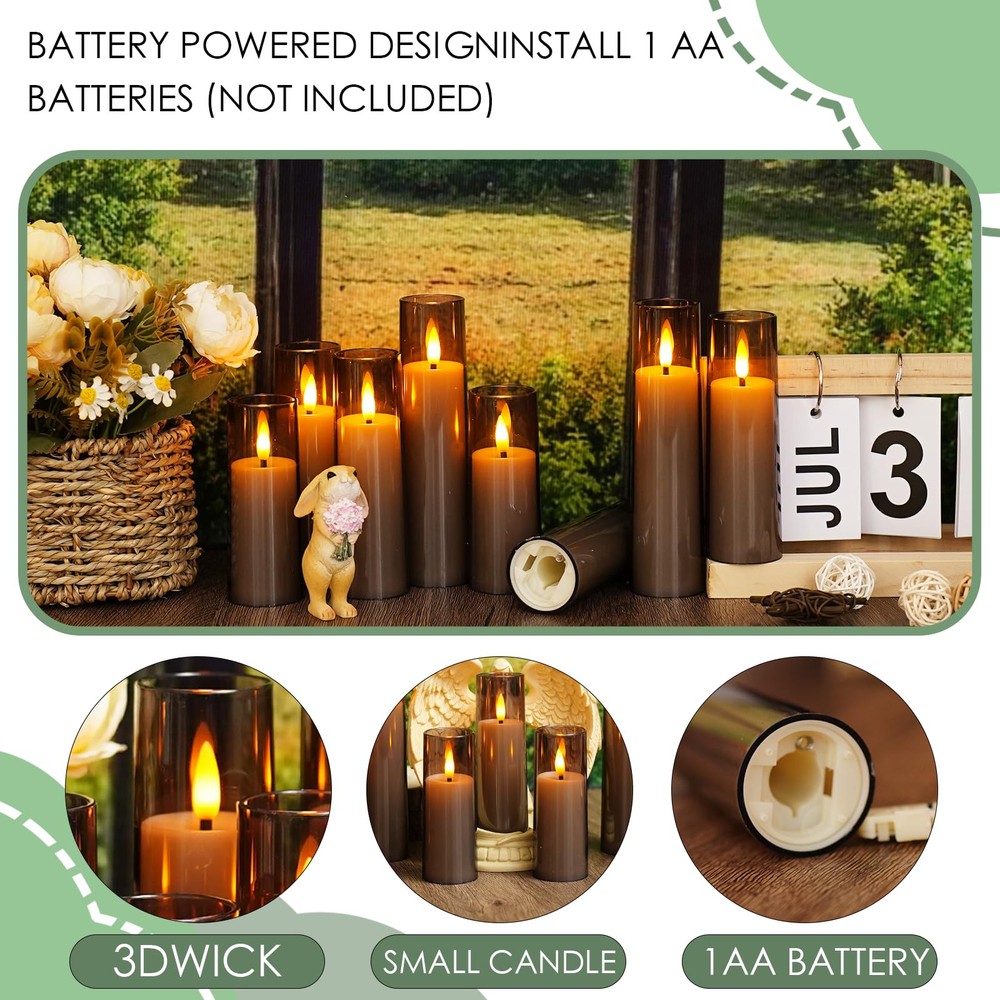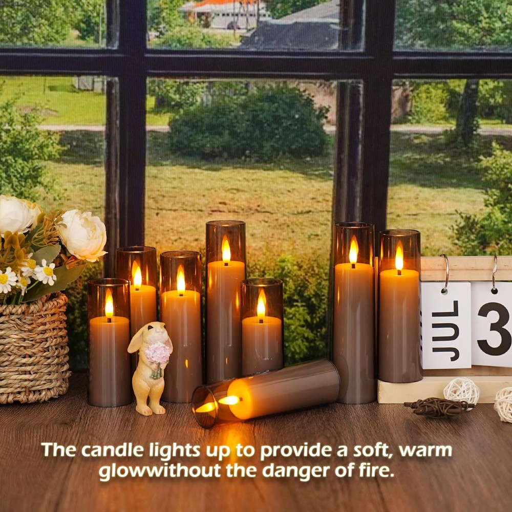 DESIGN FEATURES:Flameless candles cleverly combine beauty and safety. Made of high-quality materials, flameless candles mimic the appearance and flame beating effect of real candles, which can be perfectly integrated into a variety of home décor, ideal for both fashion and practicality. Multi-scenario use:Flameless candles are ideal for creating a cosy atmosphere, whether at a family gathering, a romantic dinner, or a festive celebration, they add a soft glow to your space!Whether placed on a dining table, windowsill or as a festive decoration, they add a unique touch of glamour to your life! Convenient Remote Control: battery operated candles With a 10-key remote, you can easily turn the candles on/off, adjust brightness levels, and set a timer for automatic illumination for 2, 4, 6, or 8 hours each day. Safe and Worry-Free: Eliminating the risk of smoke, Flameless candles have no open flames, reducing the risk of fire and are particularly suitable for home environments with children or pets. pets. No Risk Guarantee: Each flameless candle is thoroughly and rigorously tested by and ensures that they can be used out of the box. Please click "Contact Seller" to let us know if you have any problems after purchasing our LED candles. Our customer service team will serve you 24 hours a day! No Risk Guarantee: Each flameless candle is thoroughly and rigorously tested by and ensures that they can be used out of the box. Please click "Contact Seller" to let us know if you have any problems after purchasing our LED candles. Our customer service team will serve you 24 hours a day!