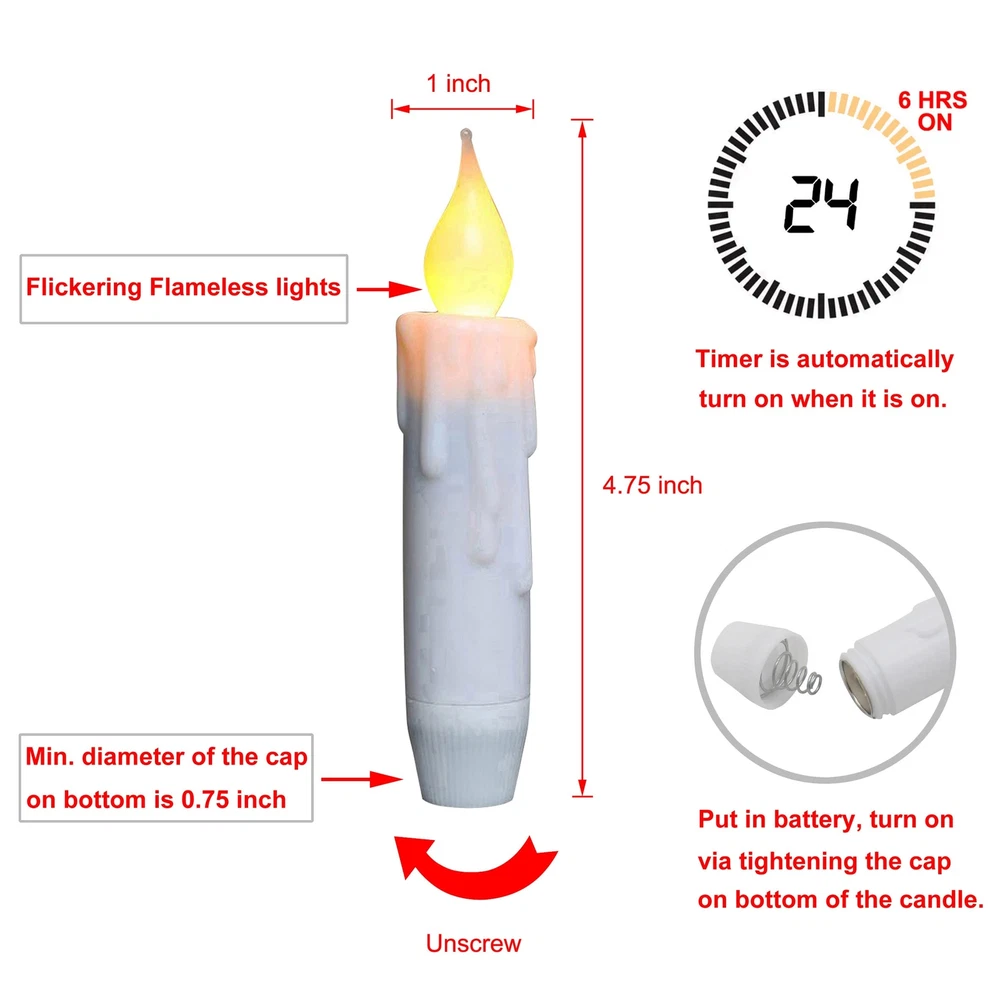 CVHOMEDECO. Flickering Taper Candles LED Drip Flameless Candles, Battery Operated with Timer, White, 4-3/4 Inch, Set of 2 The measurement of flameless candle is 4.75"H x 1"Diameter, 2 PCS in a Set Each battery operated candle uses 1 AA batteries ( Not included ), tighten or loose the cap on bottom of the battery operated candles for ON/OFF, timer setting the candle to stay on for 6 hours and then go off for 18 hours The base of flameless candles is tapered, perfectly fit any standard taper holder and taper accessories The farmhouse tapers candle use as a decorative accent piece for countertop, tables, shelves, walls, windows, candlesticks or any room. You're sure to find lots of uses for these charming handmade candles, whether you adorn a room, use as accents piece for any crafts projects or make them to your gifts. Primitive rustic flickering candlelight, offers a softly and warm light. Perfect for home decor, holiday décor, Christmas decor, Thanksgiving present, Halloween decor, New Year, Valentine's Day, dinner parties, weddings decor, birthday party, churches, candle light vigils, floral arrangements, wreath, DIY project, other festival celebrate and more Shipping We offer FREE shipping on all orders! We ship within Three business days of payment, usually sooner. We use a selection of shipping services such as UPS, FedEx, USPS etc. We only ship to the lower 48 states, no APO/FPO addresses or PO Boxes allowed. Local pickups and combined shipping options are not provided at this time. International buyers – please note: Import duties, taxes, and charges aren't included in the item price or postage cost. These charges are the buyer's responsibility. Please check with your country's customs office to determine what these additional costs will be prior to bidding or buying. Order Cancellation Policy * Order Cancellation Policy ** You can return a product for up to 30 days from the date you purchased it. 1. The seller reserves the right to cancel the special case only due to eBay cancellation fee. 2. The decision of seller is the final. 3. The seller will respond to the cancellation request within 2 business days. Please wait for the result of cancellation. 4. In case the cancellation is not completed by some reasons, the buyer can follow the options below to get the refund. 4.1 The buyer can reject the item when it arrives. 4.2 The buyer can send the item back to the seller within 30 days If the buyer receives item (USA Shipment ONLY). The seller will provide the FREE return label to the buyer when the buyer opens " Return Item" case on eBay by using the reason as "Change my mind" ONLY. 5. When buyer has placed the order. The order will be processed and completed by automatic warehouse system within 5 minutes. In case that buyer sends the cancellation request after 5 minutes of placing the order, the request will be rejected. **Sending direct message to cancel the order is not allowed for every case.* Return Policy - If buyer would like to return the items for refund or replacement, please CONTACT SELLER to receive the free return label from seller. The refund or replacement will be processed with the tracking number of return label which is provided by seller only. The other ways of return which are not approved by seller will not be processed for the refund or replacement. Return You can return a product for up to 30 days from the date you purchased it. Any product you return must be in the same condition you received it and in the original packaging. Please keep the receipt. Payment We accept payment by any of the following methods: eBay Payments Please pay as soon as possible after winning an auction, as that will allow us to post your item to you sooner! Feedback Customer satisfaction is very important to us. If you have any problem with your order, please contact us and we will do our best to make you satisfied. Contact Us If you have any queries, please contact us via ebay. We usually respond within 24 hours on weekdays. Please visit our eBay store to check out other items for sale! Thank you for shopping at our store.