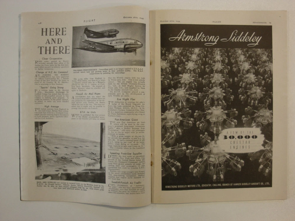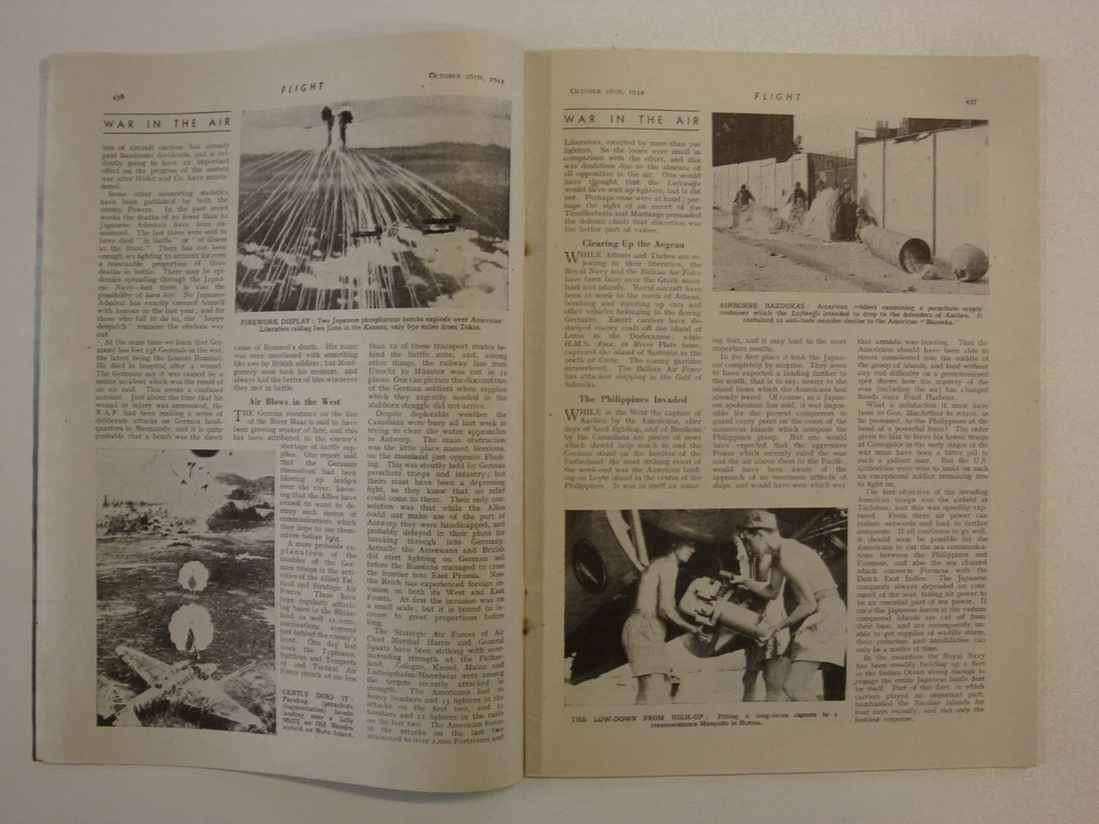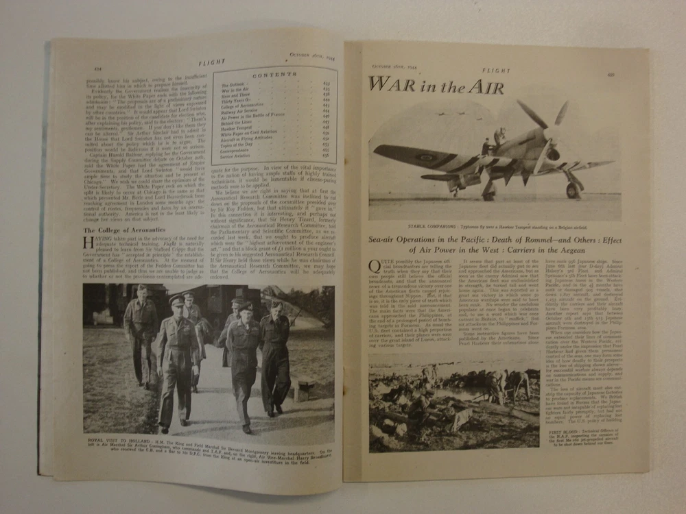 Please read item description FLIGHT AND AIRCRAFT ENGINEER (October 26 th 1944) The magazine published for the serious aero enthusiast and the official organ of the Royal Aero Club. Packed with technical and specification data and well illustrated with photographs and drawings throughout. Front cover: Advert: Lightweight Tapered Roller Bearings In this issue: The Outlook (With air help and without, British air policy, The college of aeronautics plus a photograph of the King and Field Marshal Sir Bernard Montgomery on a visit to Holland) War In The Air (Sea-air operations in the Pacific, Death of Rommel – and others, Effect of air power in the West, Carriers in the Aegean, , The Philippines invaded. Includes photographs of a Hawker Tempest on a Belgian airfield, Japanese phosphorous bombs exploding over American Liberators, Parafrag bombs landing amongst Japanese aircraft and a camera being fitted to a reconnaissance Mosquito in Burma) Here And There (Closer co-operation, “Squirts” going strong, Finnish air mail hopes, Eire night flier, Pan-American giant, Speeding front-line supplies, Swedish-Finnish air traffic, Back to “Fighter Command”, To speak for South Africa plus a photograph of a Sikorsky helicopter carrying out air-sea-rescue trials) Thirty Years On – No 201 Squadron Holds A Birthday Celebration (A 3-page historical review of the first Royal Naval Air Service Squadron. Well illustrated with photographs of the Bristol Scout, the Short Sunderland, the Avro 504K, the Henry Farman, the Maurice Farman, the Curtiss J.N.4, the Morane Parasol, a Vickers F.B.19, the Nieuport, the Nieuhawk, the Sopwith Camel, the Sopwith Triplane, a Supermarine Southampton [x2] and the Saro London) Railway Air Services – Proposed Scheme Put Forward By The Combined Railway Companies (Aircraft and time-table. A 2-page article with a revolutionary proposition for travel within Europe) Air Power In The Battle Of France – Farewell Summary By Air Chief Marshal Sir T. Leigh-Mallory (Great days, Supply and evacuation) Behind The Lines – Service And Industrial News From The Inside Of Axis And Enemy-Occupied Countries (Jap A.A., Goering tightens black-out, Germany’s loss, Flying bomb from Norway, The victory weapon, New Recce car, Luftwaffe Aces, A Nazi report, New German weapon, Sub-contractors, Labour engineers) Hawker Tempest (A double-page photo-montage of the aircraft in flight together with a 3-view silhouette drawing) White Paper On Civil Aviation (A 2-page review and discussion concerning the proposed government policy on post war aviation. General principles for post-war, New air convention, , The international machinery, Questions and answers, Never discussed, Making no promises) Aircraft In Flying Attitudes (A one-page article illustrating an aircraft in silhouette form together with a small photograph of the aircraft and a descriptive text. The aircraft in this study is the Vultee Valiant [BT-13] trainer and is compared against the North American Harvard) Tomorrow’s Light Aircraft – II (Tail-down visibility, Reflections and focus, Comfort or people?, Flying instruments, Starting up) Service Aviation – Royal Air Force And Fleet Air Arm News And Announcements (Includes excellent photographs of pilots and their Tempests on a Belgian airfield, a Tetrarch light tank being driven off a Hamilcar glider, An RAF Liberator in India and a 12,000lb bomb being loaded into a Lancaster III) plus more including adverts for Sperry Aircraft Precision Instruments, Desoutter, the Lockheed Constellation, Blackburn Cirrus Engines, the Fairey Barracuda, Armstrong Siddeley Cheetah Engines, the DH Dragon Rapide, Gloster Aircraft, Schrader Airline Equipment, the General Aircraft Hamilcar, Airspeed, Black and Decker Portable Electric Tools and the Bristol Beaufighter The front cover page shows minor wear to the edges and the staples are rusted, which is typical of the low grade material used during and immediately after the war, however they remain sound and hold all pages securely. All pages are present and free from tears and significant marks although the pages do display some age discolouration as is typically found on newsprint of this age. This magazine is in very good overall condition considering its age. IMPORTANT NOTICE FOR MULTIPLE WINNING BIDS If you are planning further bids I allow payment to be held for up to 22 days. Should you win more than one item please request a combined invoice BEFORE payment in order that the most economical postage can be offered.
