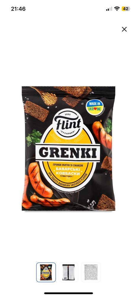 Flint rye croutons with "Bavarian sausages" flavor are a crispy and aromatic snack made on the basis of rye and wheat flour. They are roasted in refined deodorized sunflower oil, which provides their appetizing crunch. A complex food additive with the taste of "Bavarian sausages" gives croutons a rich meat aroma with spicy notes. These croutons are ideal as a quick appetizer to beer, an addition to soups (especially cream soups and gazpacho) or as a component for salads where a crispy element is needed. Thanks to the convenient 100 g package and moderate calorie content, they are a great choice for a snack on the go. Advantages Rich taste of "Bavarian sausages" - spicy and meaty aroma, ideal for drinks; Nutrient composition - made from rye and wheat flour; Crispy texture — thanks to roasting in refined sunflower oil; Convenient 100 g packaging - ideal for a quick snack; Versatility - suitable as a snack, as well as an addition to soups and salads. Storage and use Flint rye croutons should be stored in a dry, cool place at a temperature of up to +30°C. The product is completely ready for use and does not require additional processing. After opening the package, it is recommended to use the croutons as soon as possible so that they do not lose their crispy texture. Warehouse Bread (rye flour 40%, water, wheat flour 17%, glucose syrup, rye malt extract, salt, pressed yeast, coriander), refined deodorized sunflower oil, complex food additive "Bavarian sausages" 6.5% (table salt, crystalline glucose, sugar, flavor and aroma enhancers (sodium glutamate, disodium 5'-guanilate, disodium 5-inosinate), flavors, anti-caking agent (silicon dioxide, amorphous), dyes (paprika extract, Ponso 4R)) Fats 8.3 g/100 g Carbohydrates 72.6 g/100 g Squirrels 9.7 g/100g Calories kcal 403.9 kcal/100g Humidity Up to 75% Shelf life of goods 180 Storage temperature Up to +30 ºC * The US buyer doesn't need to pay any additional charges as the seller offers to ship this item with DDP. * Characteristics and equipment can be changed by the manufacturer * The color of the product may differ due to monitor settings * Packaging may differ from the picture * Free shipping to the US and Europe. * To other countries, additional shipping charges may apply. Please contact us for pricing.