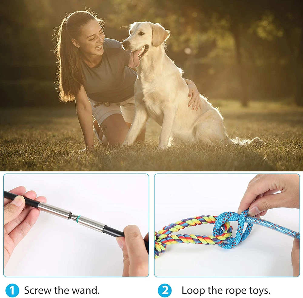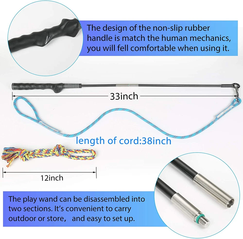 🐶【Great Flirt Pole for Dogs 】- The interactive flirt pole dog toy is one of the best training tool for realising the natual of your dog by Chasing and tug of war. Also this teaser flirt pole can promote mutual communication between you and your dog during the entertainment time. 🐶【Suitable Size for different dogs】- Length of holder: 33", length of cord: 38", length of rope: 12". The flirt teaser wand pole toy for dogs keeps you and your dog at a suitable distance, attracts the dog to chase and run which allows the dog has fully exercise. A good tug of war dog toy for you dogd. 🐶【High Quailty Material Interactive Dog Toys】- The training flirt stick of this tail teaser dog wand is made of 304 stainless steel material which is durable and can bear dogs’pull and tug. A stainless steel swivel eye snap hook connecting stick and cord make sure the nylon chord can rotate flexibly. 🐶【Easy to Store & Carry】- This pet teasing flirt pole can be disassembled into two sections. It’s convenient to carry outdoor or store at the conern without take up too much space. You need to tighten the spiral part between the two rods when use the teaser wand dog toy. The design of the non-slip rubber handle is match the human mechanics, you will fell comfortable when using it. 🐶【Multifunction Dog Rope Toys】- If you want to play intimately with your pet, removing the rope at the end of dog lure wand then useing it as an ordinary dog rope also is a good choice.Also you can use some other flirt pole replacements. Product Description The video showcases the product in use. The video guides you through product setup. The video compares multiple products. The video shows the product being unpacked. The video showcases the product in use. The video guides you through product setup. The video compares multiple products. The video shows the product being unpacked.