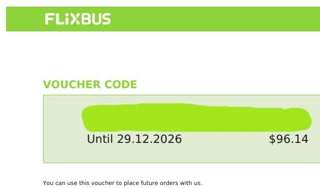 Selling a flixbus voucher with an electronic/digital voucher code - we ended up renting a car for an upcoming trip, so we aren't using this. I didn't realize the cancellation policy was not back to original payment method. Let my lack of reading fine print be your win!